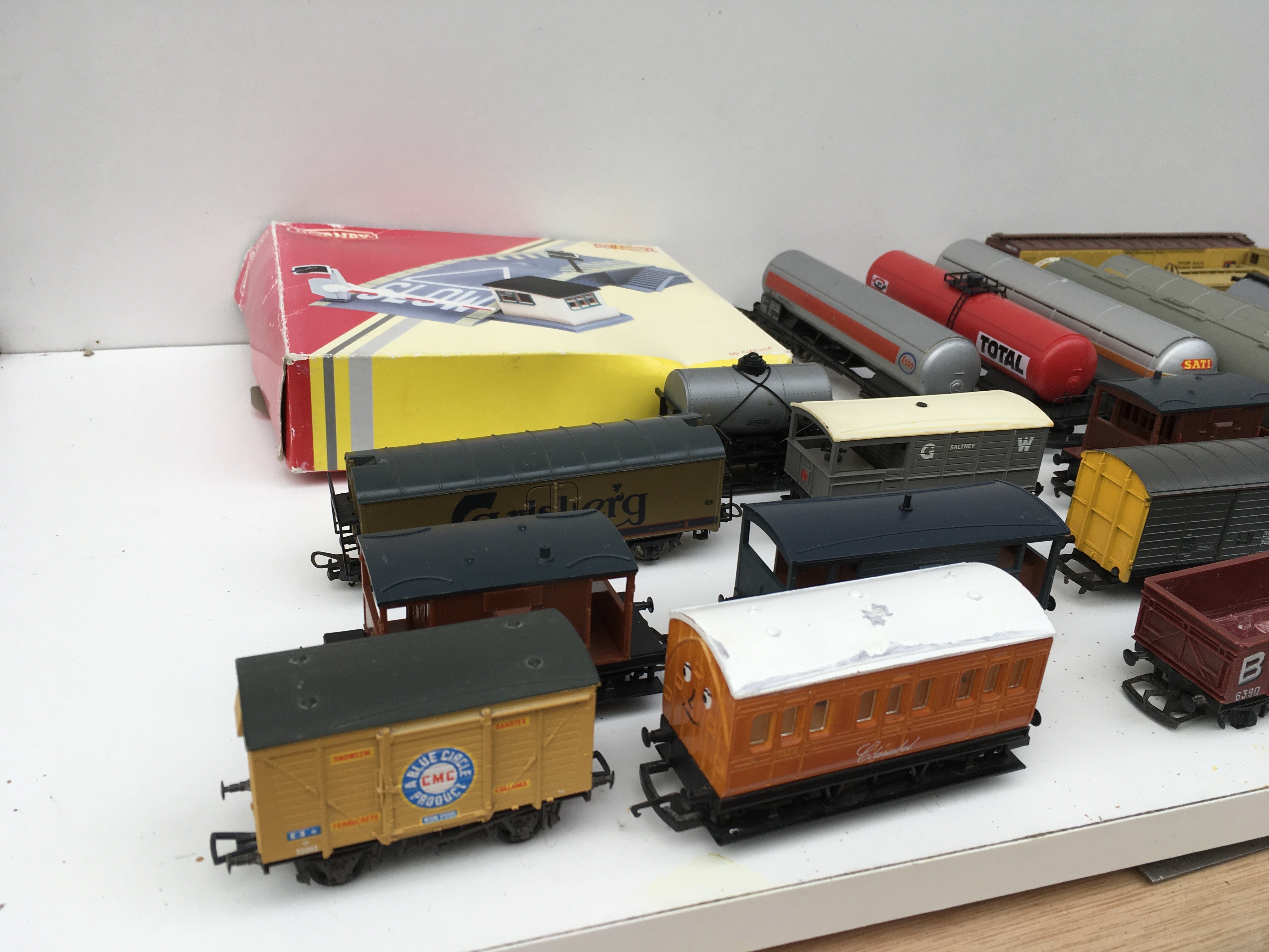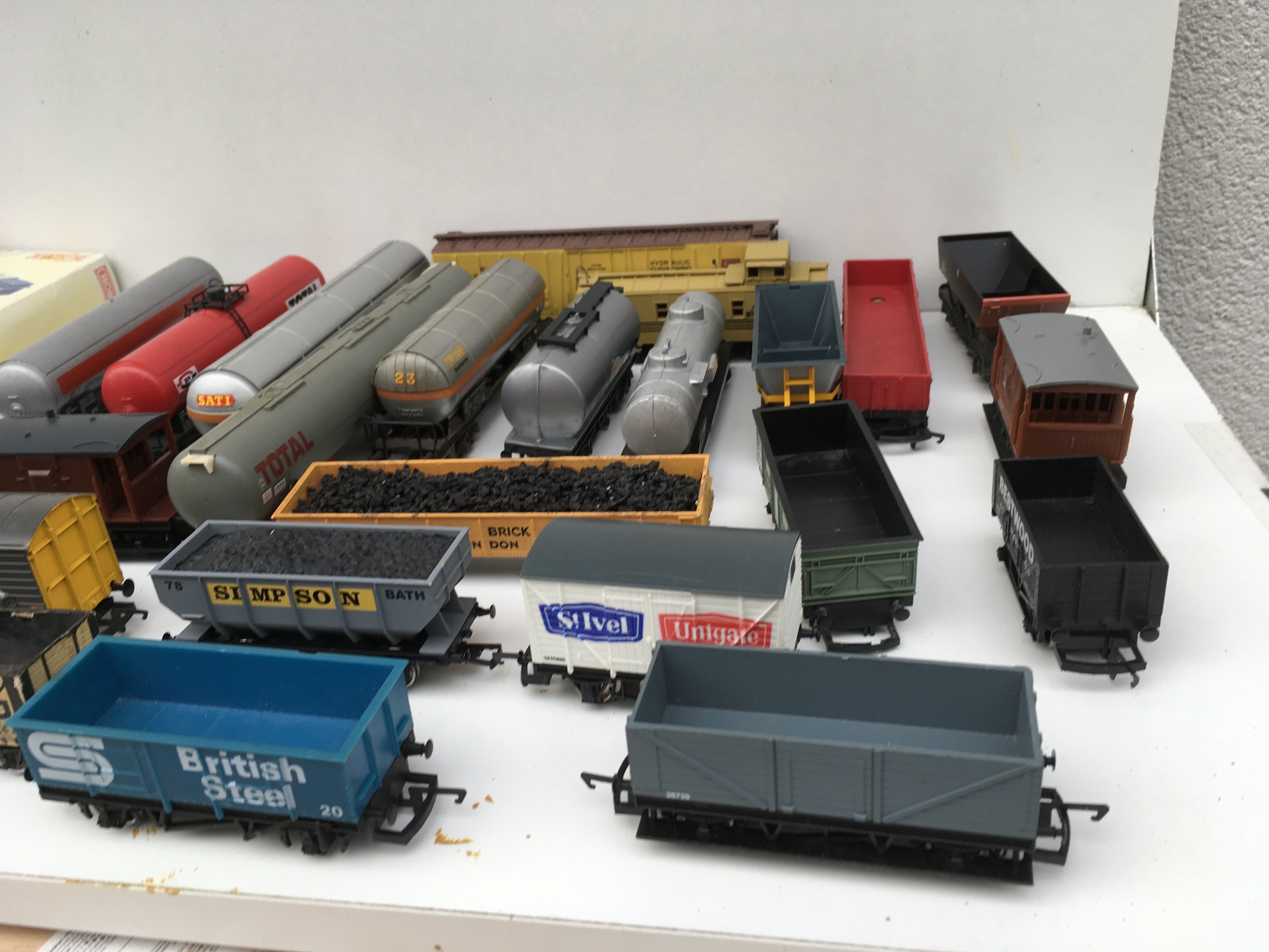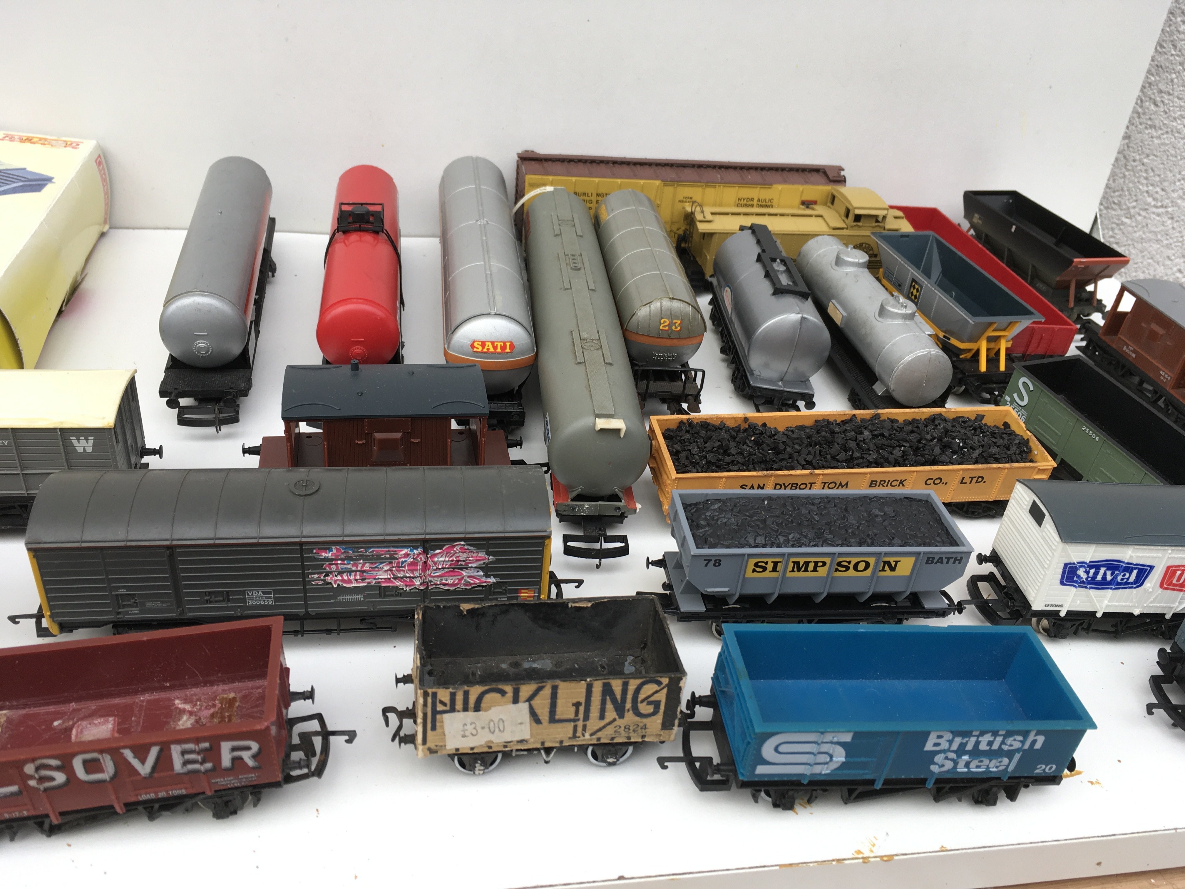 A collection in excess of 30 model railway wagons 00 gauge primarily by Hornby. Also includes boxed R8260 car loading ramp. No reserve