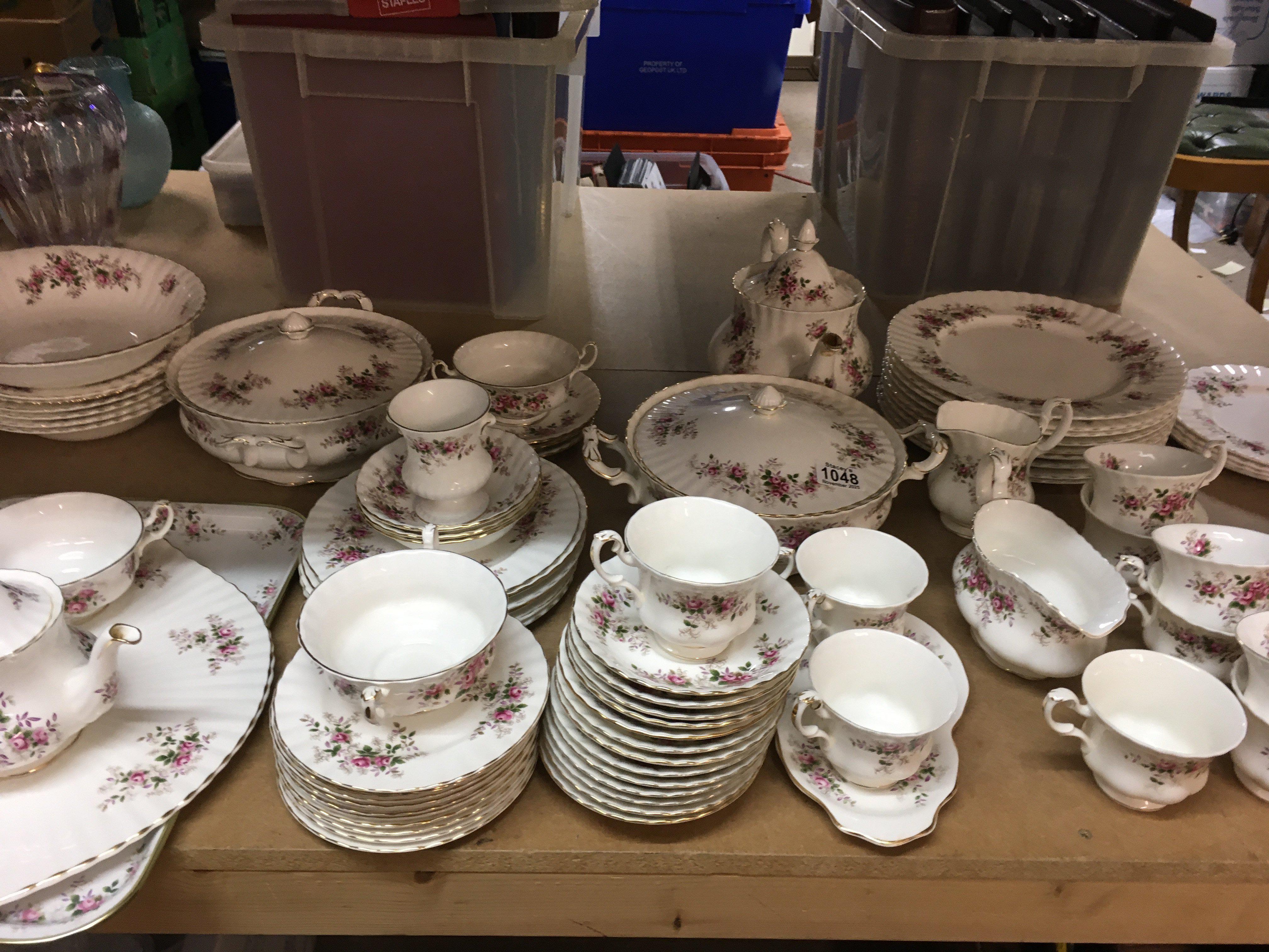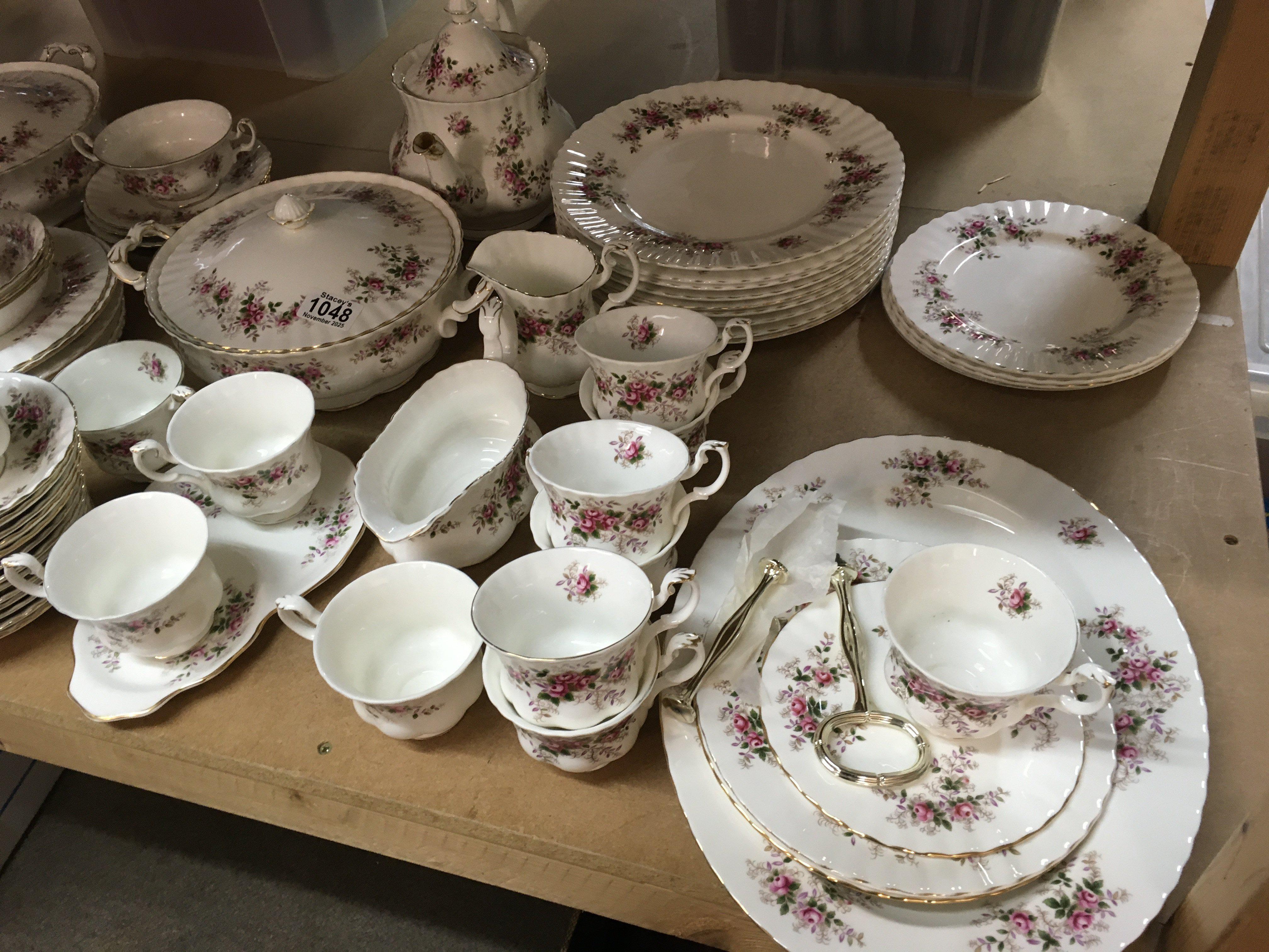A Royal Albert Lavender rose dinner tea set including tea cups saucers dinner plates serving plates tureens serving plates and bowls .