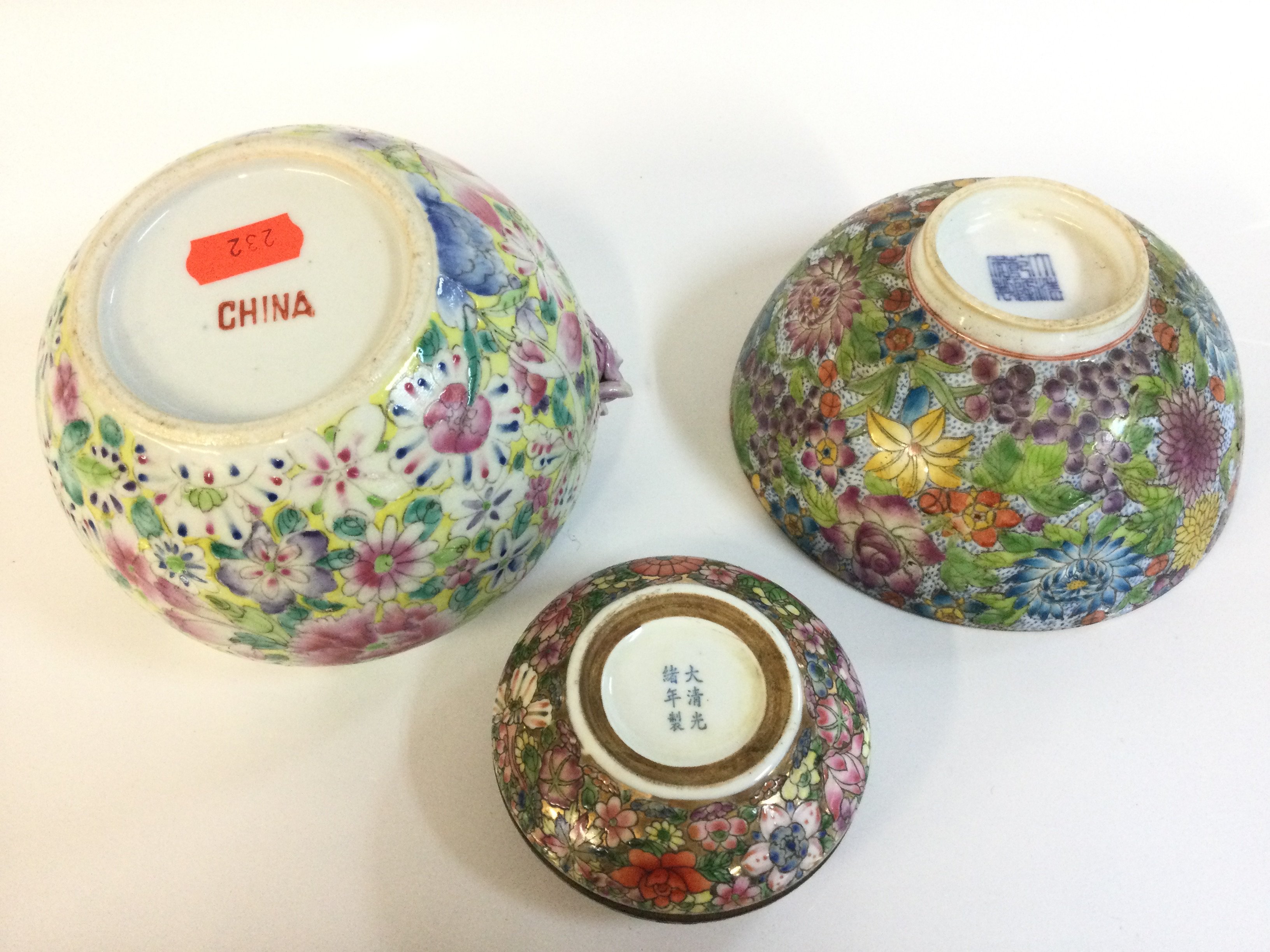 Chinese Mille Fleur ceramics including vase with dragon (11cm tall) , bowl (6.5cm tall) and trinket box with six character mark to base. (4cm tall) This lot cannot be posted