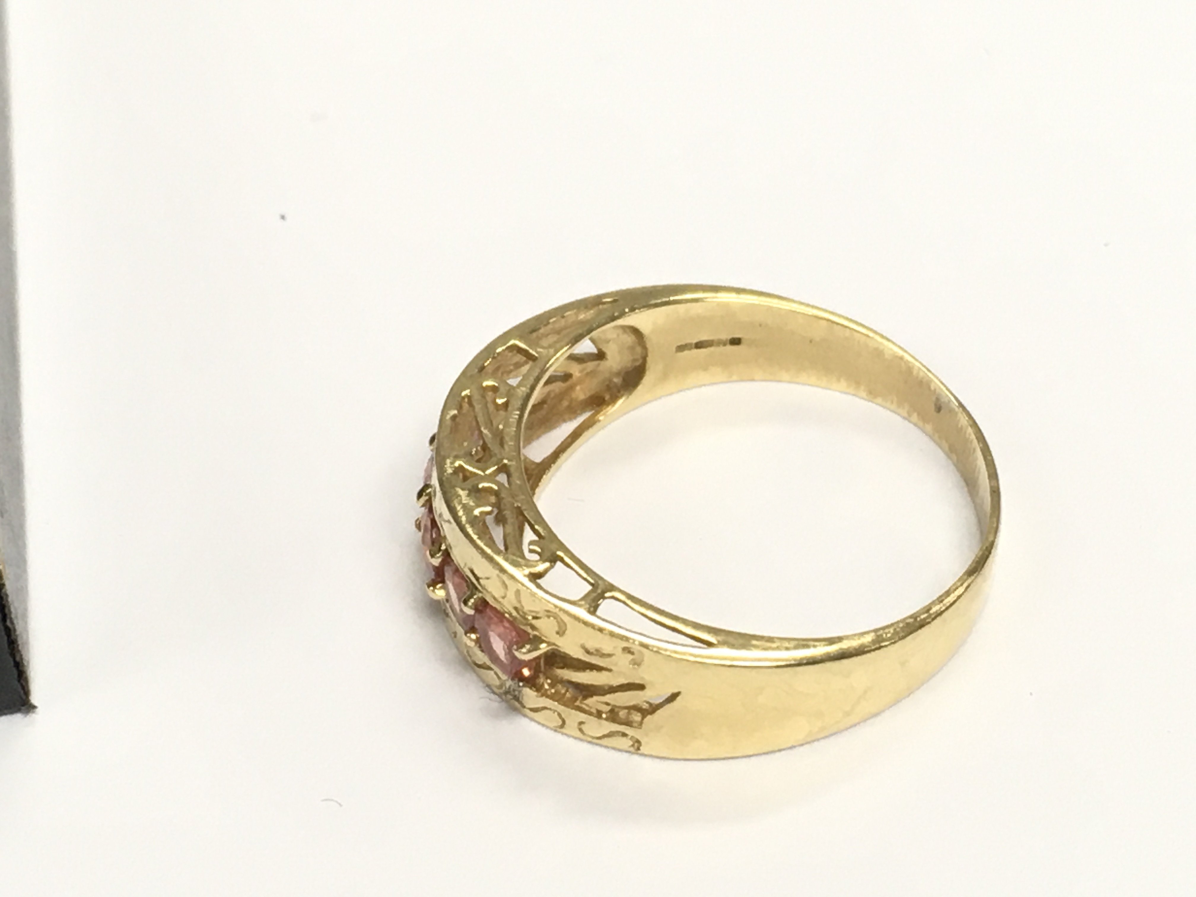 An 18ct gold ring set with pink stones size R and 5.17g and matching earrings.