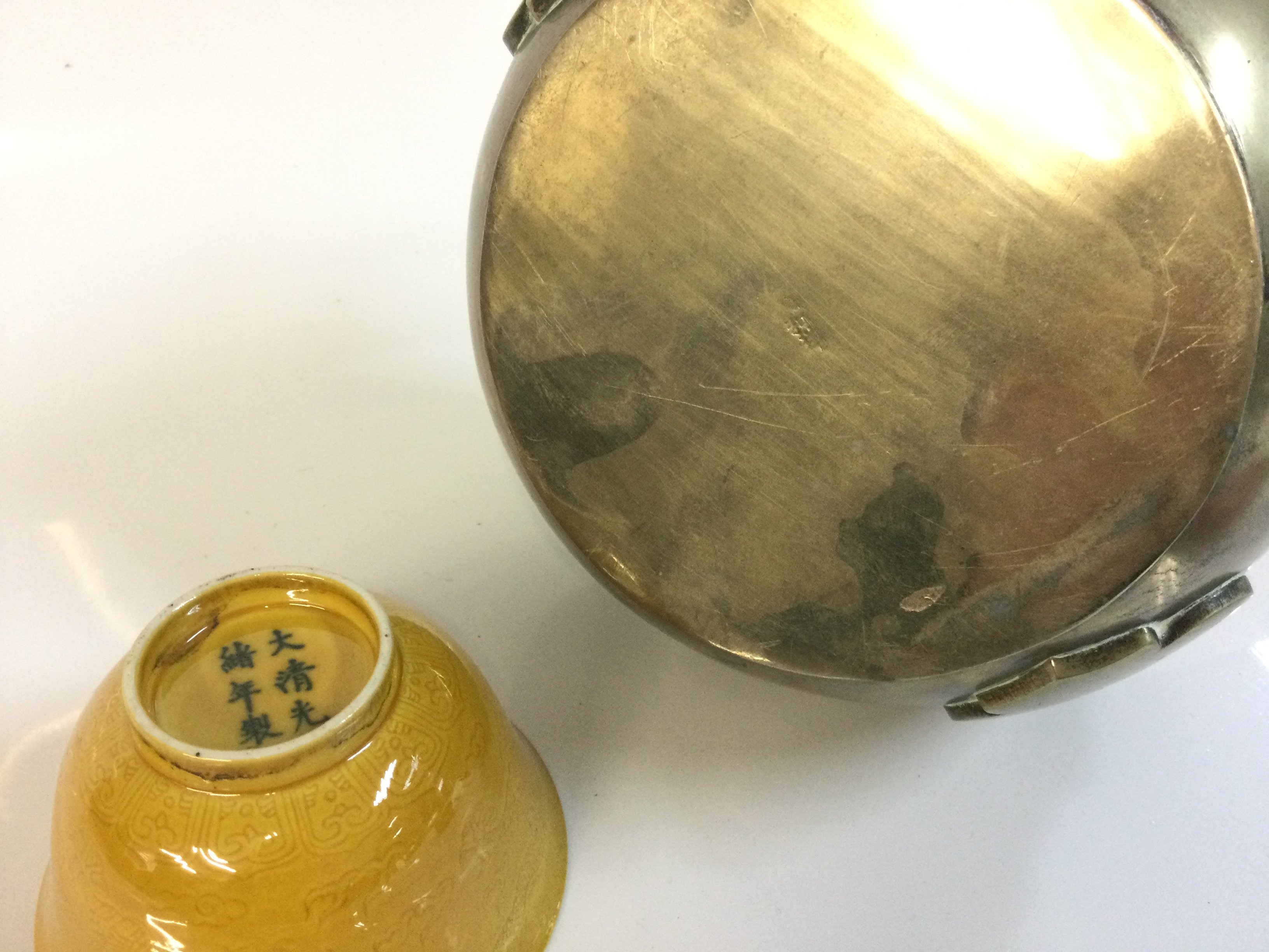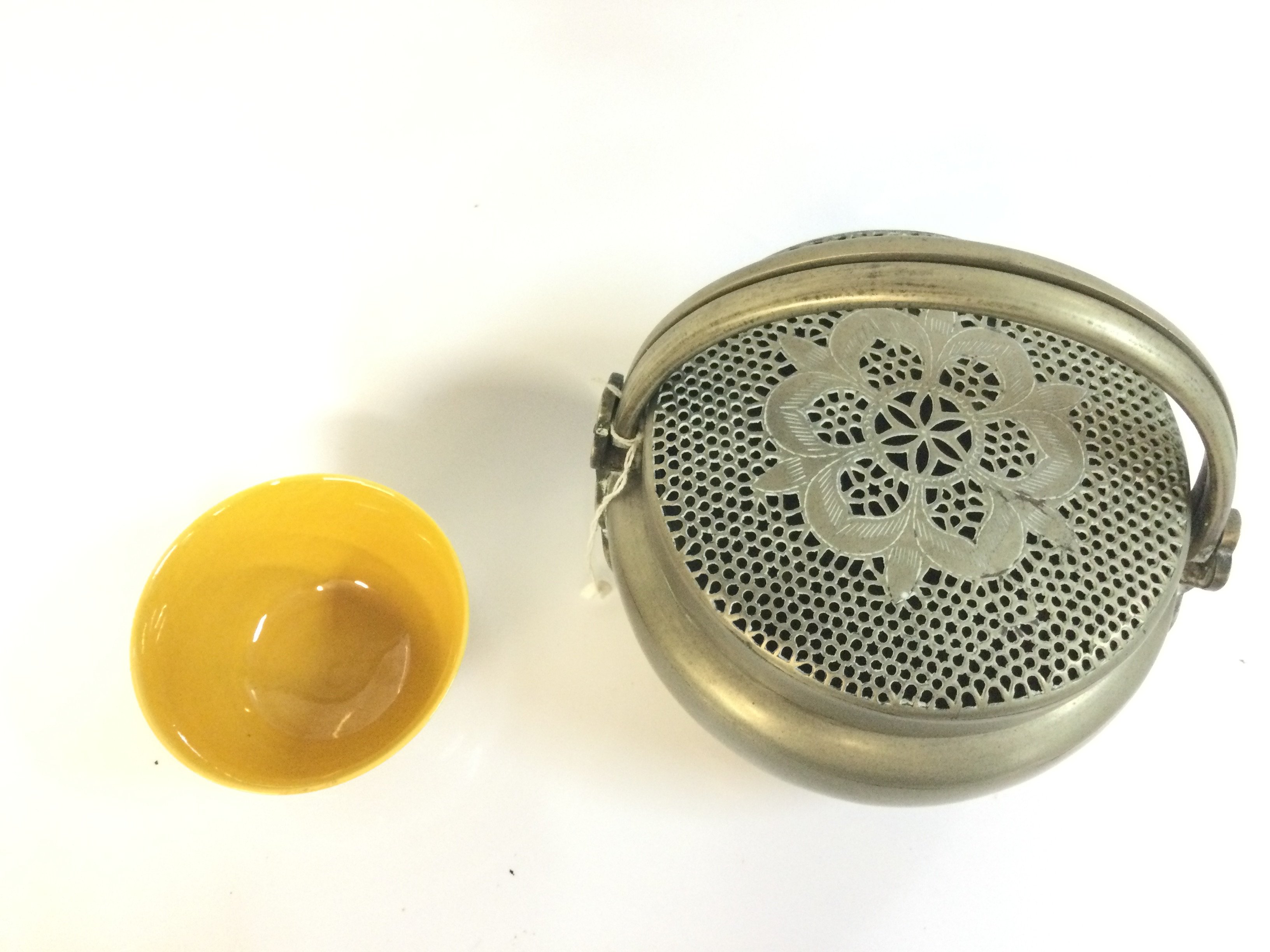 A Chinese hand warmer and a yellow glaze bowl. 5 and 15 cm tall. This lot cannot be posted