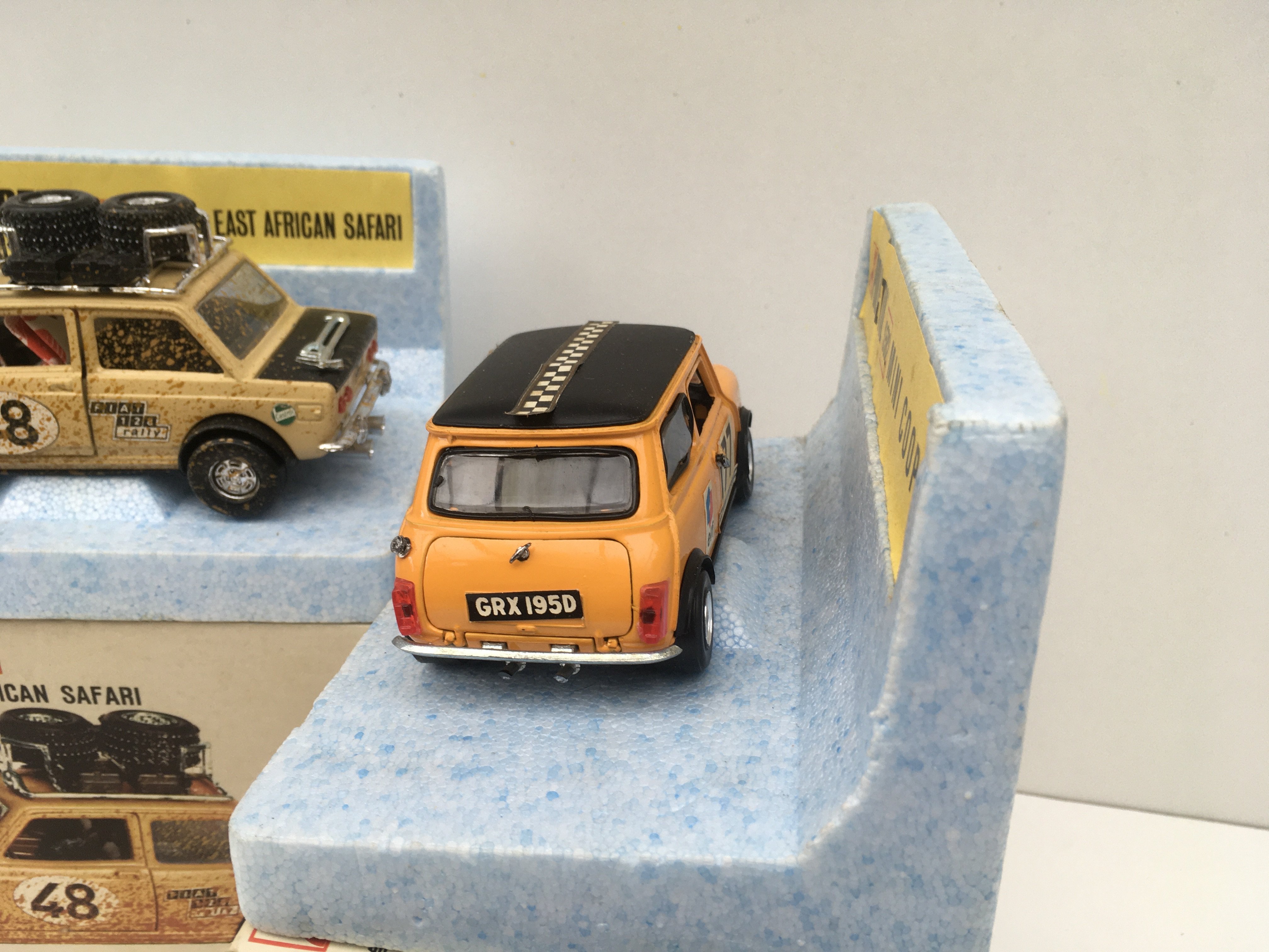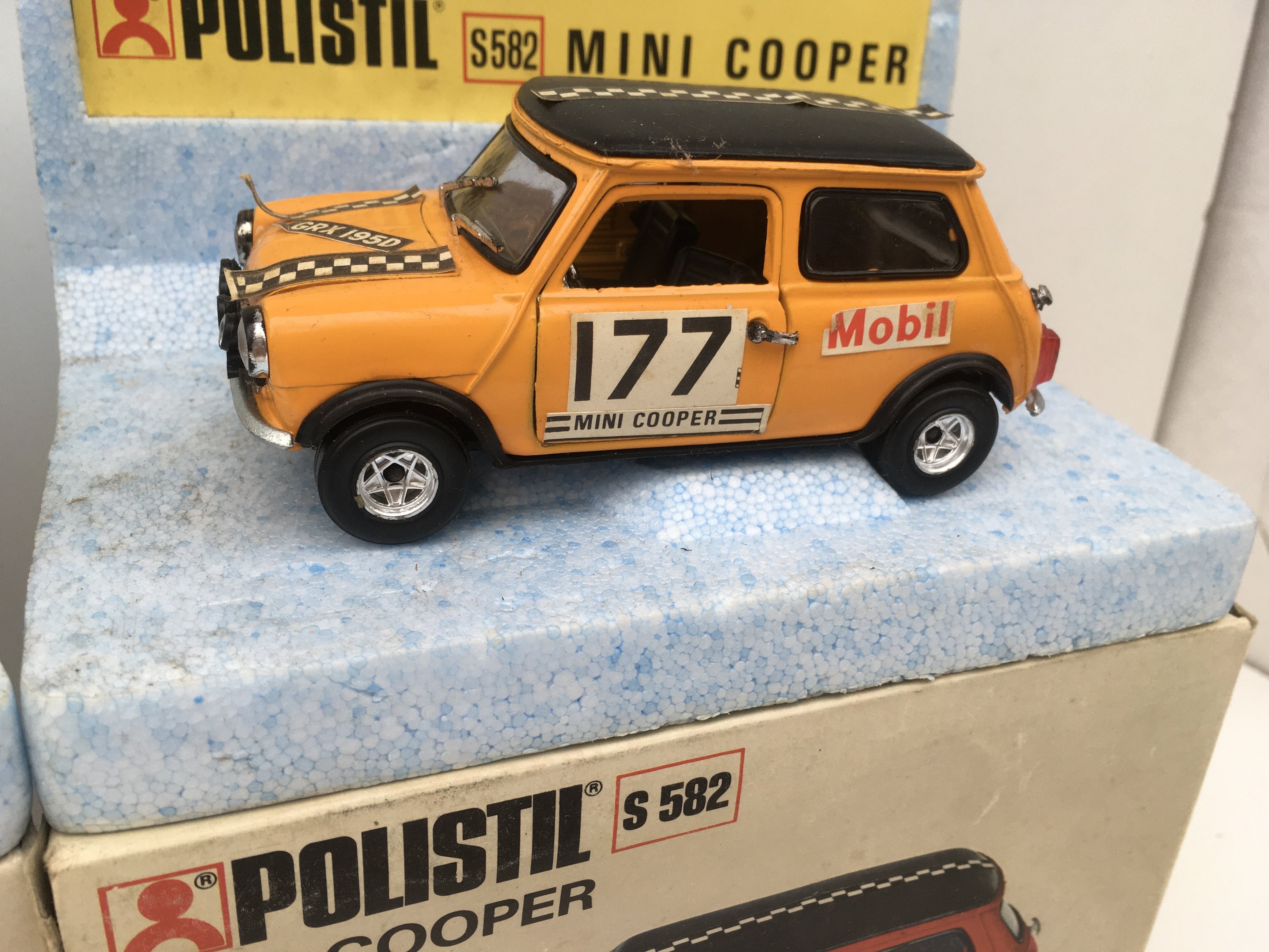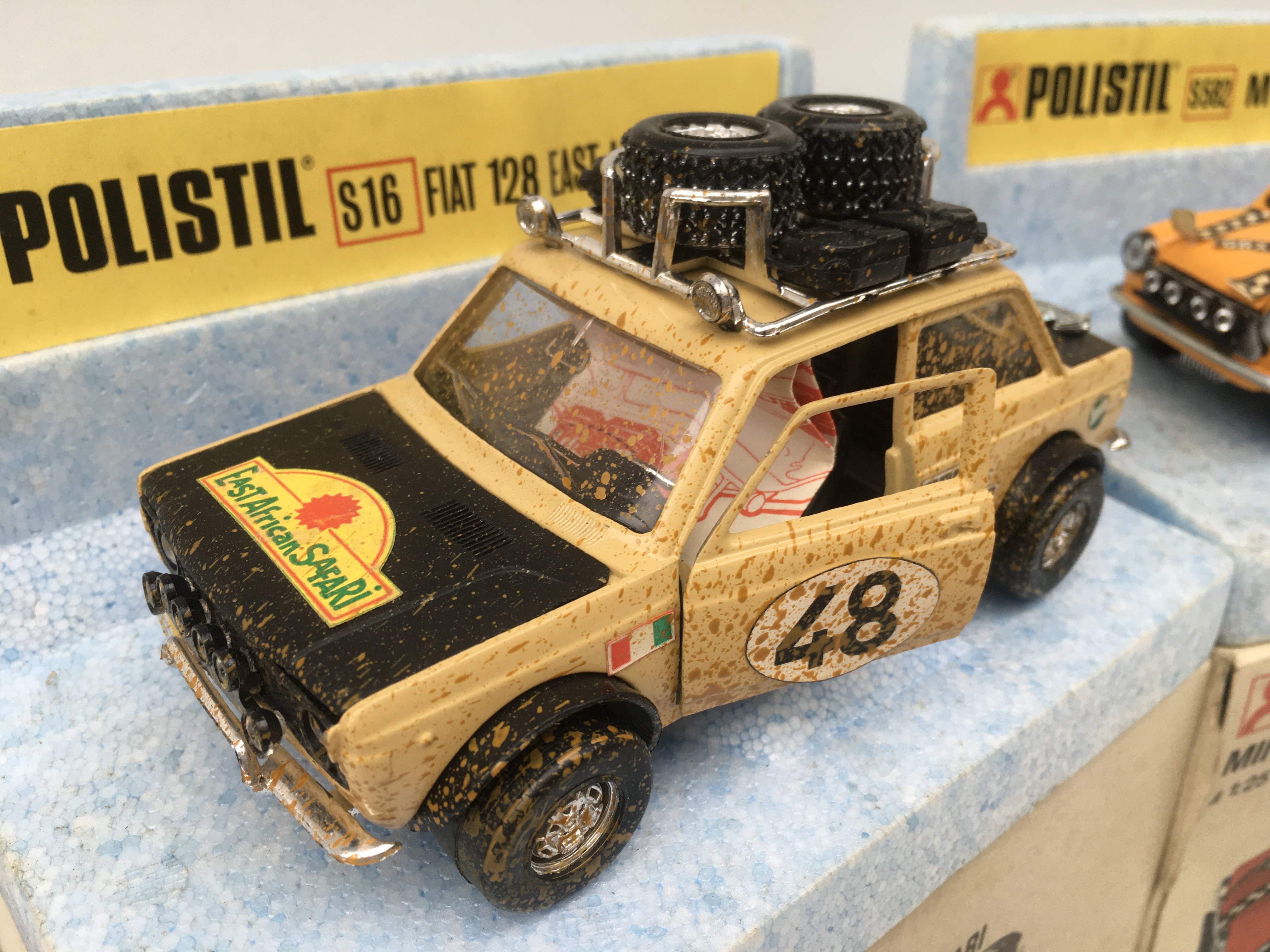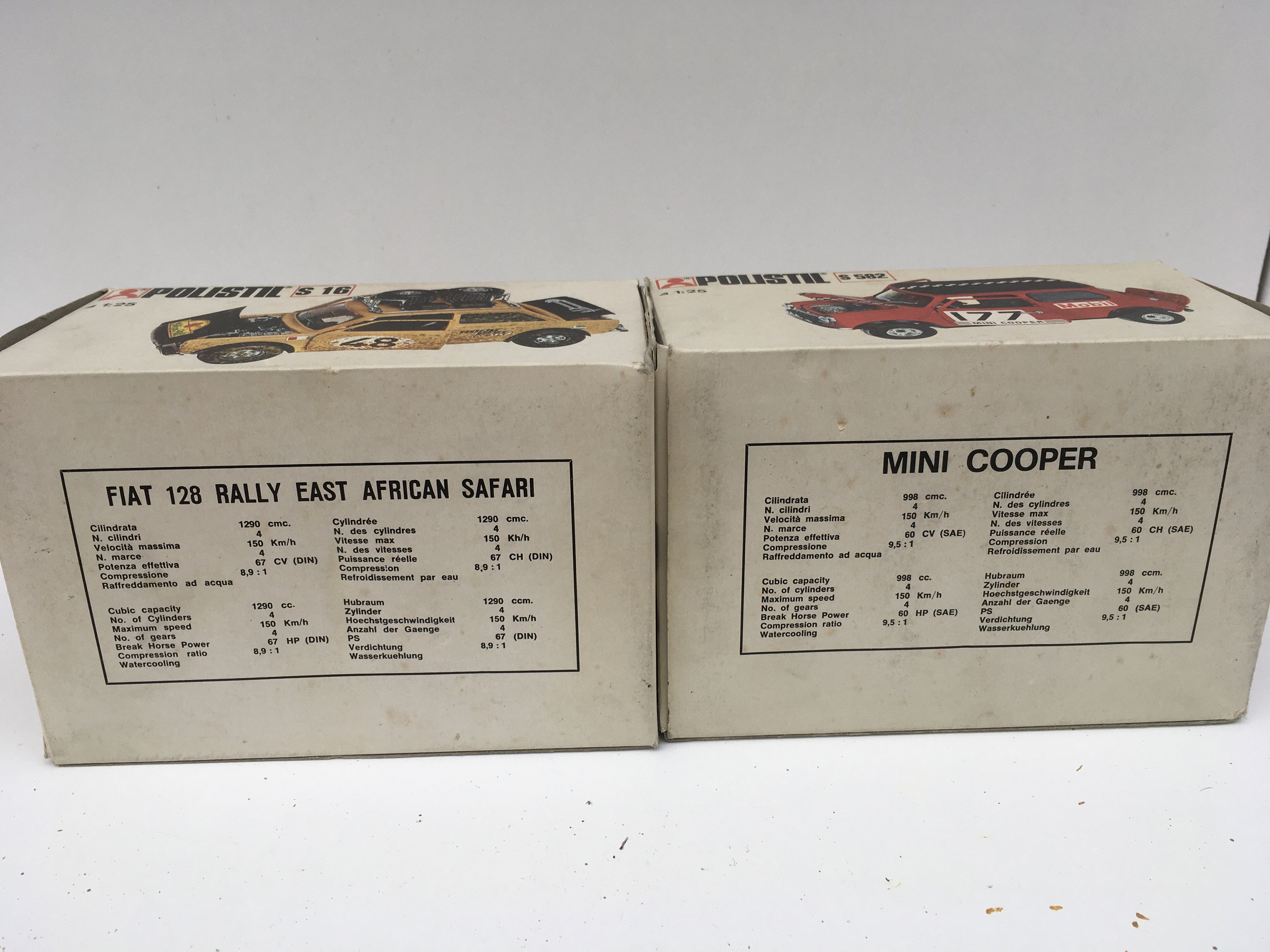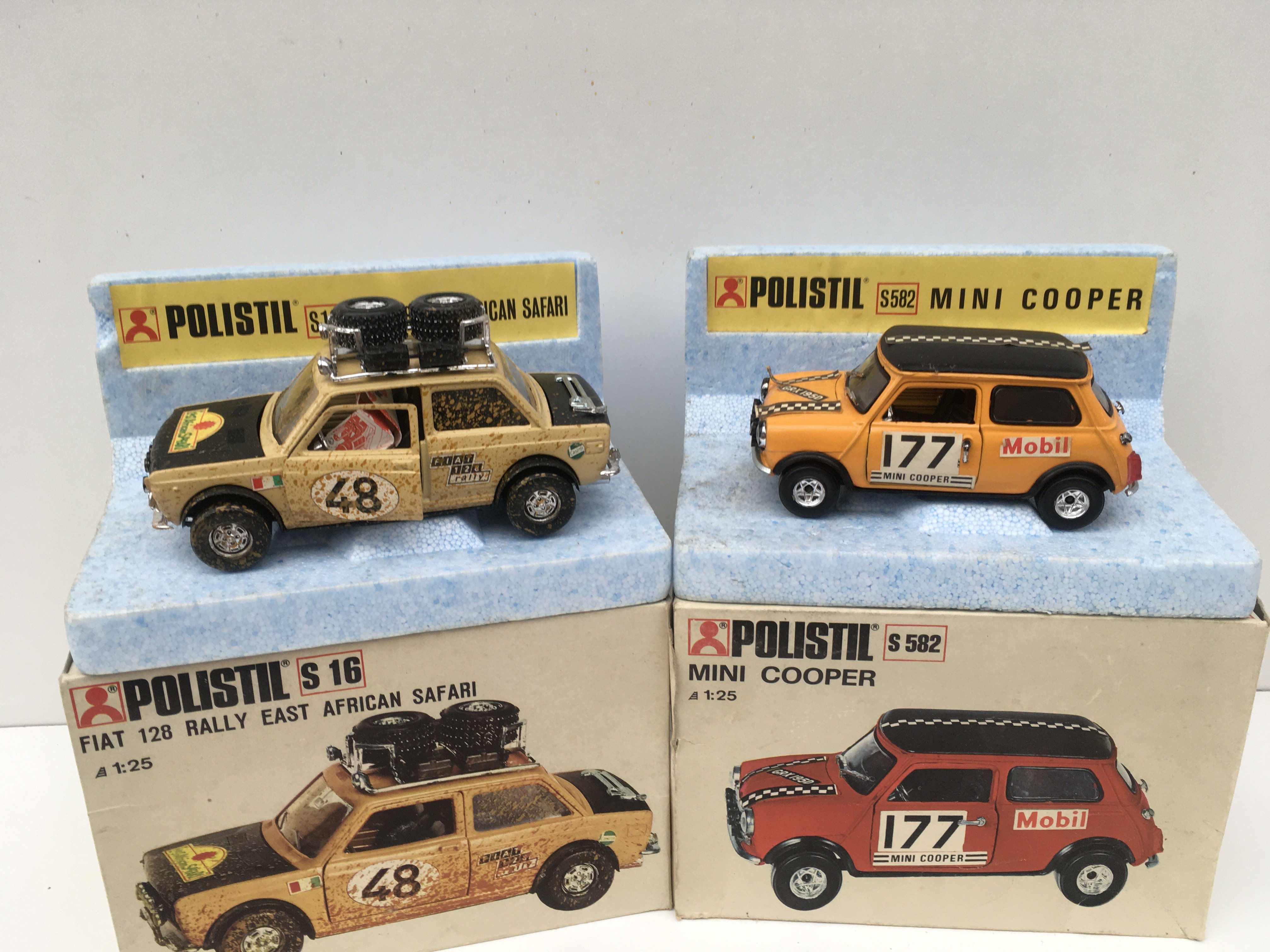 2x boxed model cars by Polistil 1.25 scale. Features S.16 Fiat 128 Rally East African Safari and S582 Mini Cooper 177. No reserve