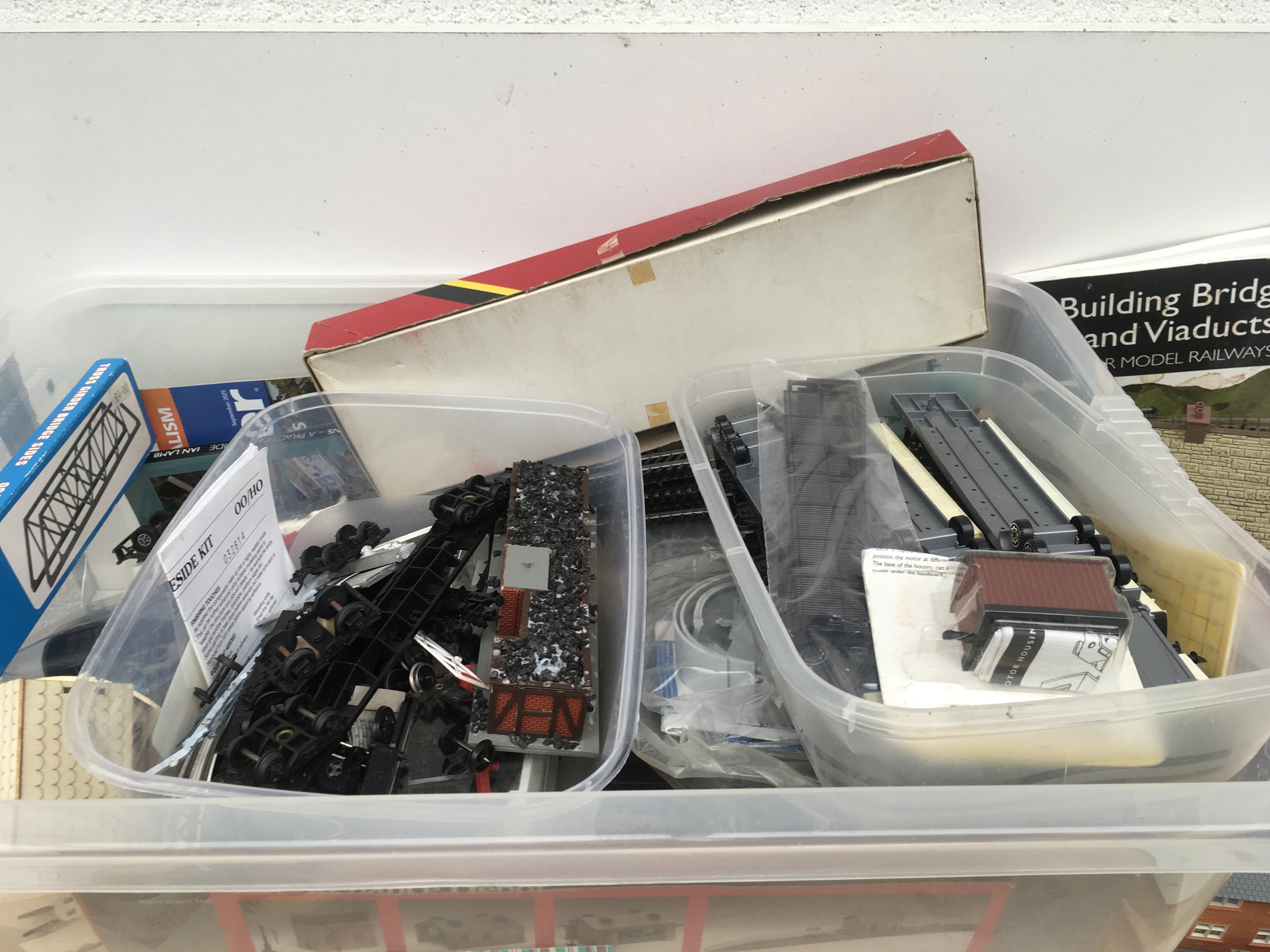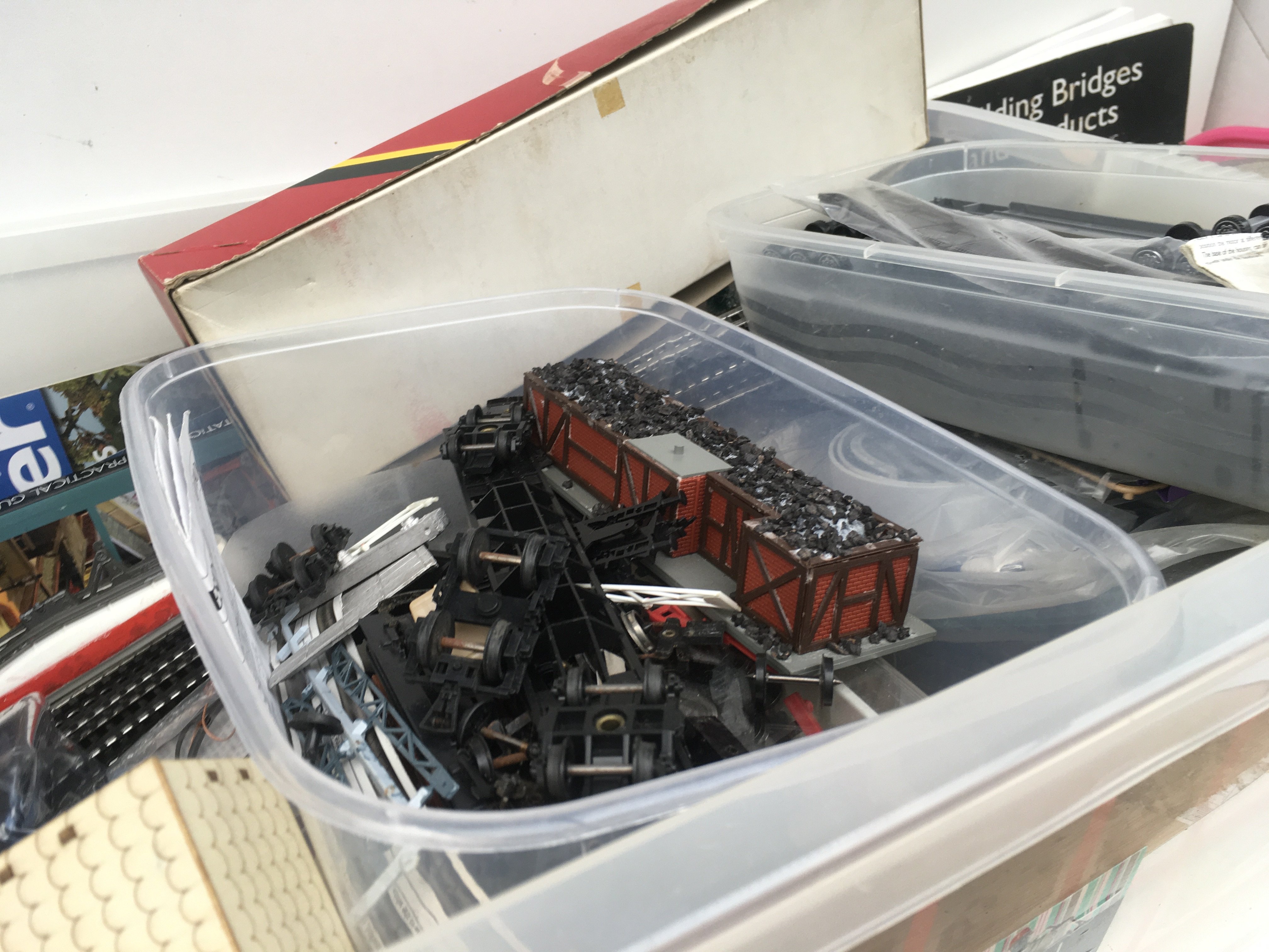 A large box containing an assortment of 00 and HO gauge model railway accessories including buildings..track..power supply etc. manufacturers include Hornby..Peco and others. No reserve