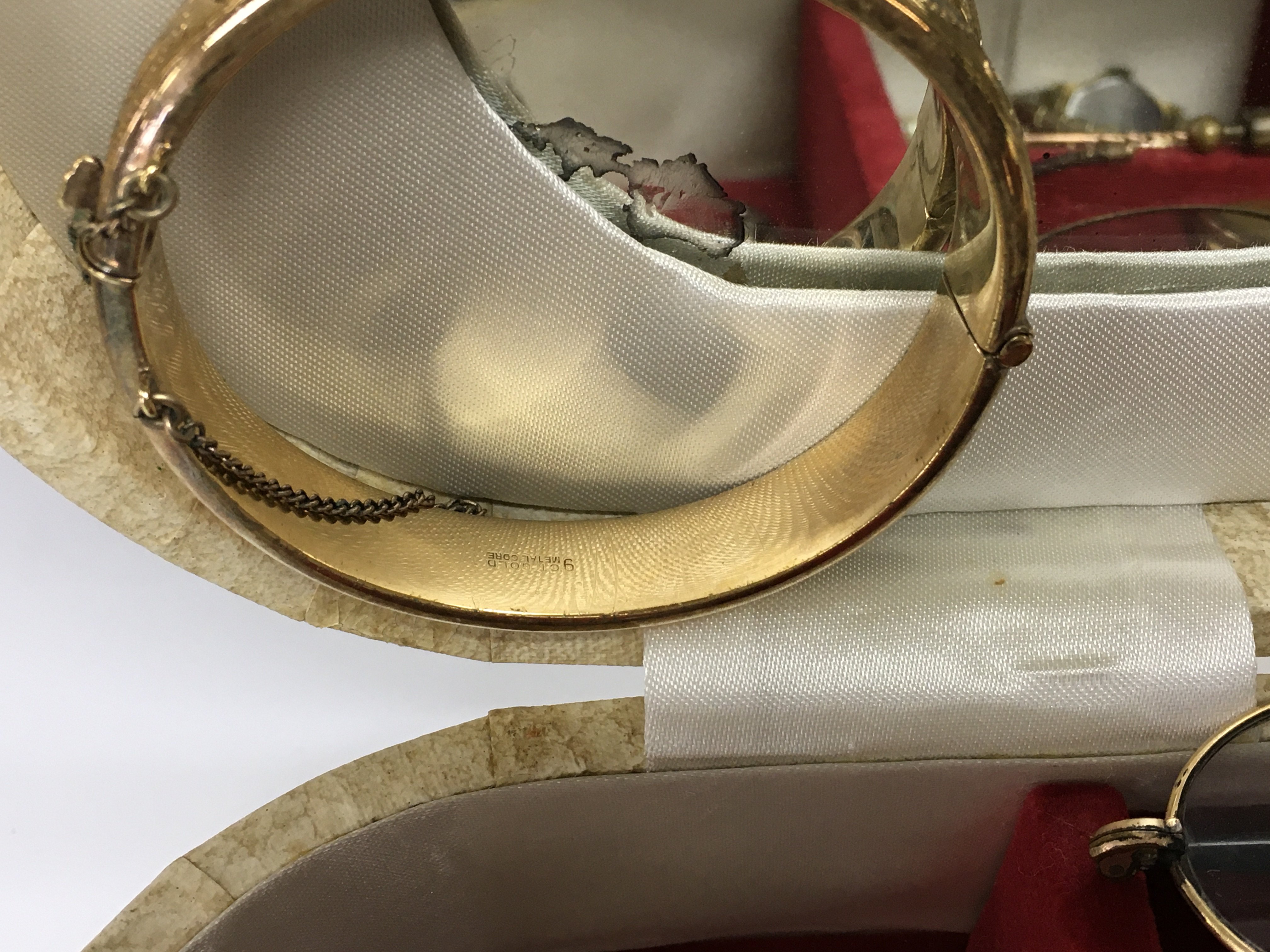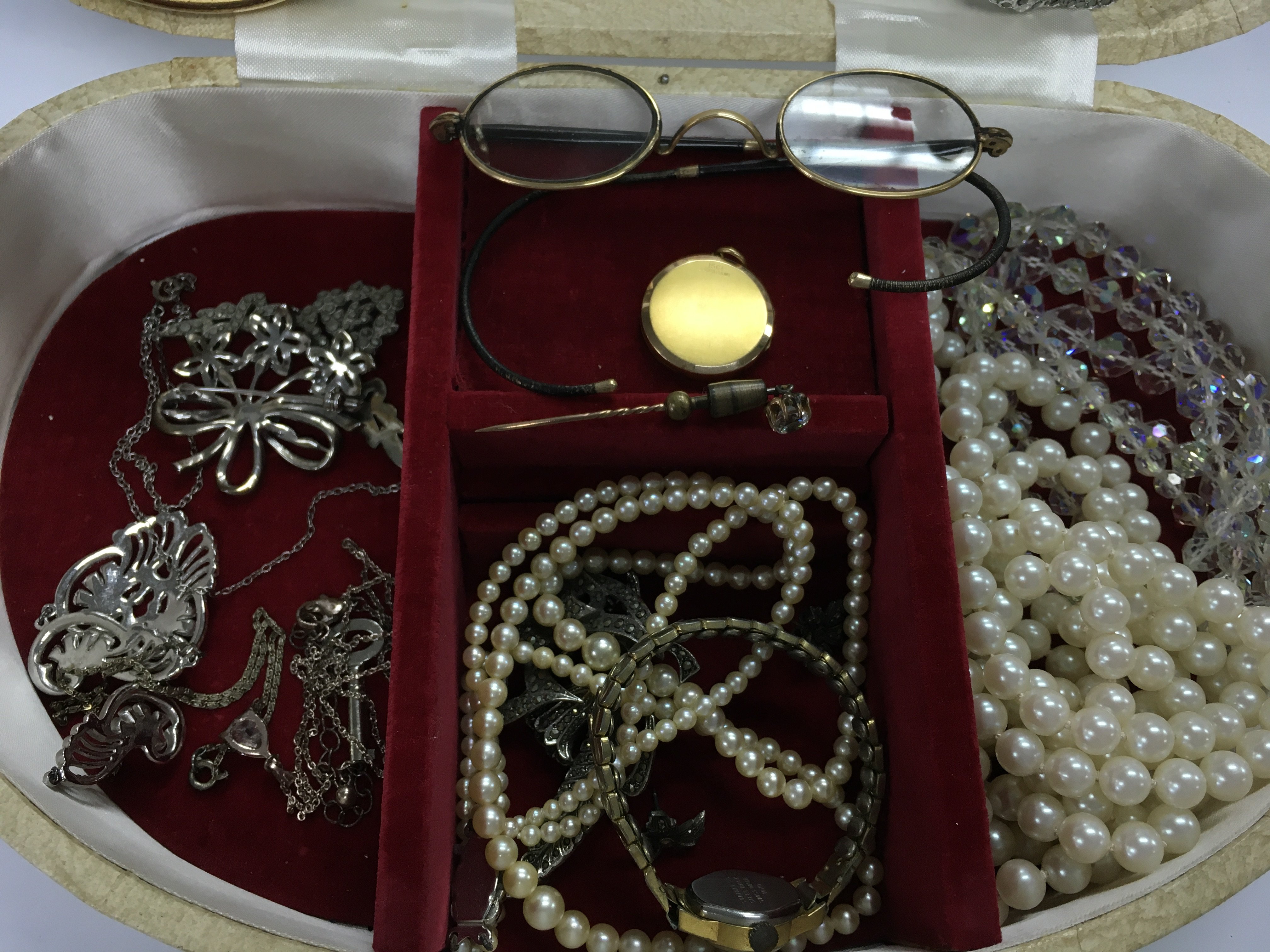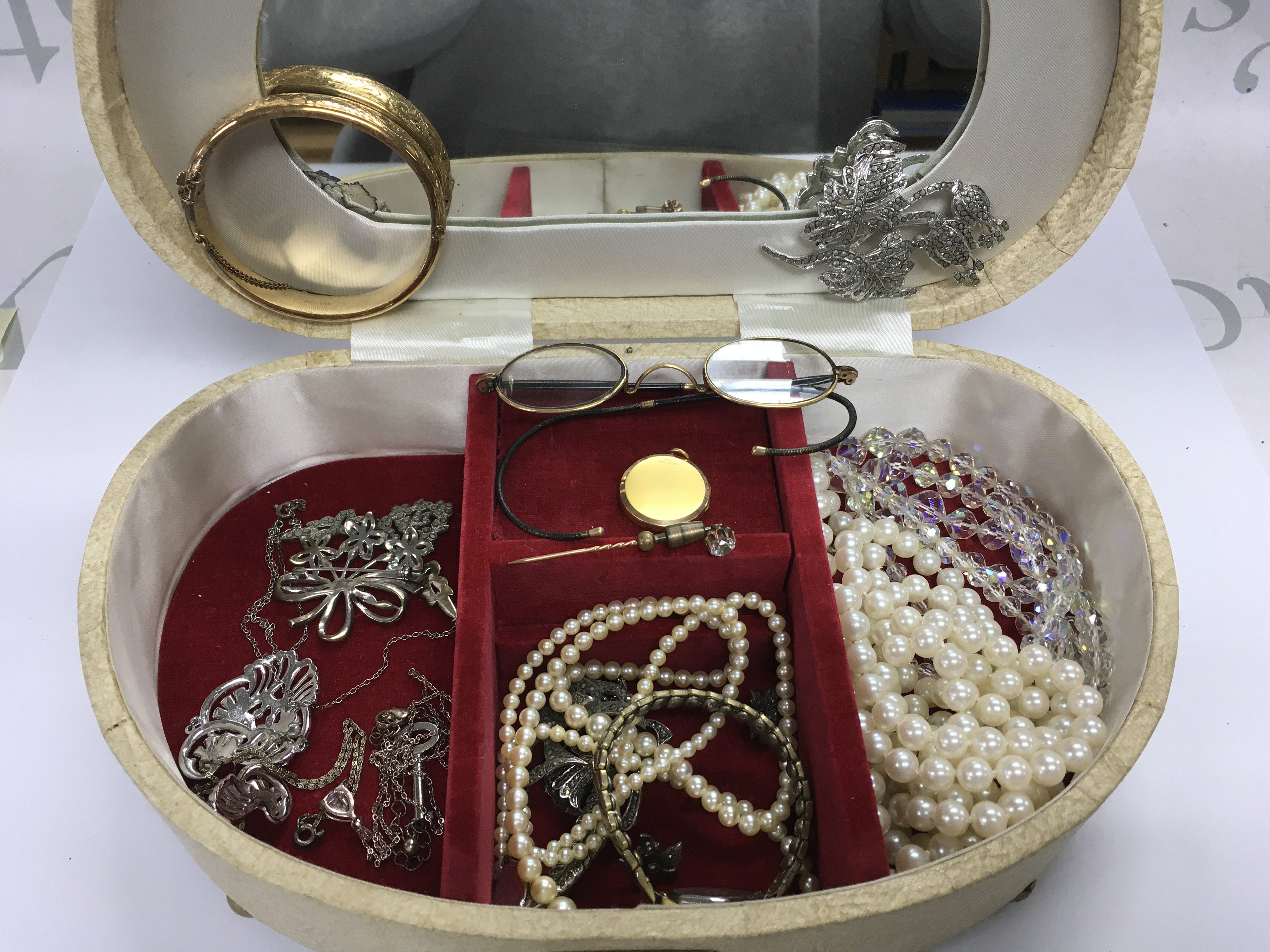 A collection of costume jewellery and pearl style jewellery including silver examples and a 9ct metal core bangle. Postage B