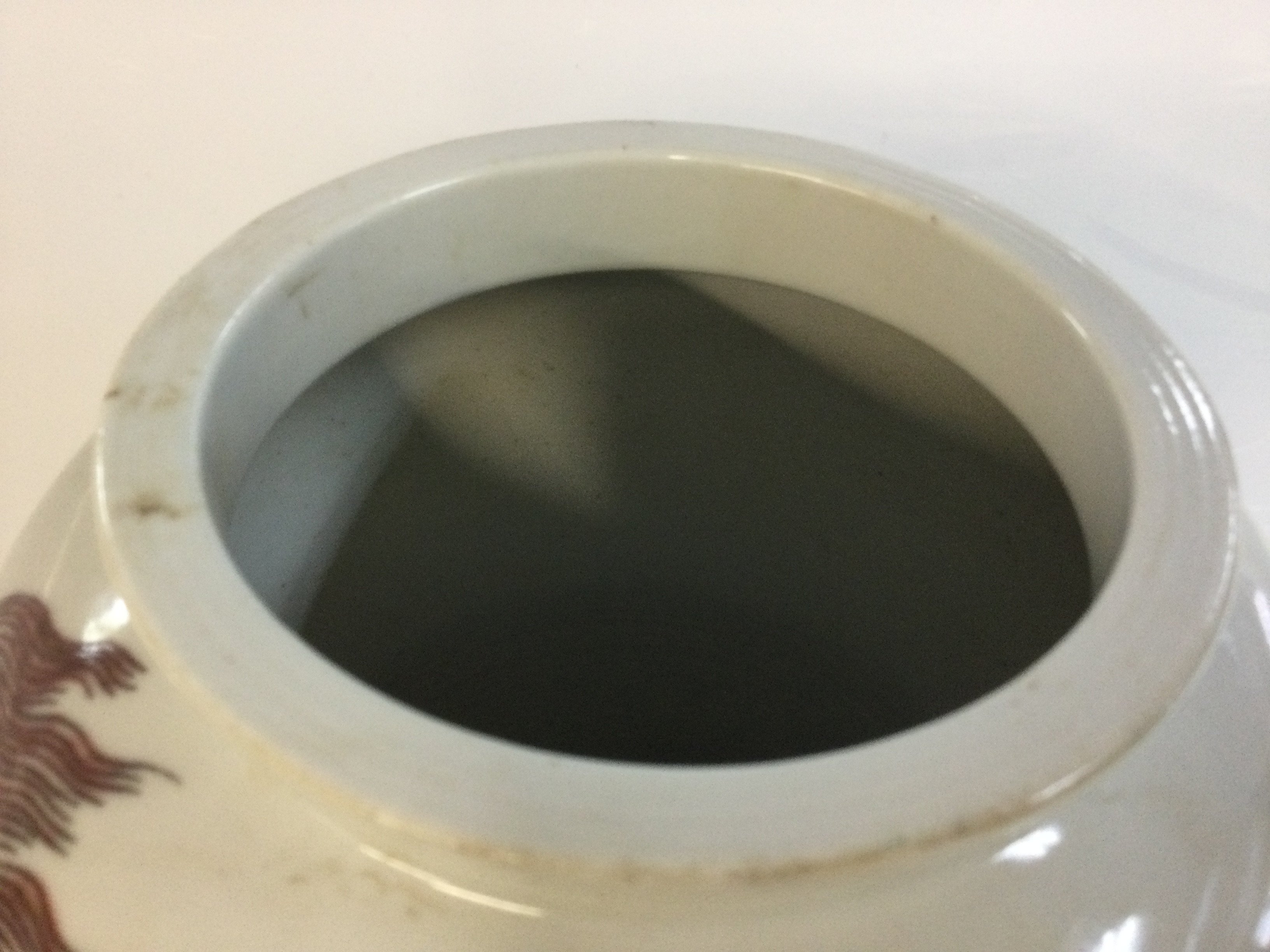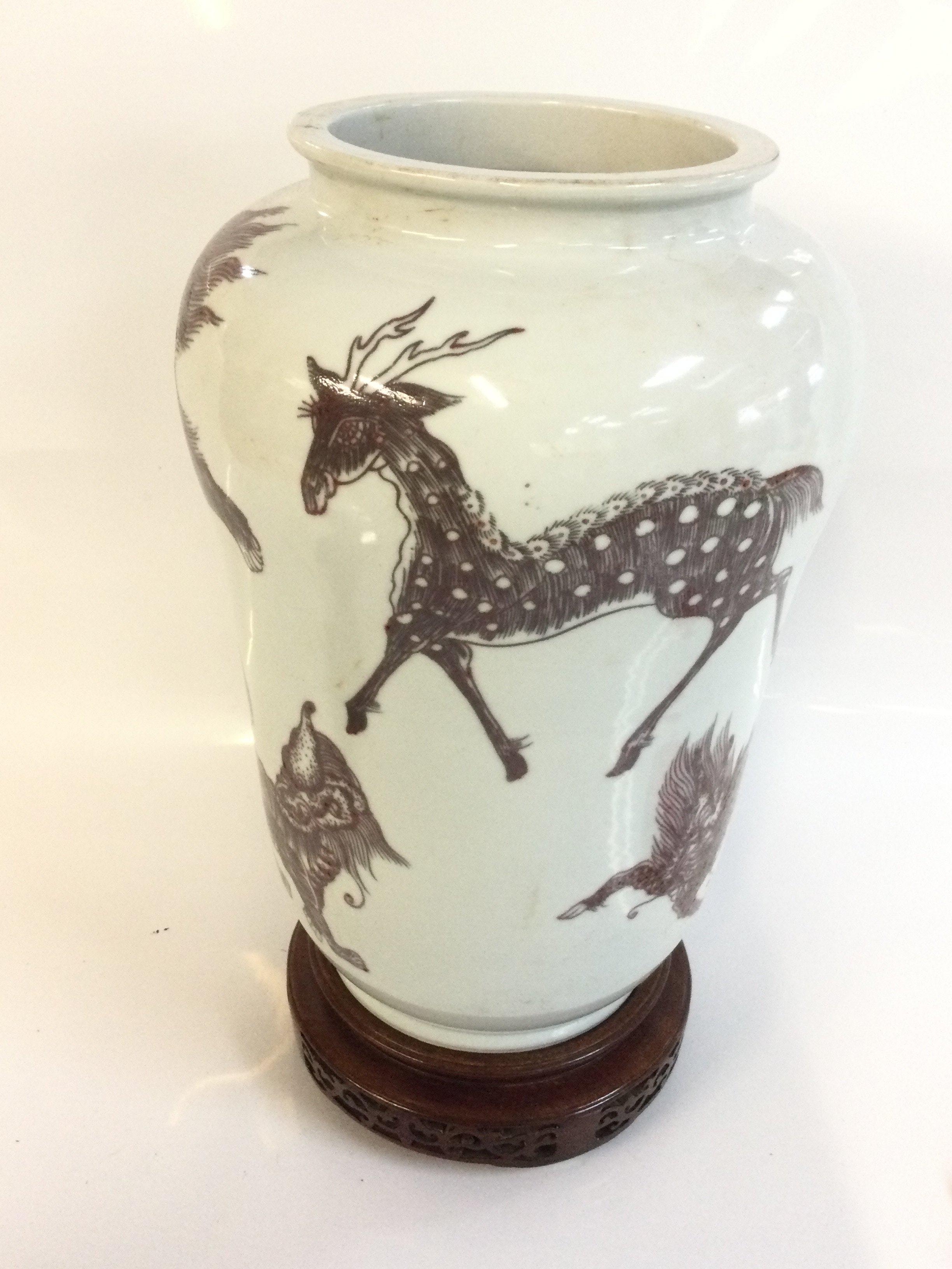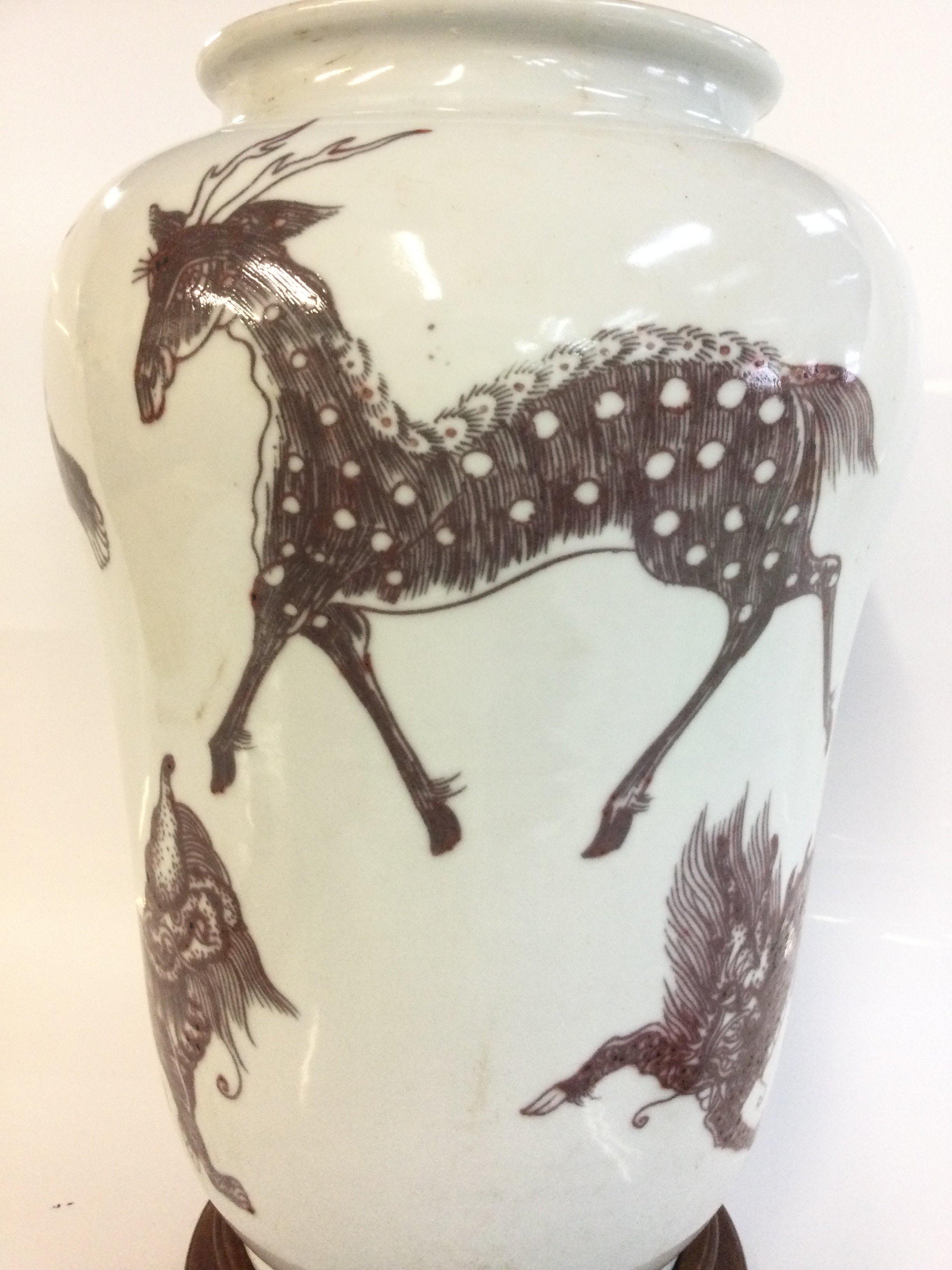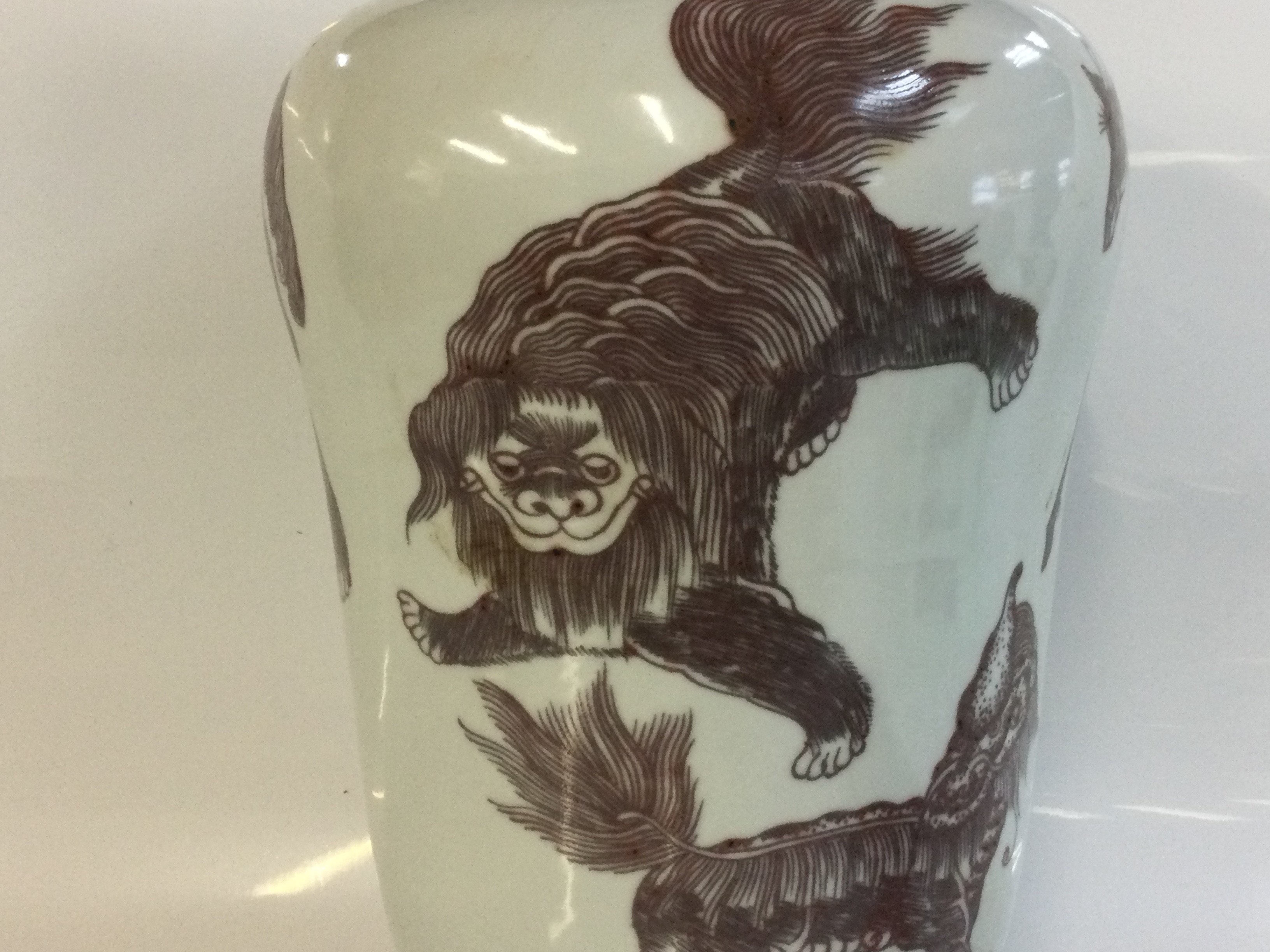 A Chinese iron red vase decorated with mythical creatures. With a six character mark at base. 26cm tall. This lot cannot be posted