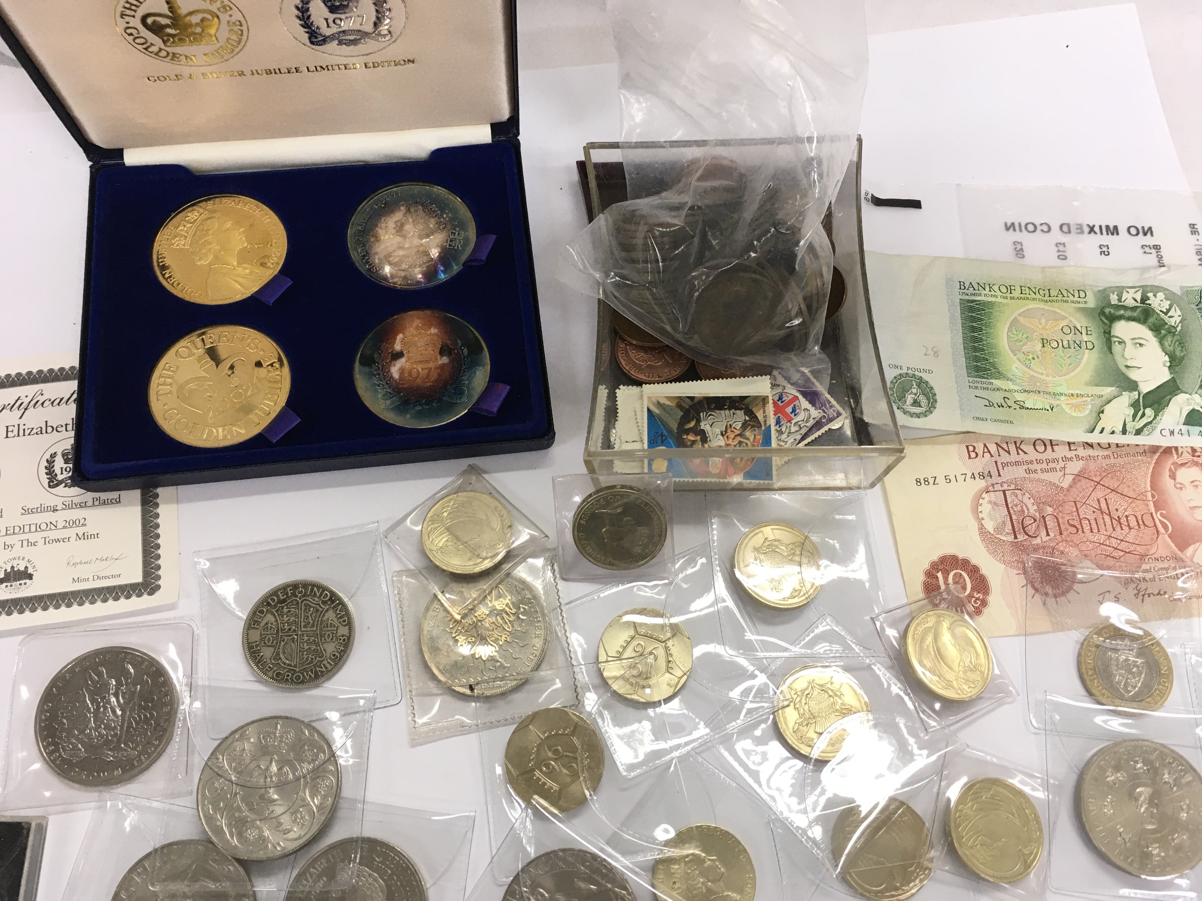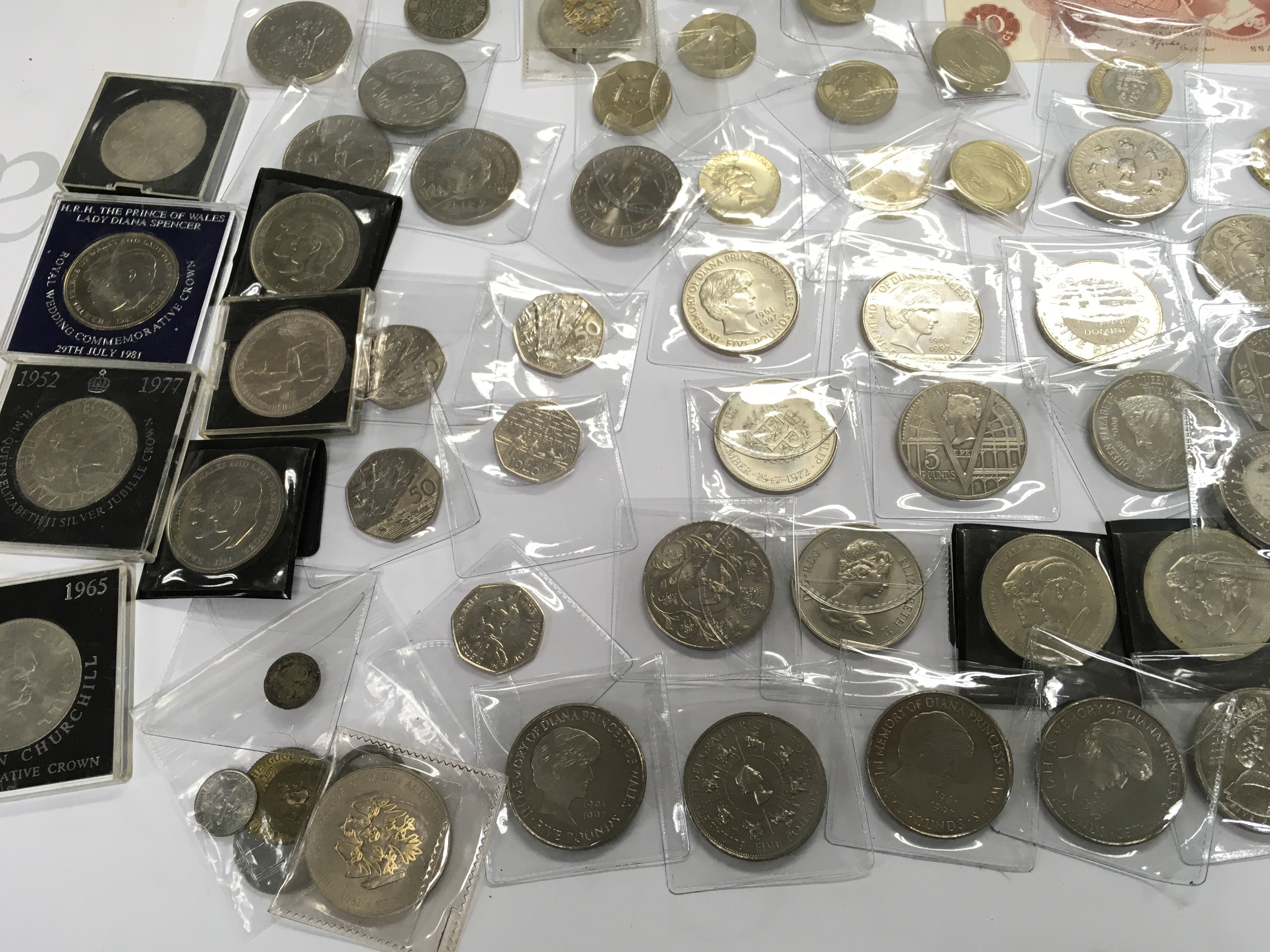 A collection of assorted coinage including 2 coins and commemorative crowns. Postage B