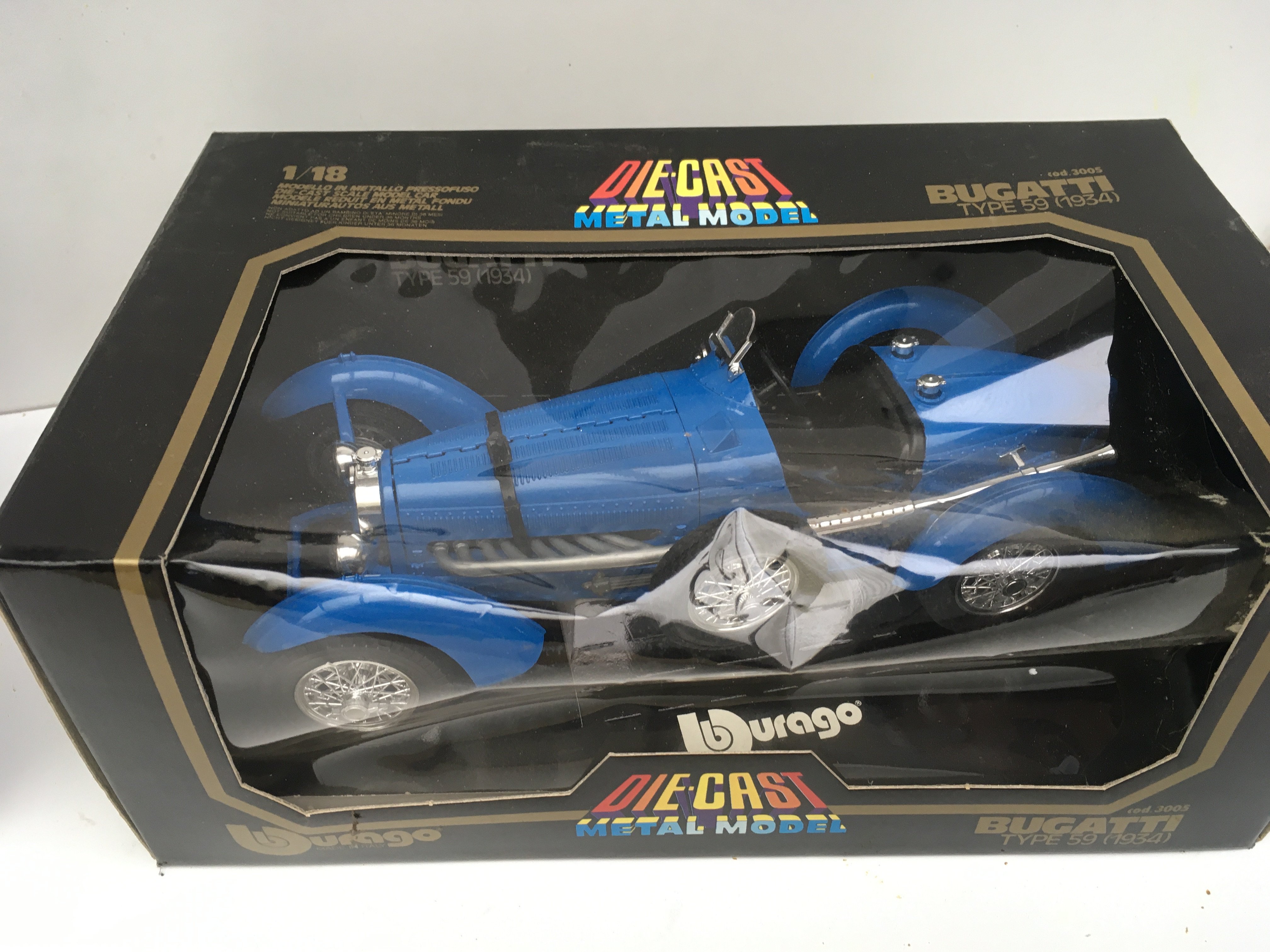 2x boxed diecast model cars by burago featuring a 1928 Mercedes Benz SSK and a 1934 Bugatti type 59. No reserve.