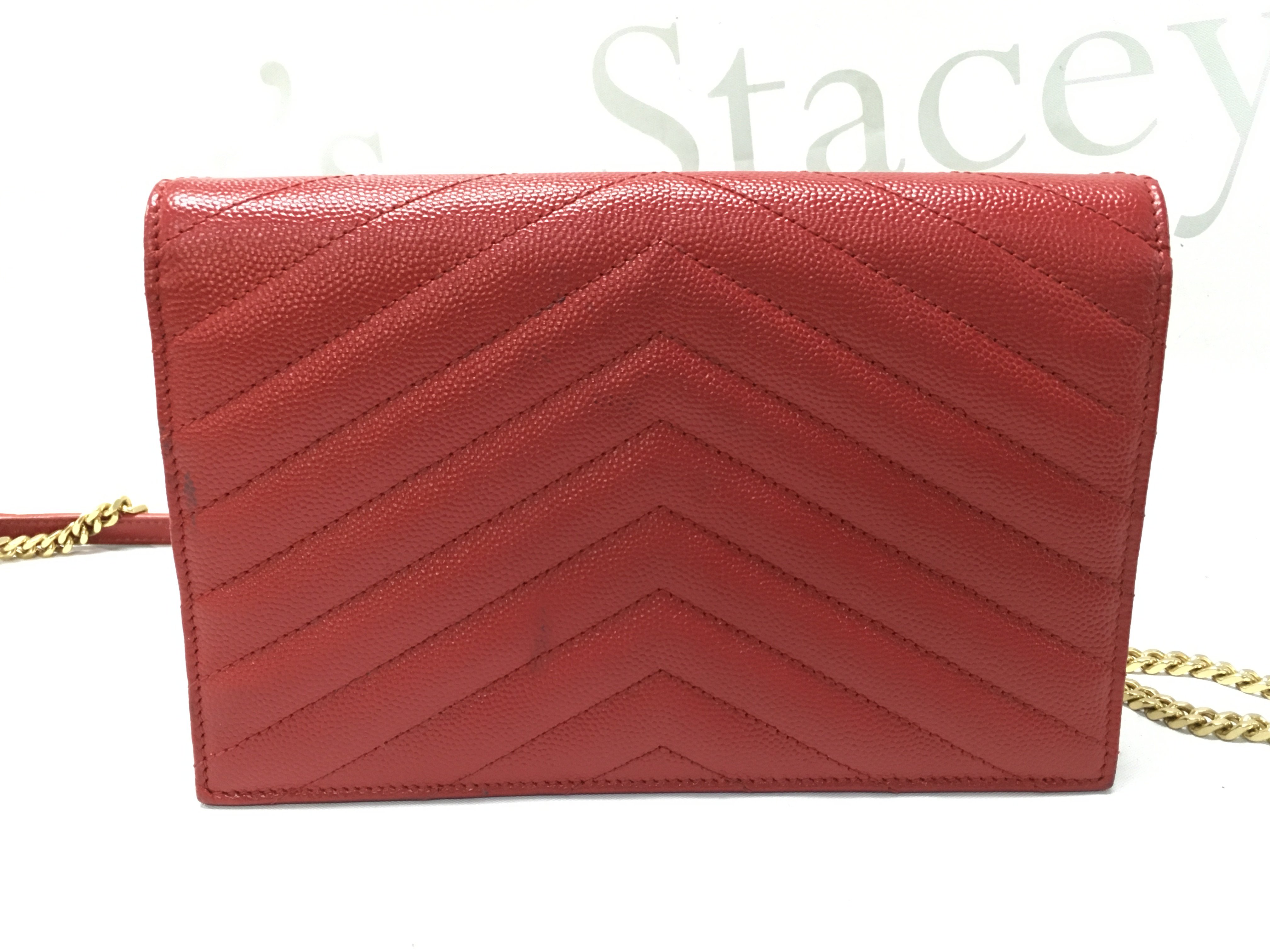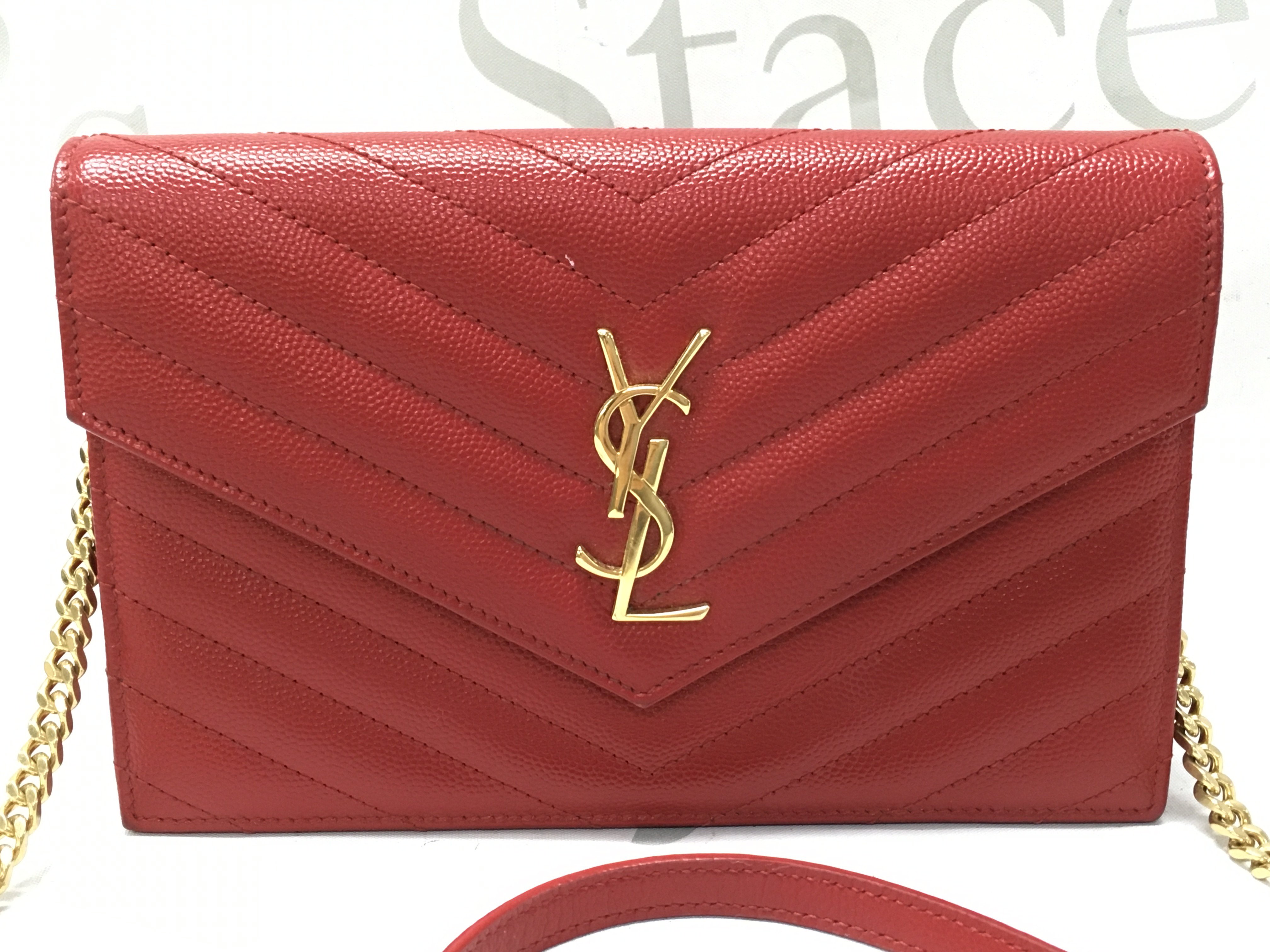 A boxed Saint Laurent Red Grain De Powder Matelasse wallet on chain bag with certificate, receipt and dust bag