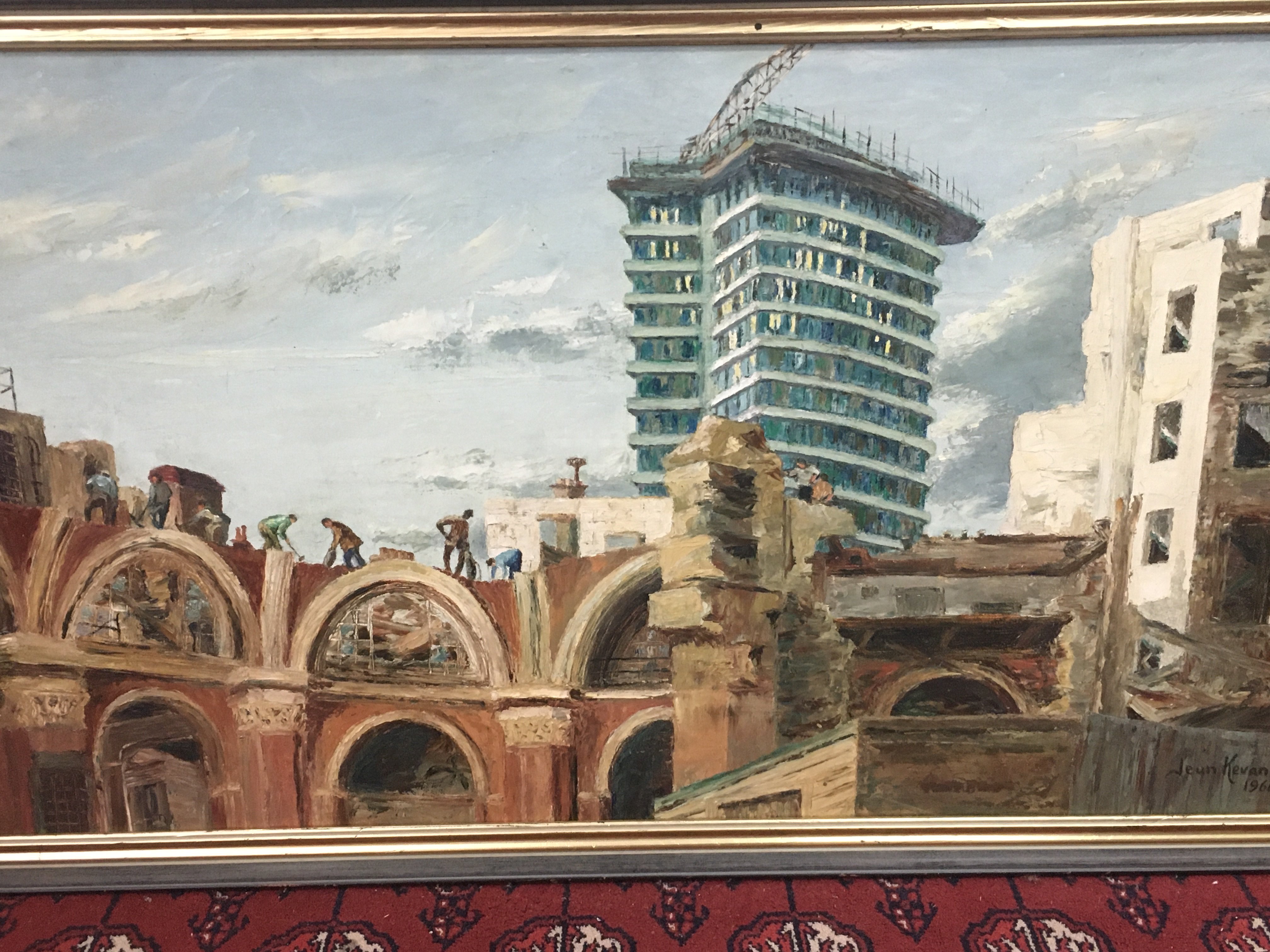 A Jean Kevan (1916-2006) framed oil on canvas painting of the Stock Exchange London Demolition 1966, As the old Stock Exchange is demolished, Richard Seifert's innovative Drapers Gardens building nears completion. This was, apparently, Seifert's own favourite work. Frame dimensions 106x60cm- NO RESERVE