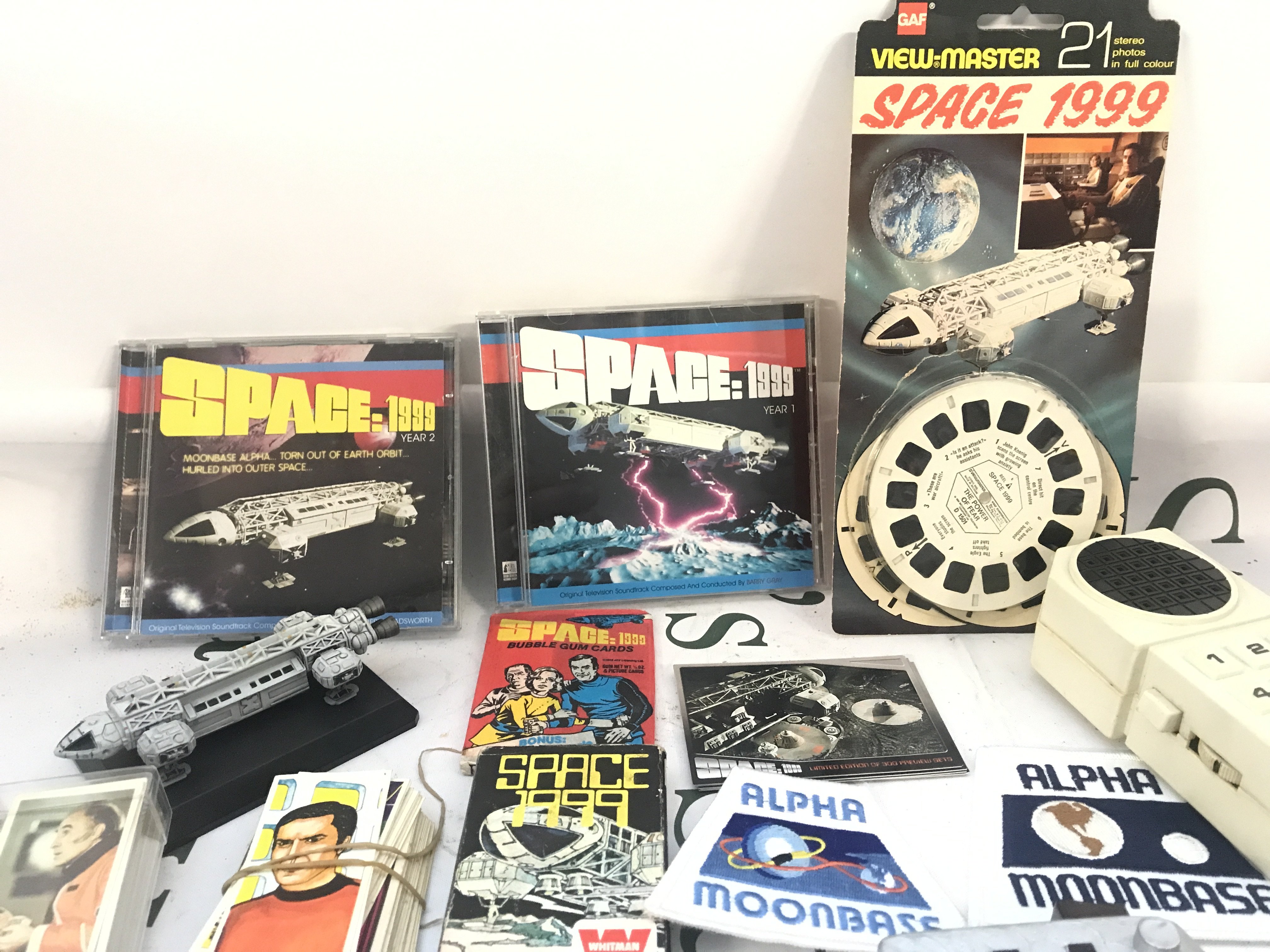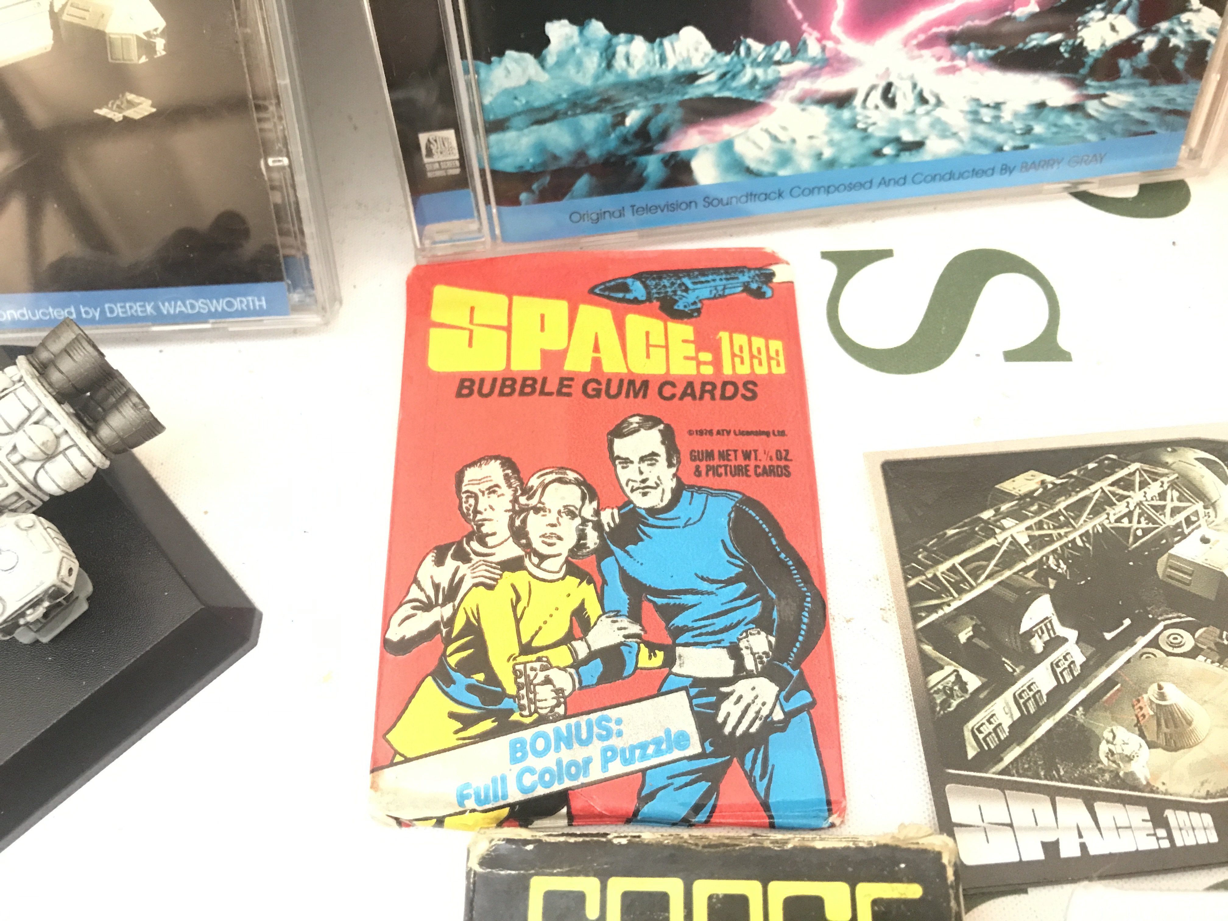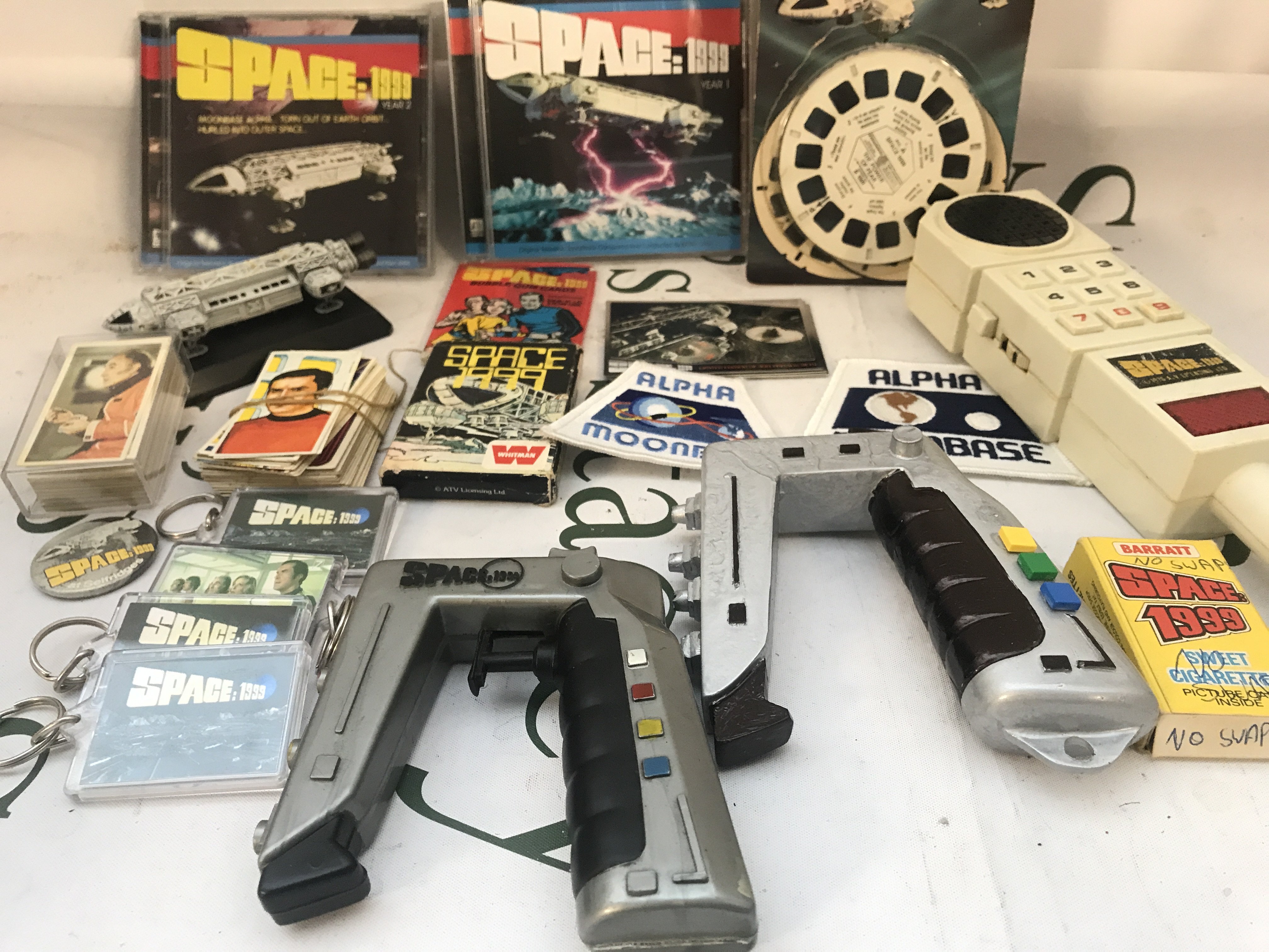 A Small Collection Of Space 1999 Toys Key Rings etc. including A Sealed Packet Of Bubble Gum Cards. No Reserve.
