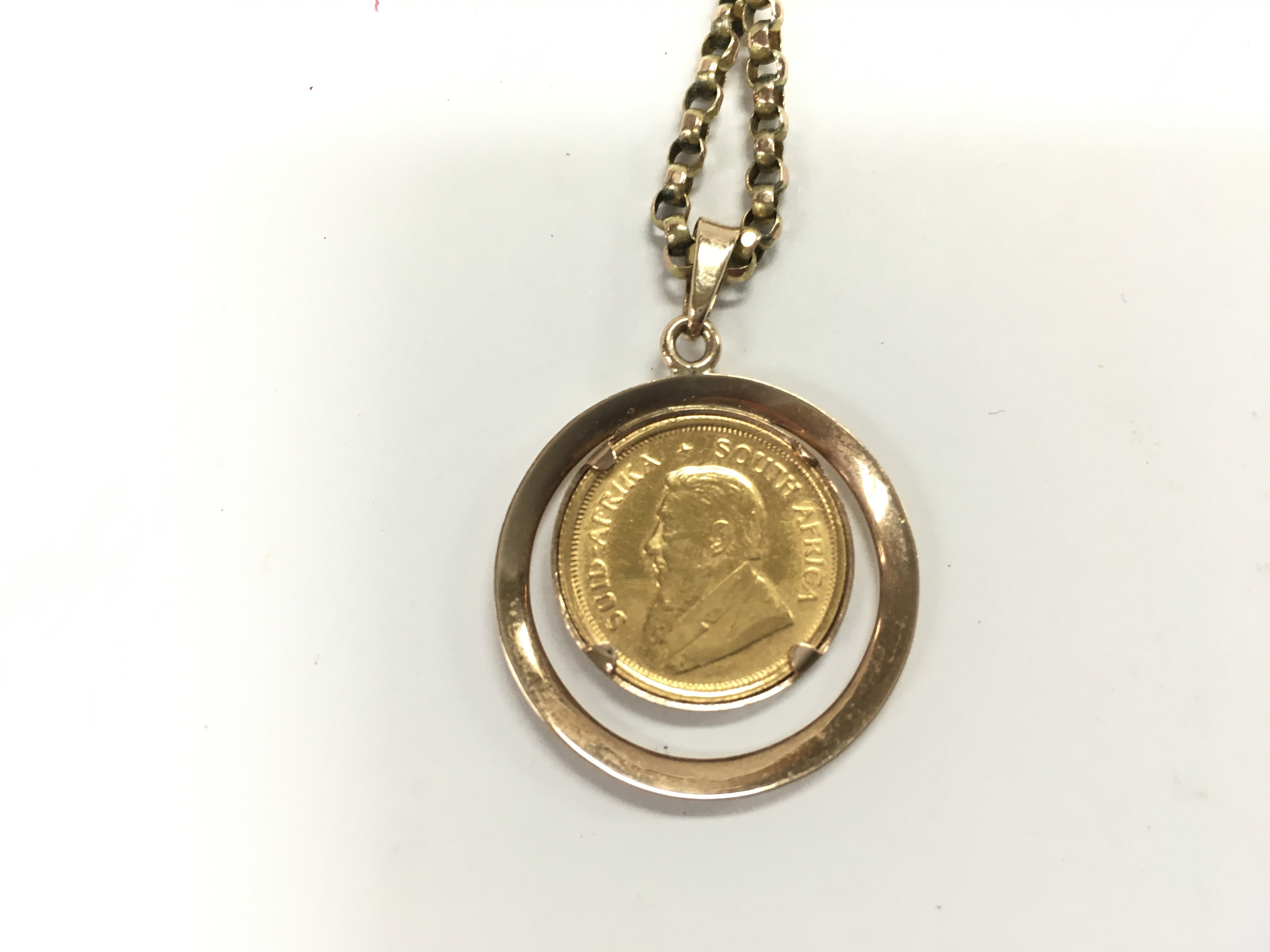 1/10oz Krugerrand on an unmarked 9ct gold chain. 9.92g