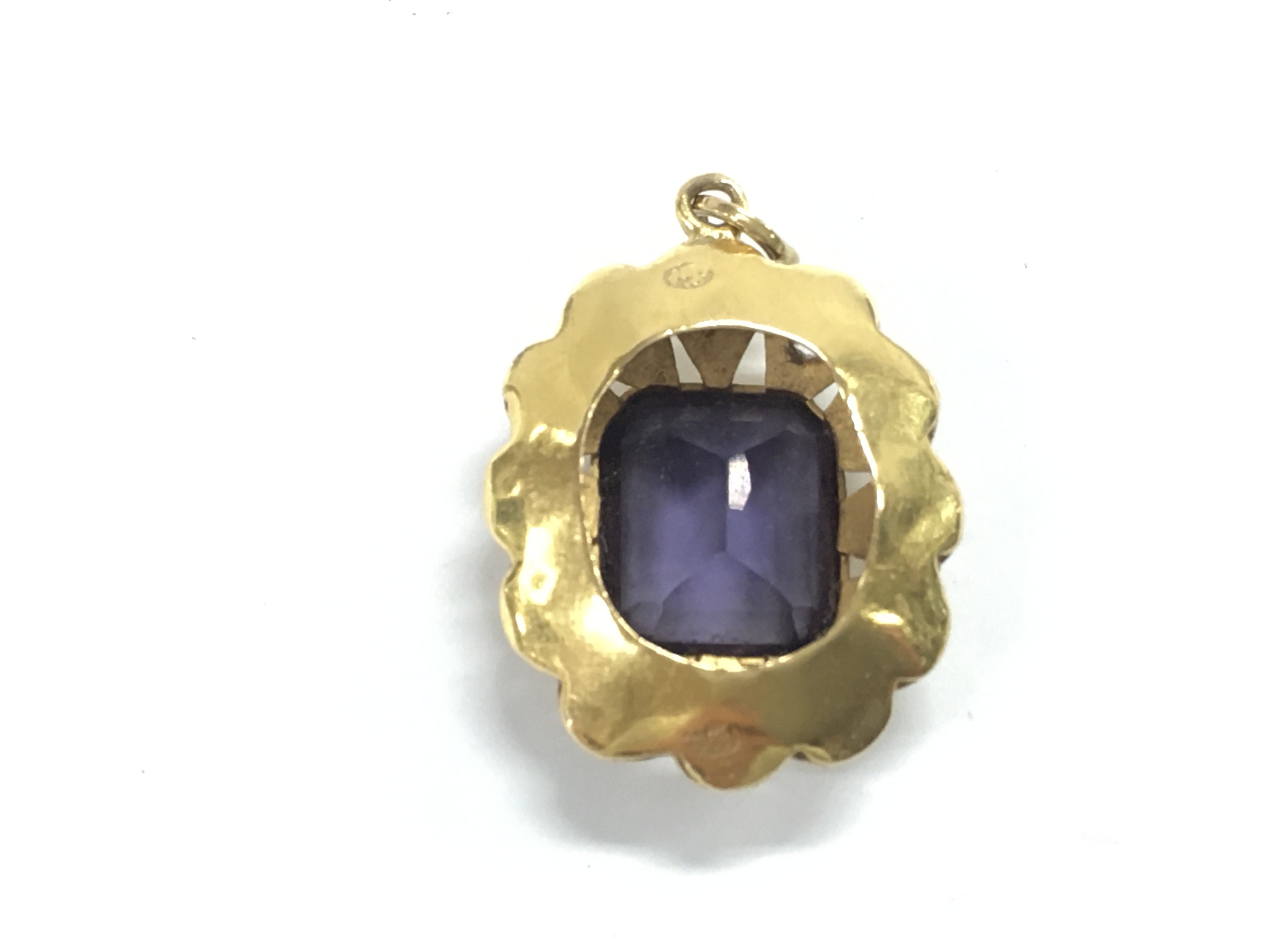 A Middle Eastern gold pendant set with an amethyst. 7.16g