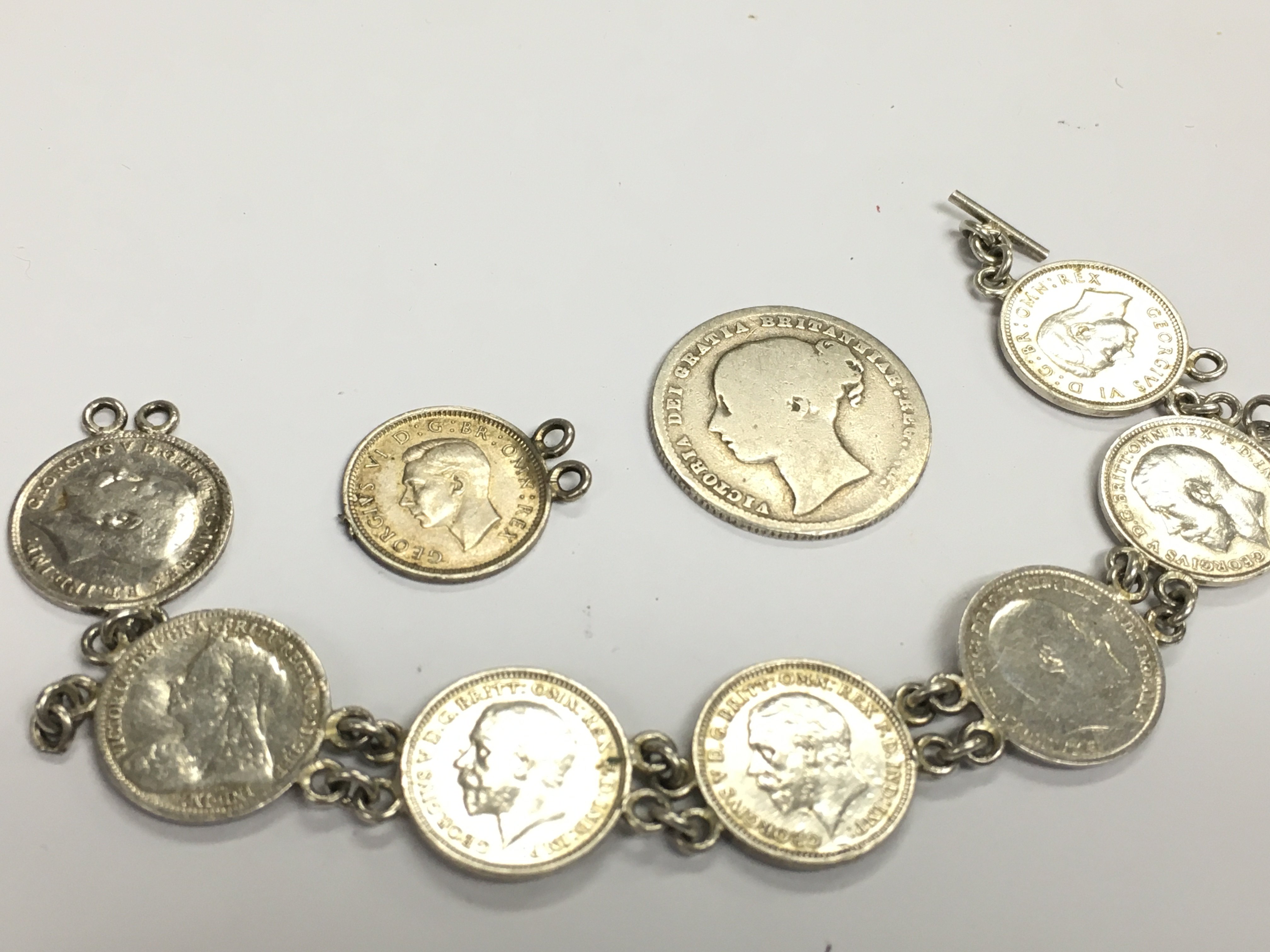 Silver coin bracelet and a Victorian 1875 one shilling. Postage category A