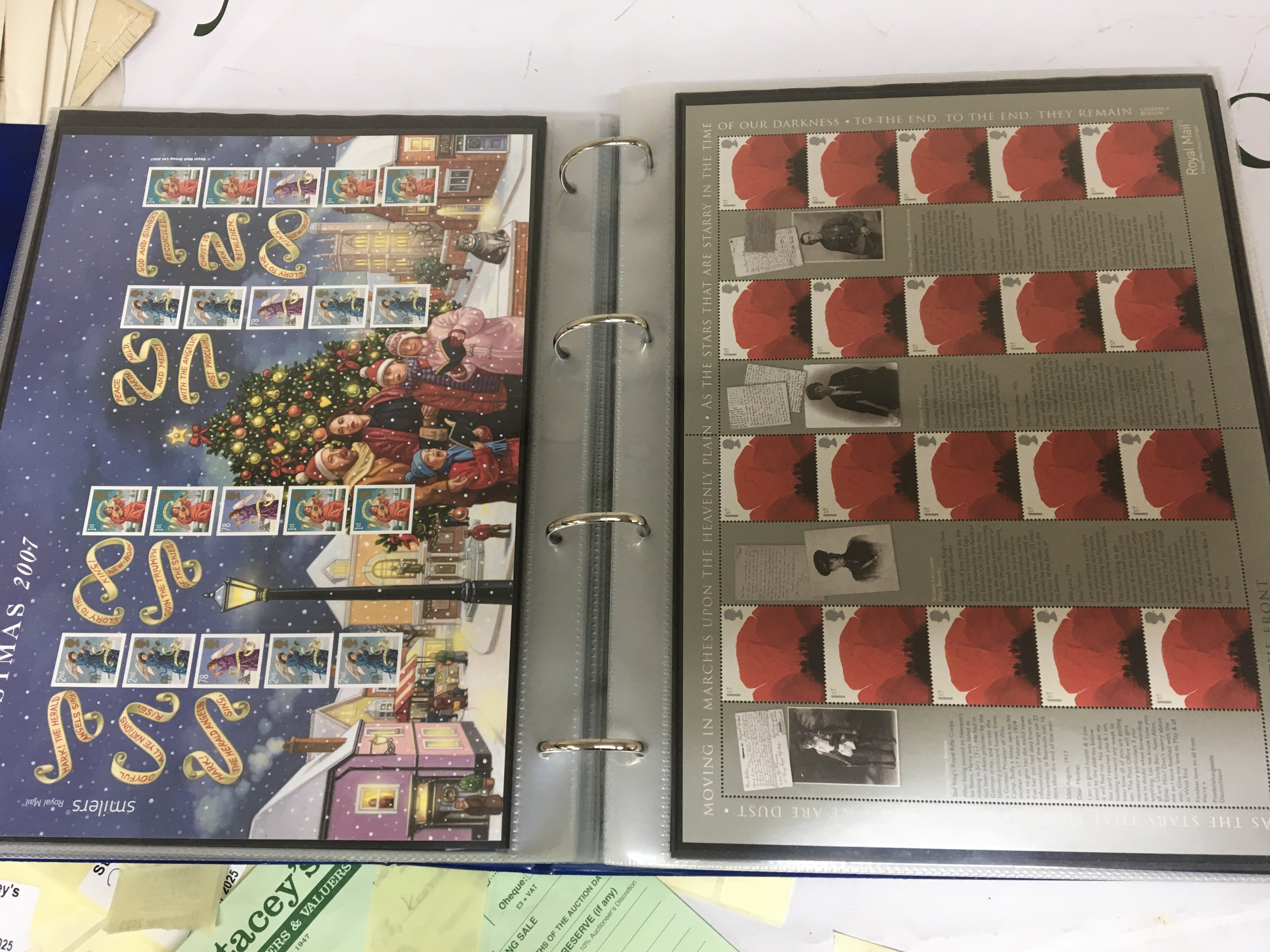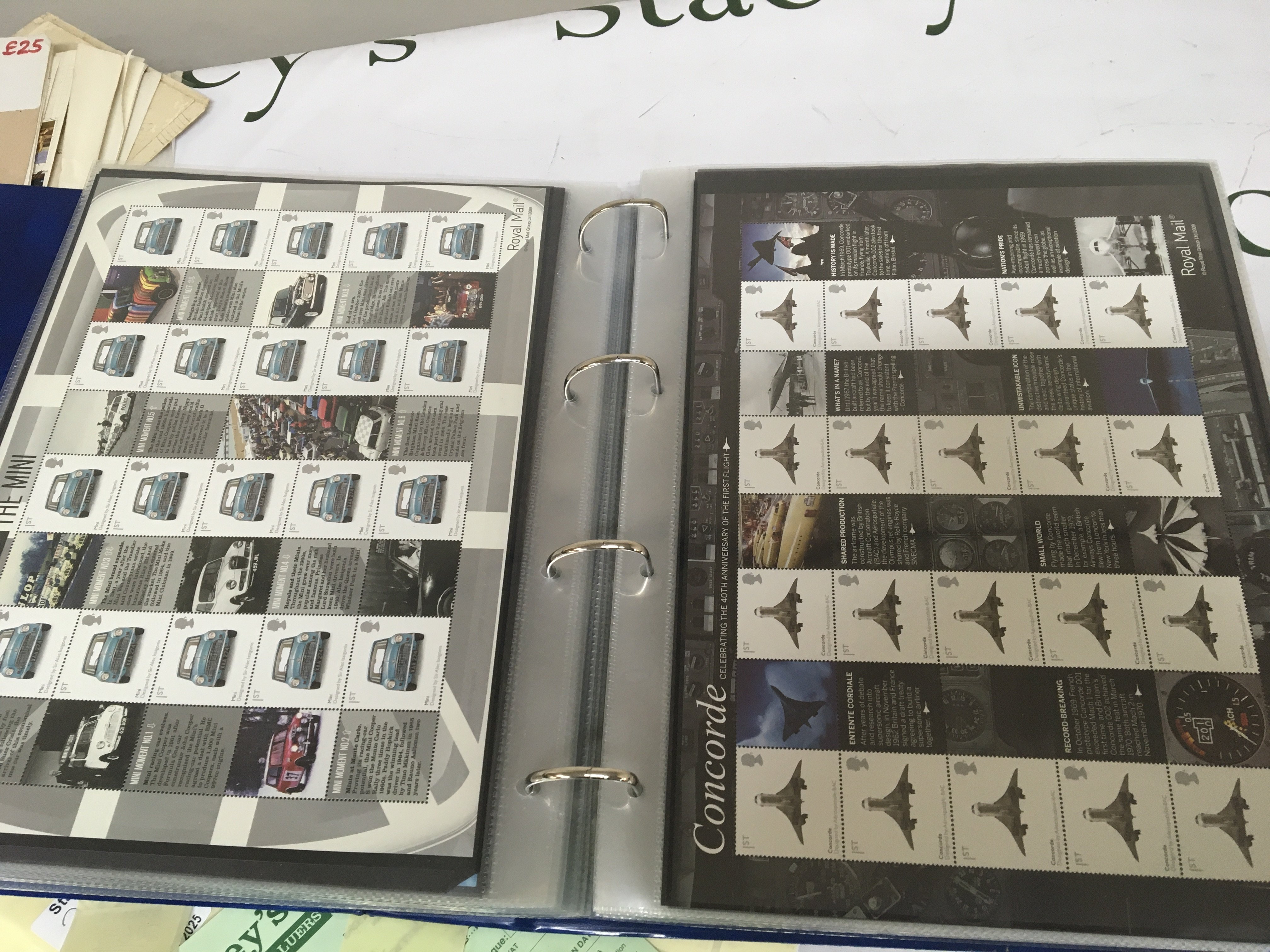 An album containing excess of 70 British Royal Mail Pictorial stamp sheets predominantly First class each sheet with 10 or more stamps some double sheets. All in very good unused condition.