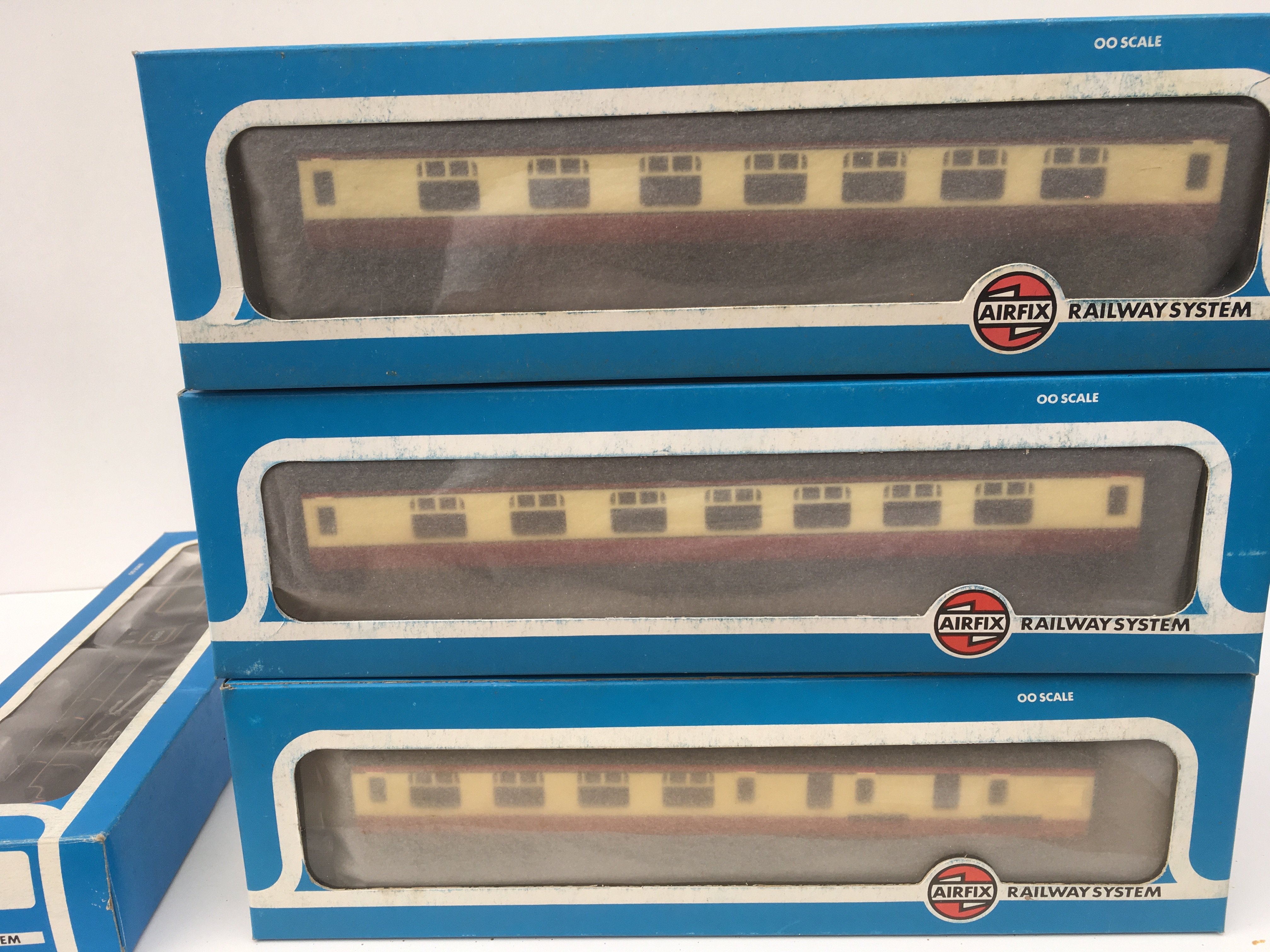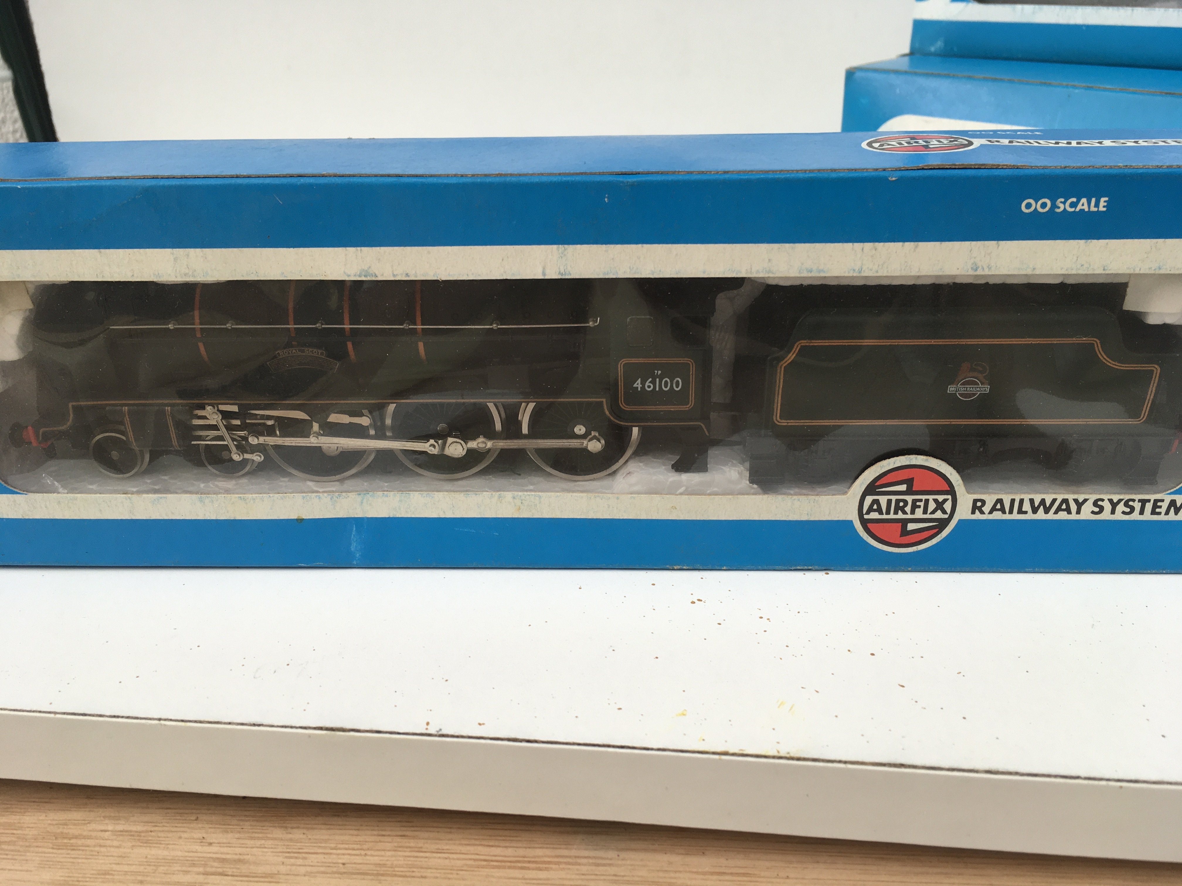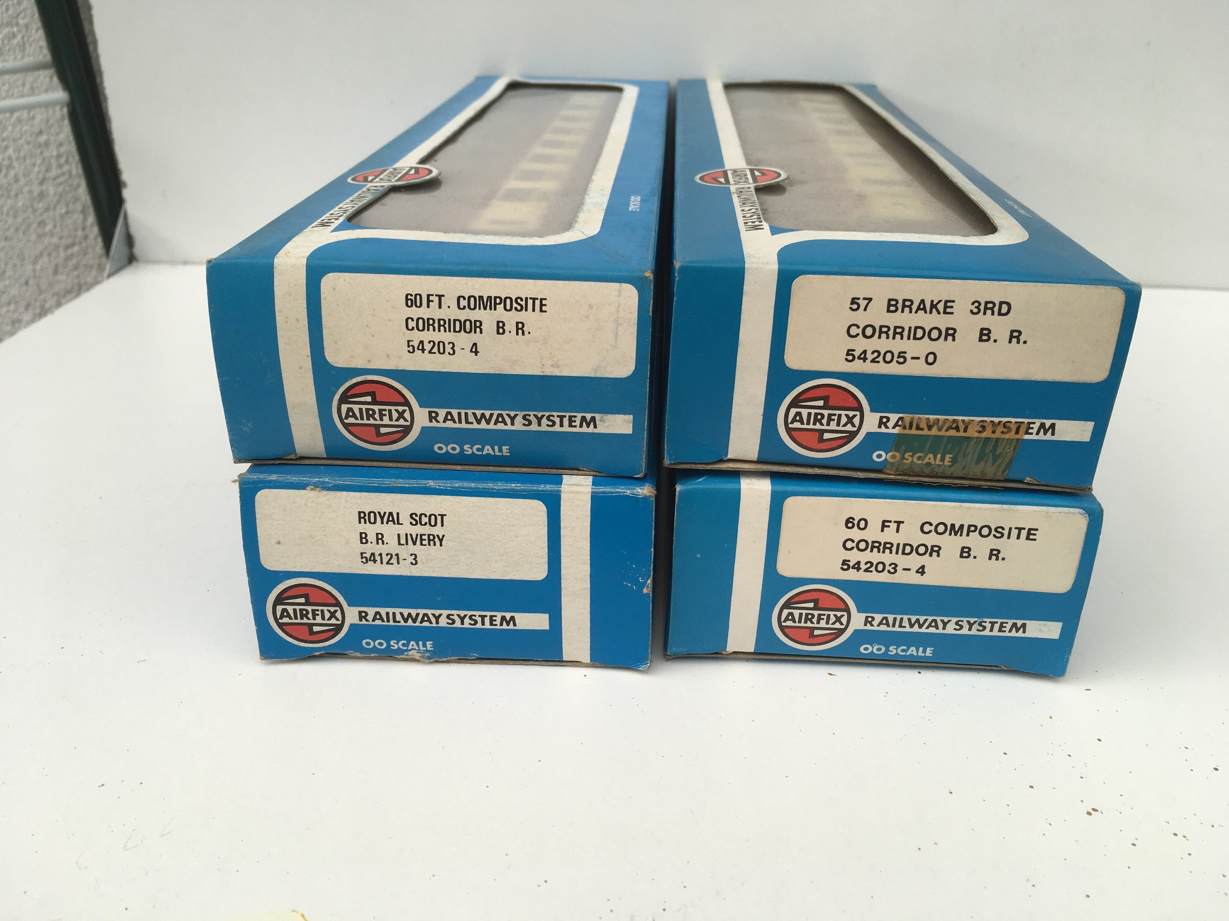 Boxed OO gauge model railway pieces by Airfix featuring a locomotive and tender Royal Scot and 3x coaches. No reserve