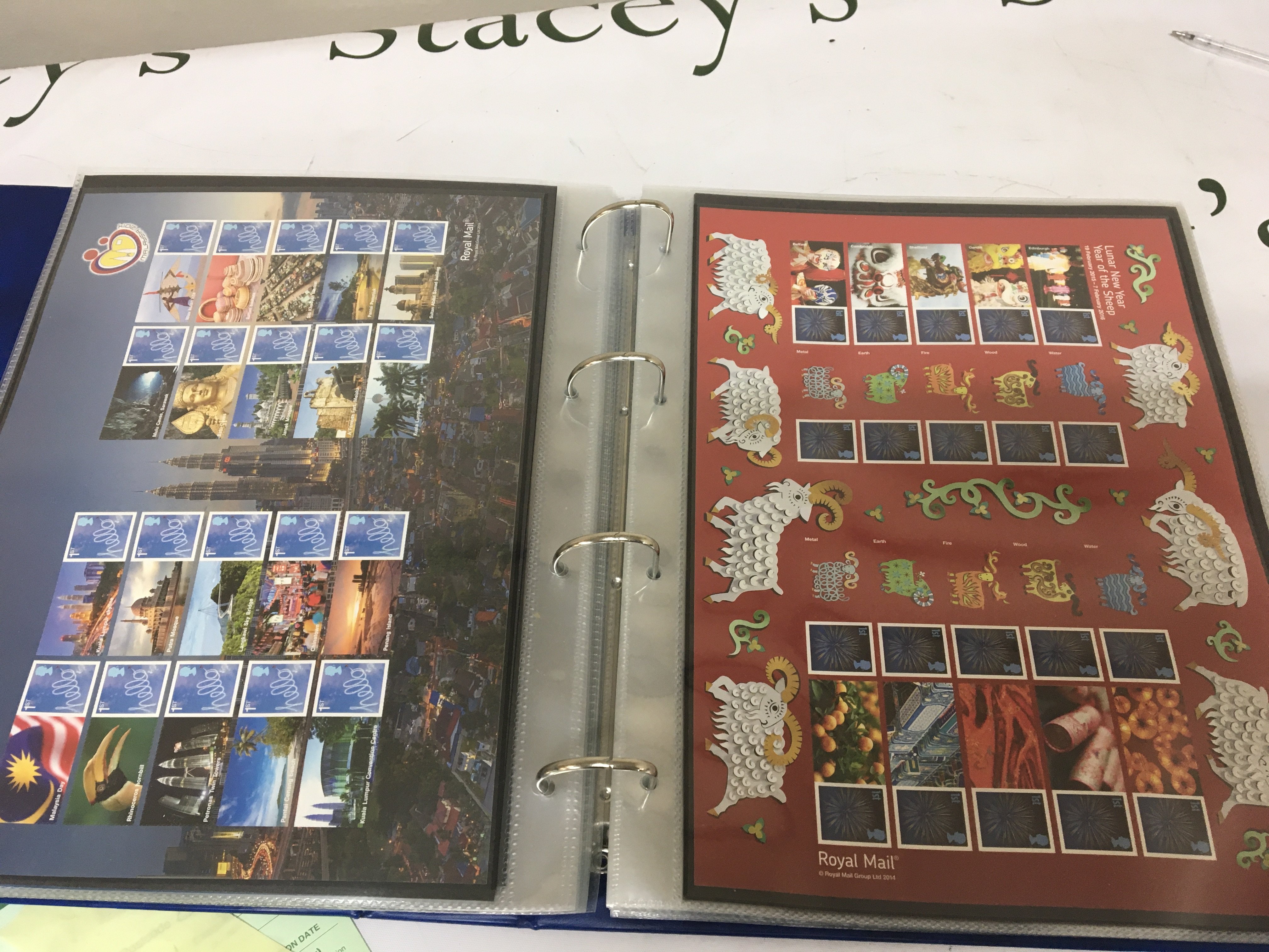 An album containing British Royal Mail Pictorial First Class stamp sheets each illustrated sheet with ten stamps all mint condition unused approximately 30+ sheets.