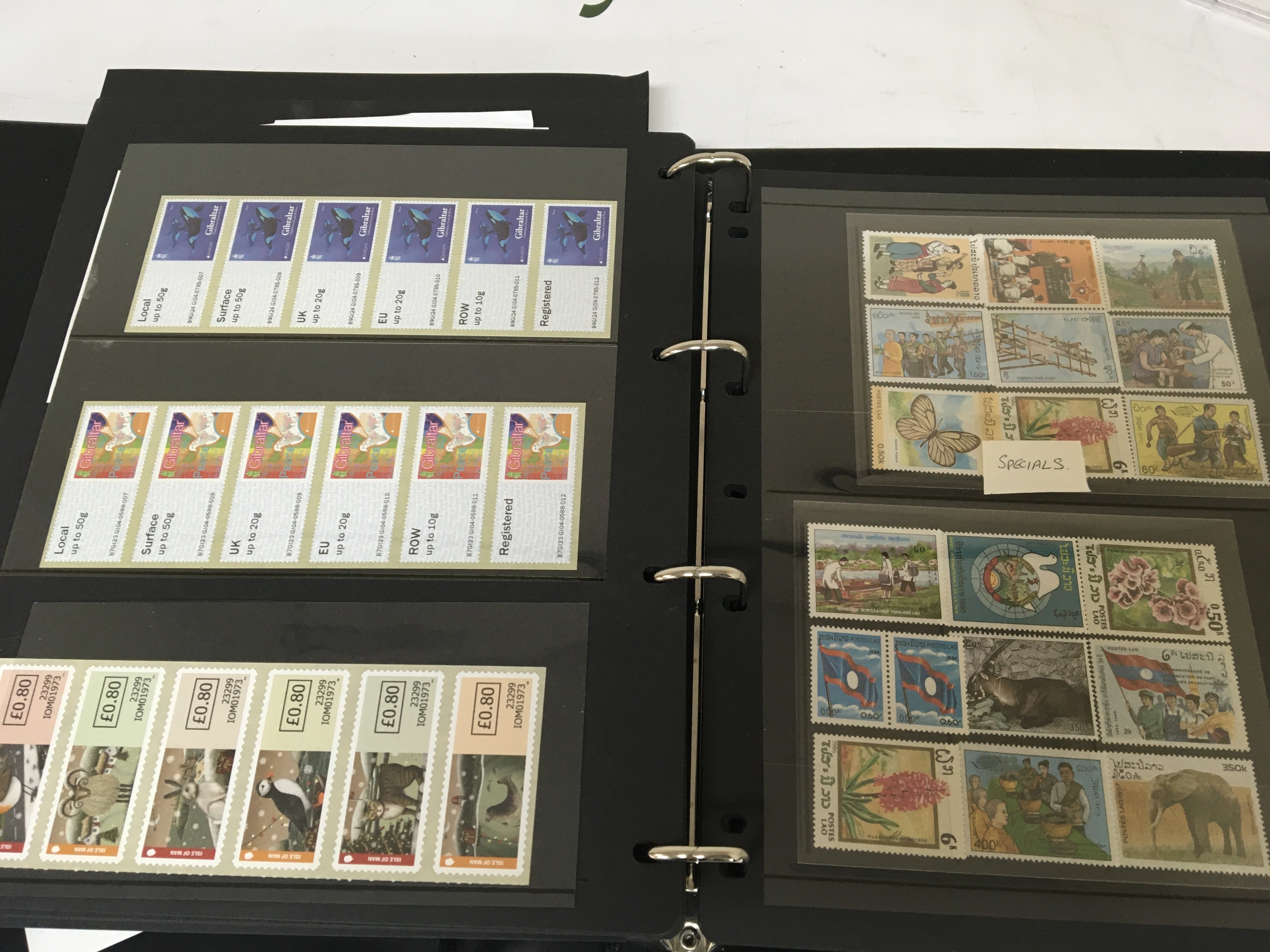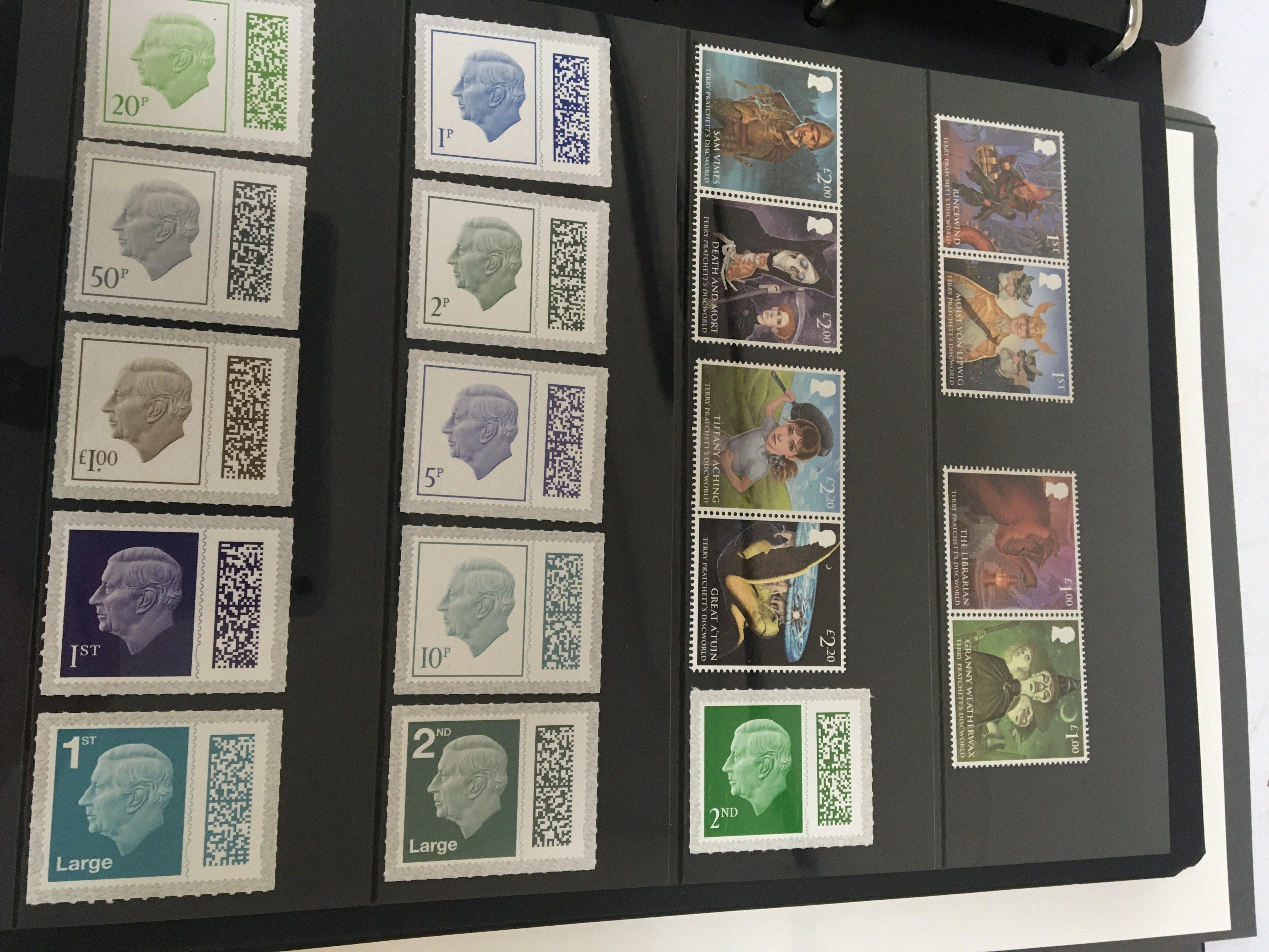 An album containing New Issue Charles III pictorial stamps Elizabeth II pictorial stamps unused themed stamp books first and second class and others all unused and very good condition.