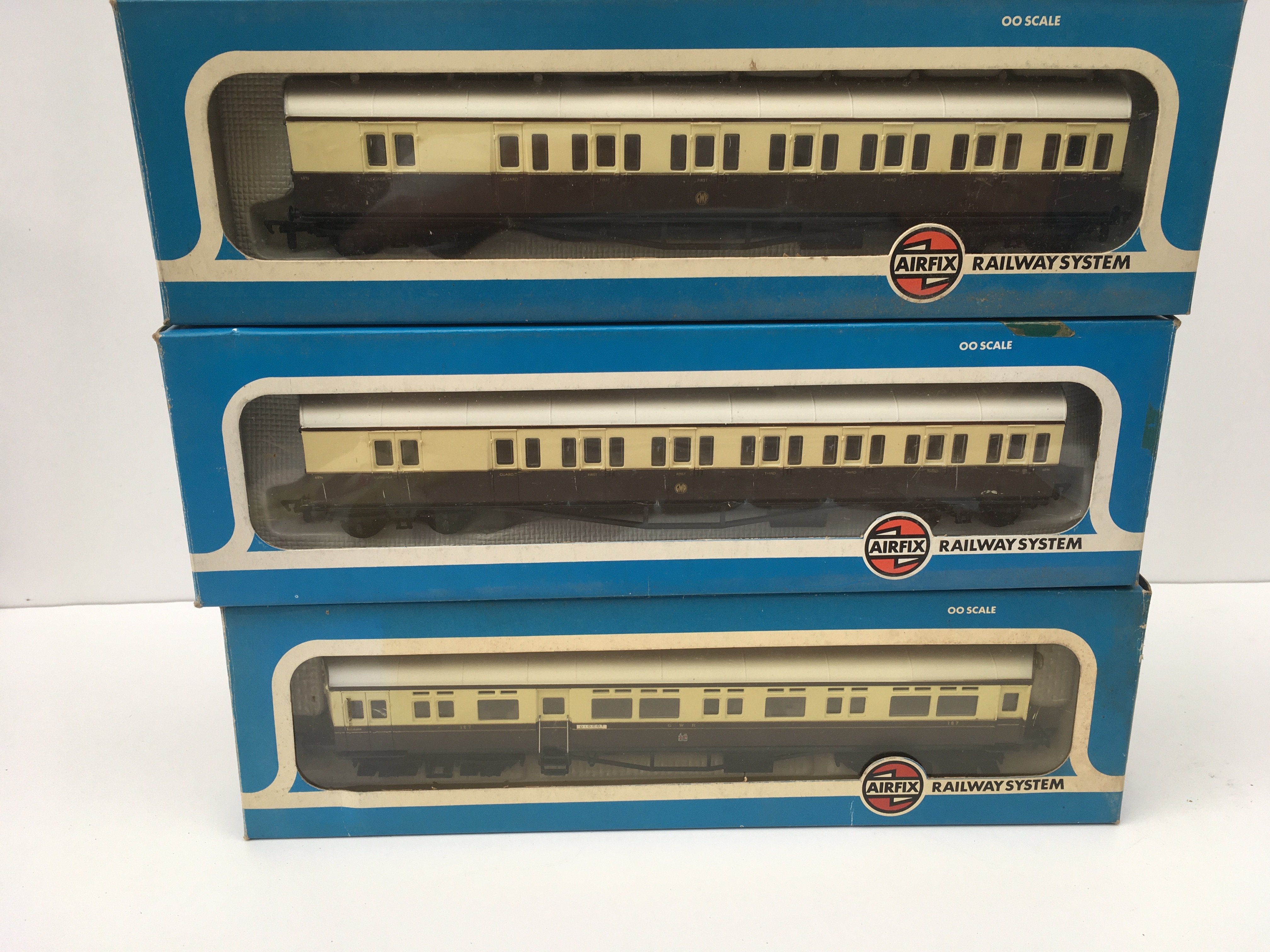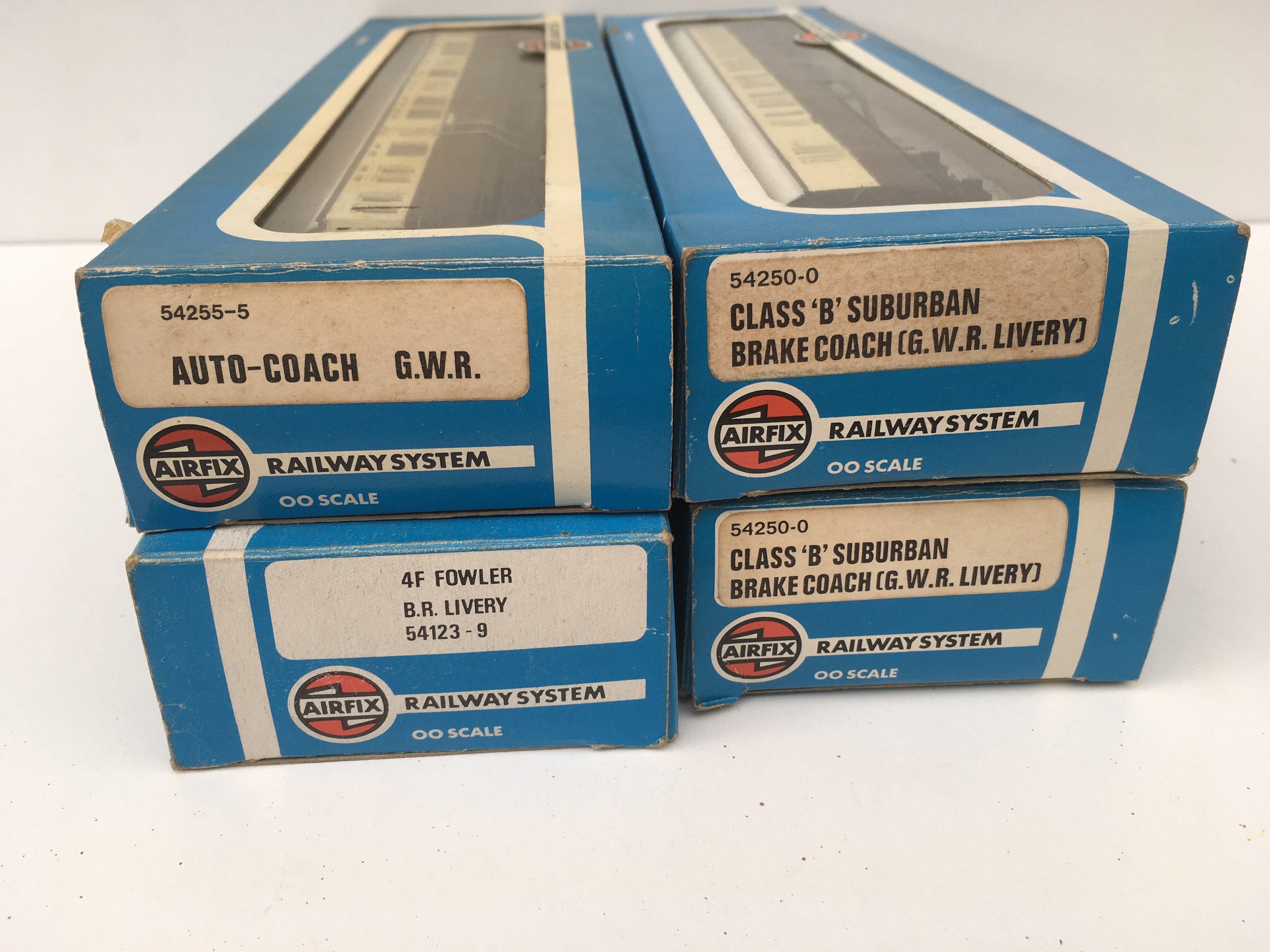 A collection of 4 boxed 00 gauge pieces by Airfix comprising a 4F Fowler locomotive and 3x coaches. No reserve.