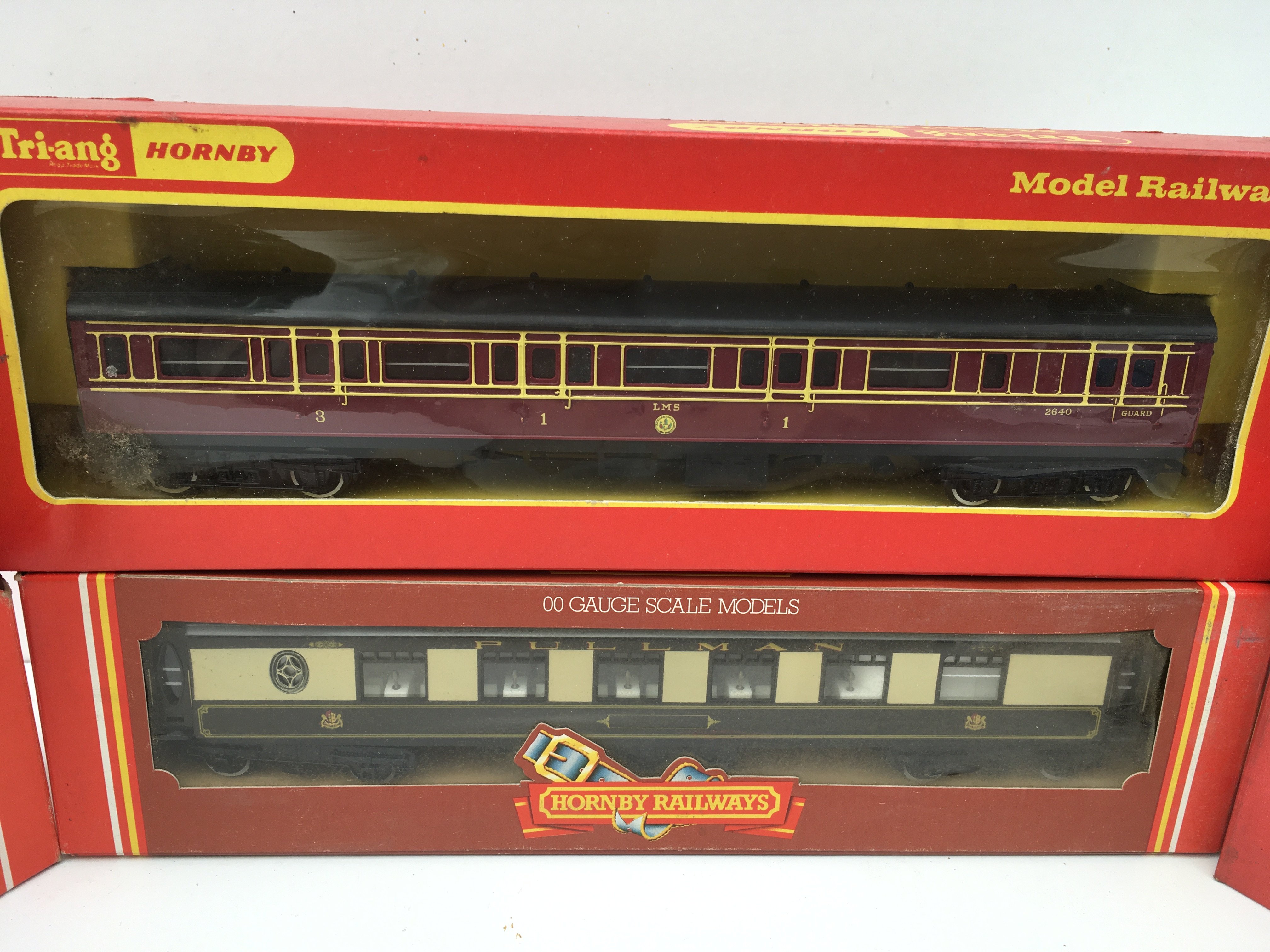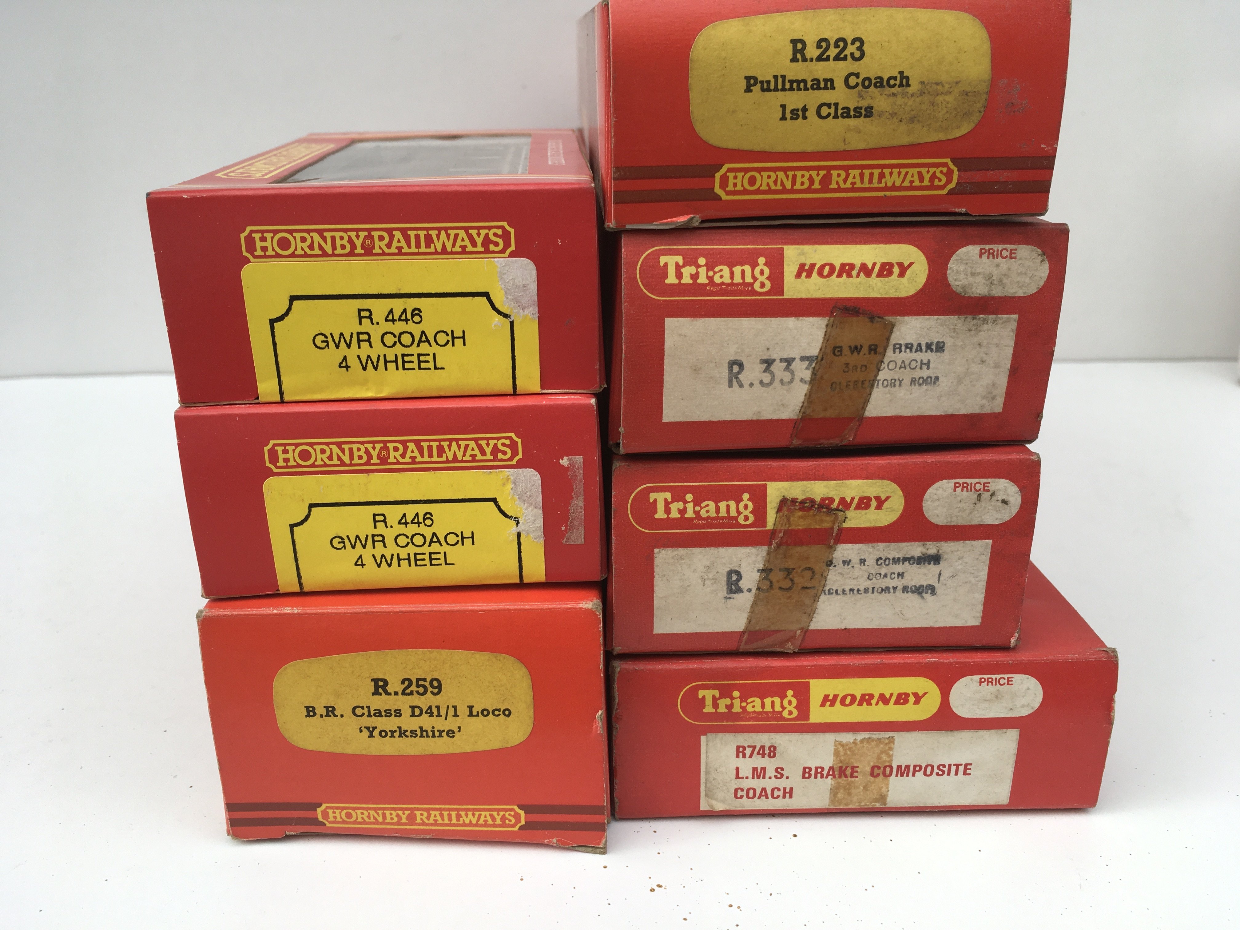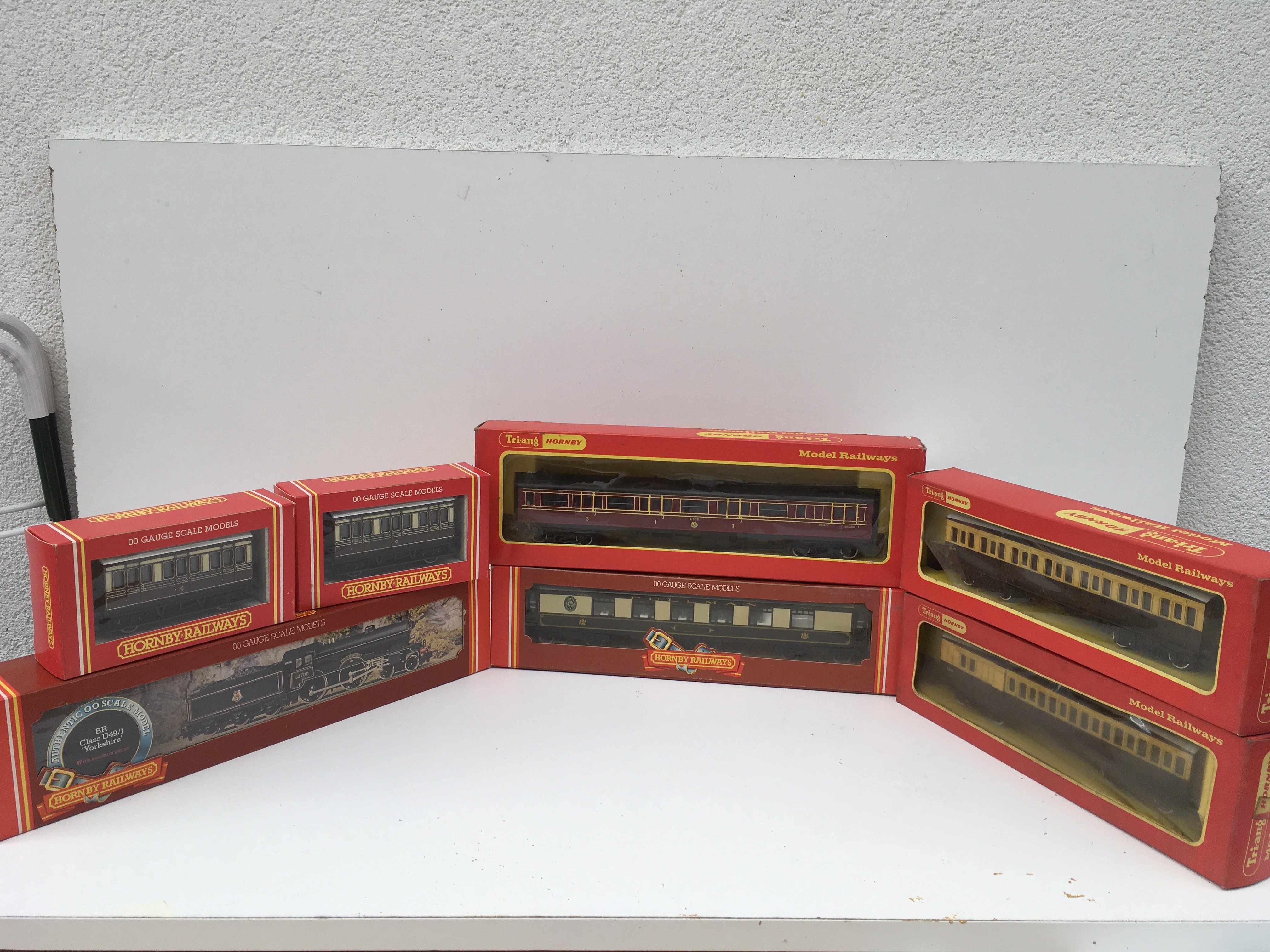 A collection of 7x boxed Hornby OO gauge model railway pieces includes a locomotive R.259 plus 6x coaches. No reserve