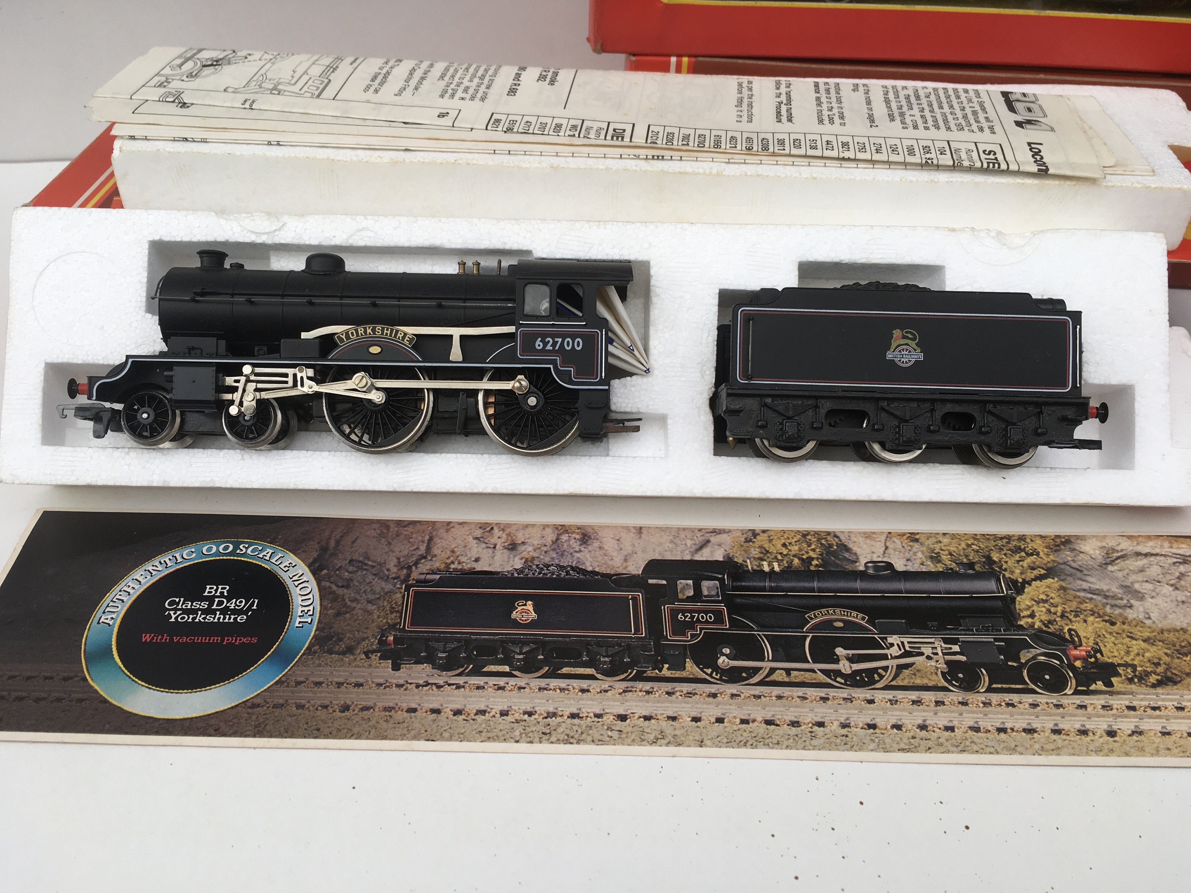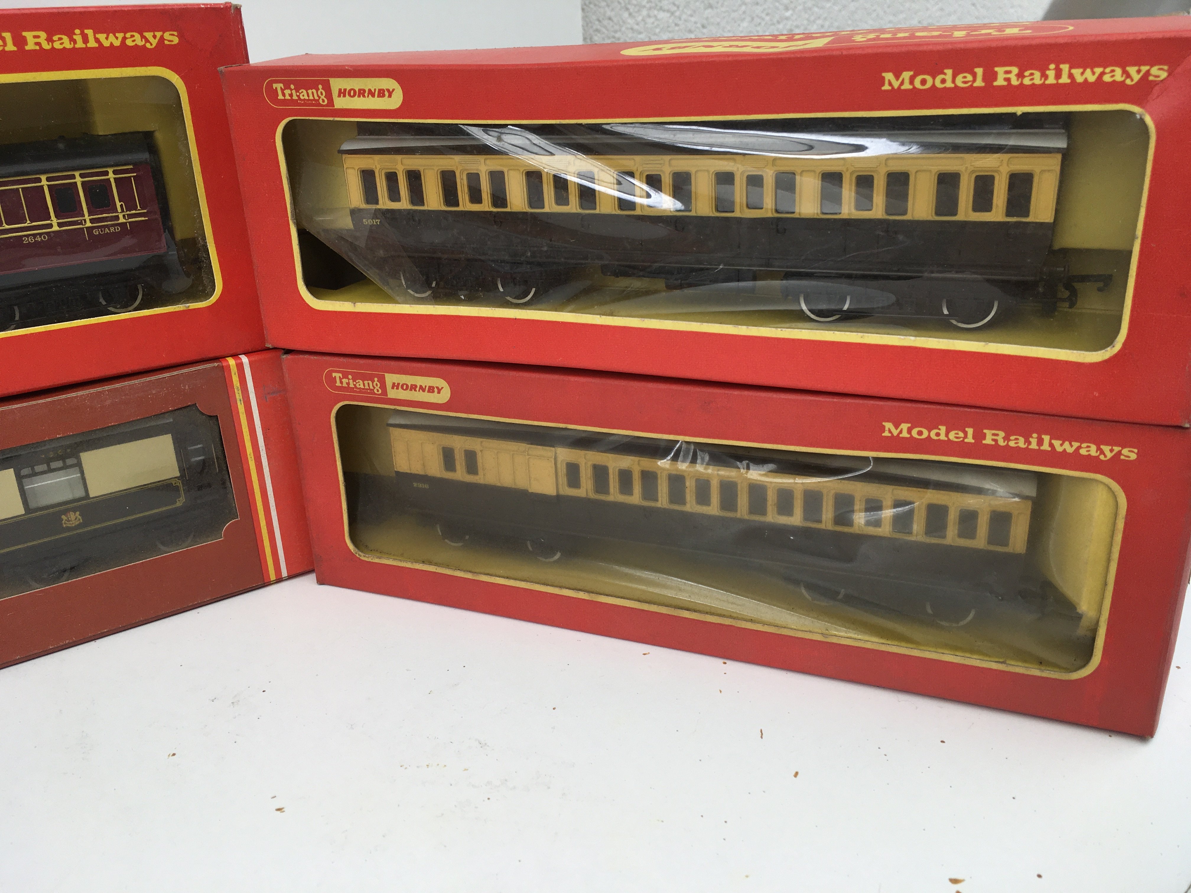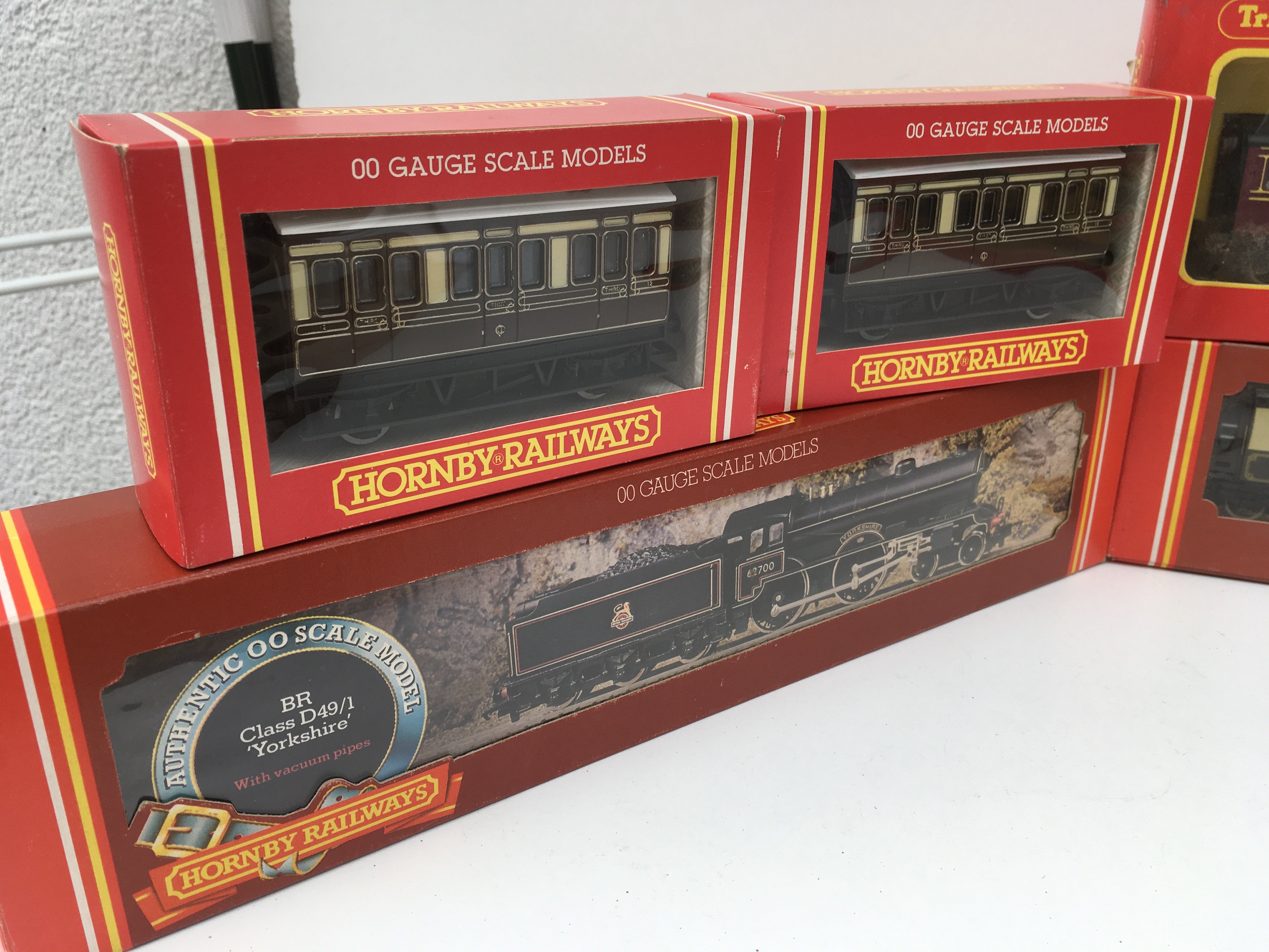 A collection of 7x boxed Hornby OO gauge model railway pieces includes a locomotive R.259 plus 6x coaches. No reserve