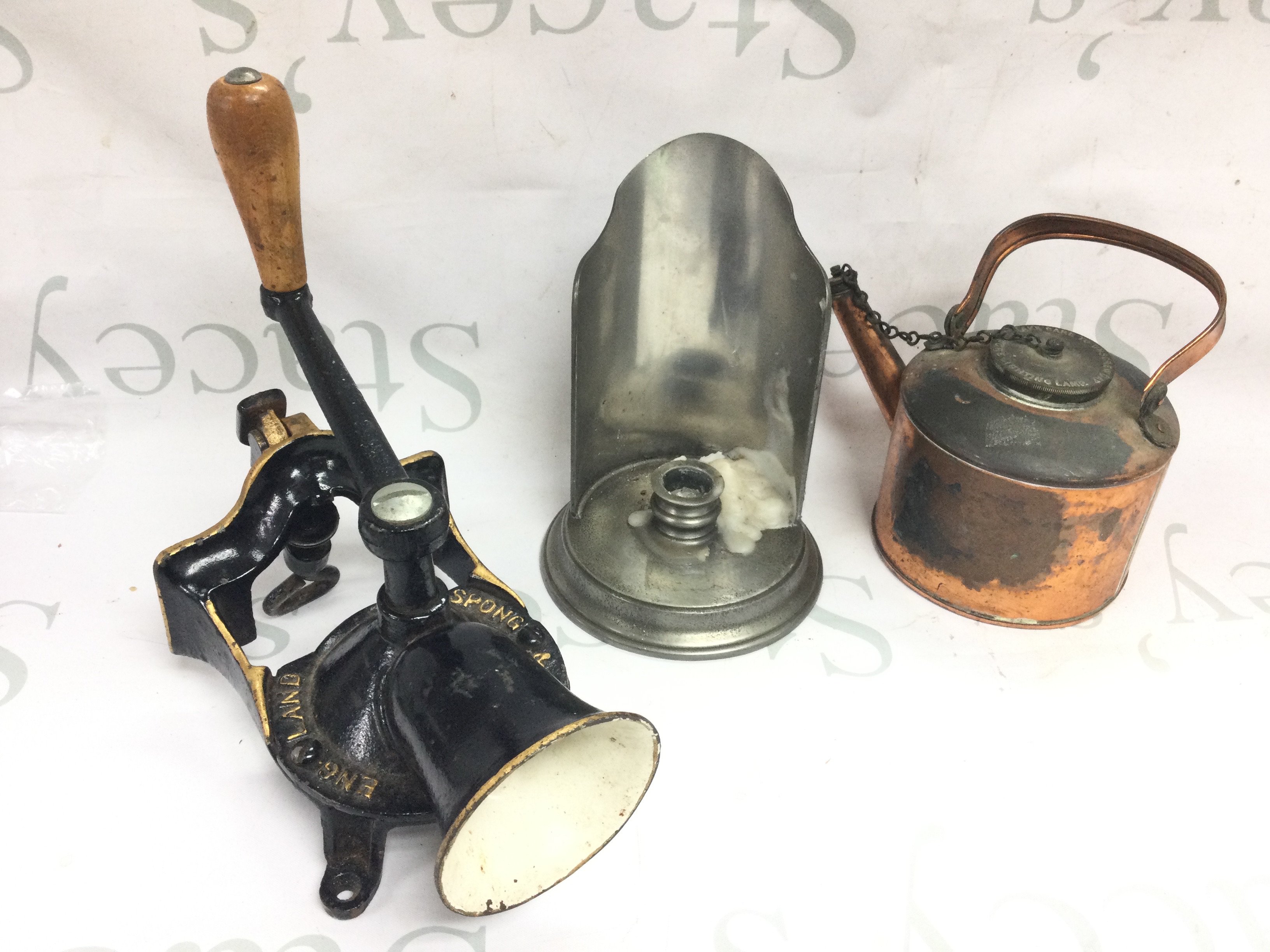 A Vintage Spong coffee grinder , small copper kettle and pewter hand candle stick . Postage category C