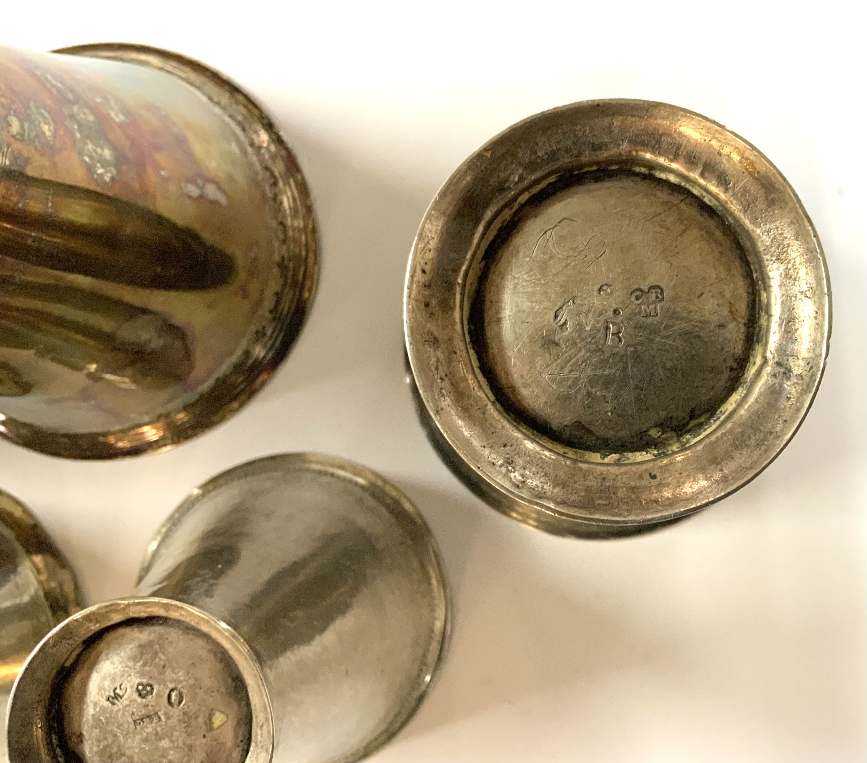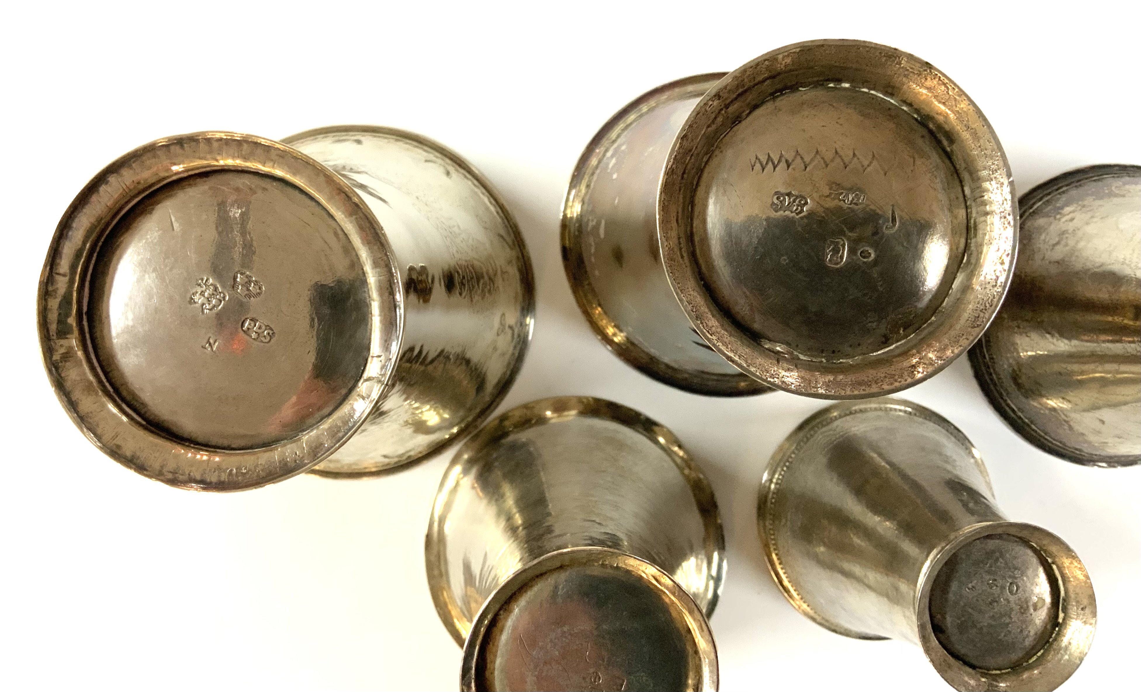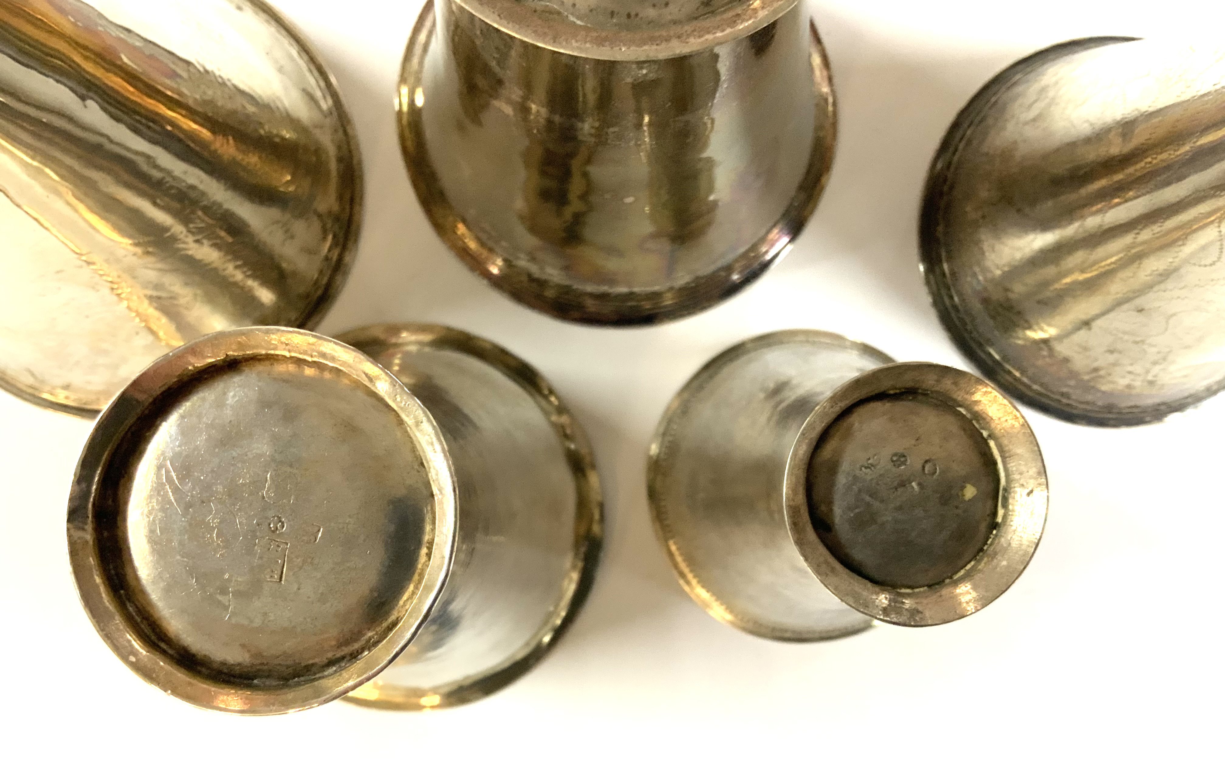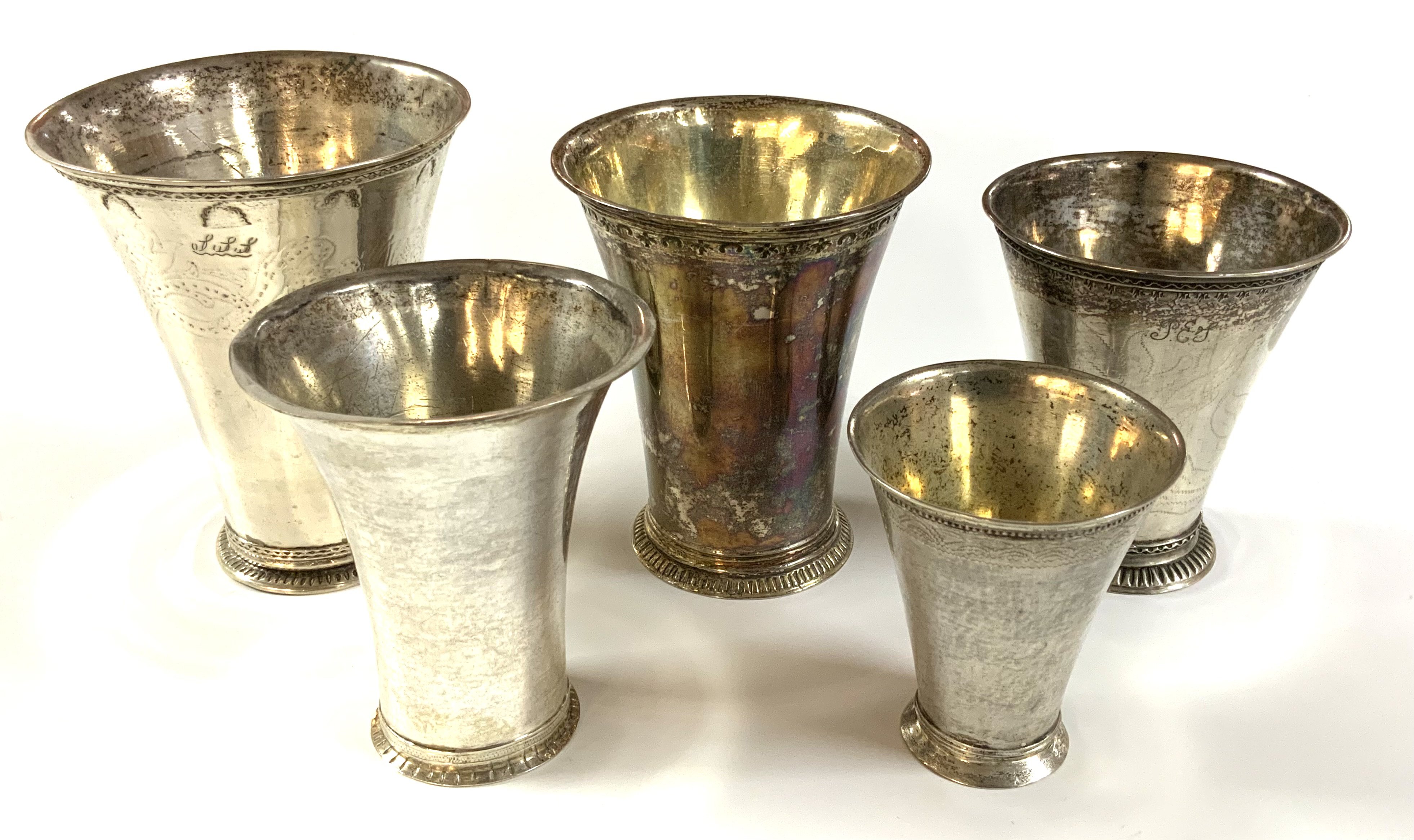 5 various size 18th / 19th Century Swedish silver beakers. Sizes 7cm - 10.5cm.
