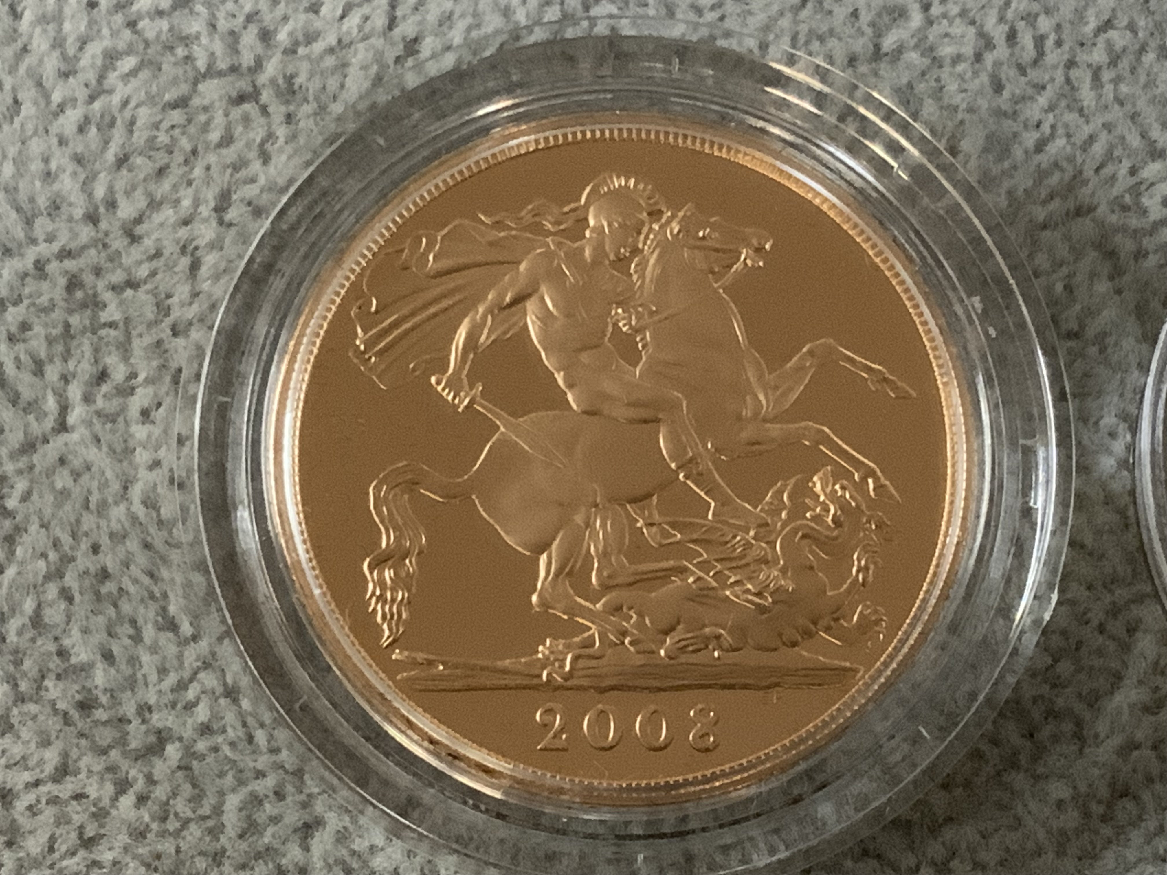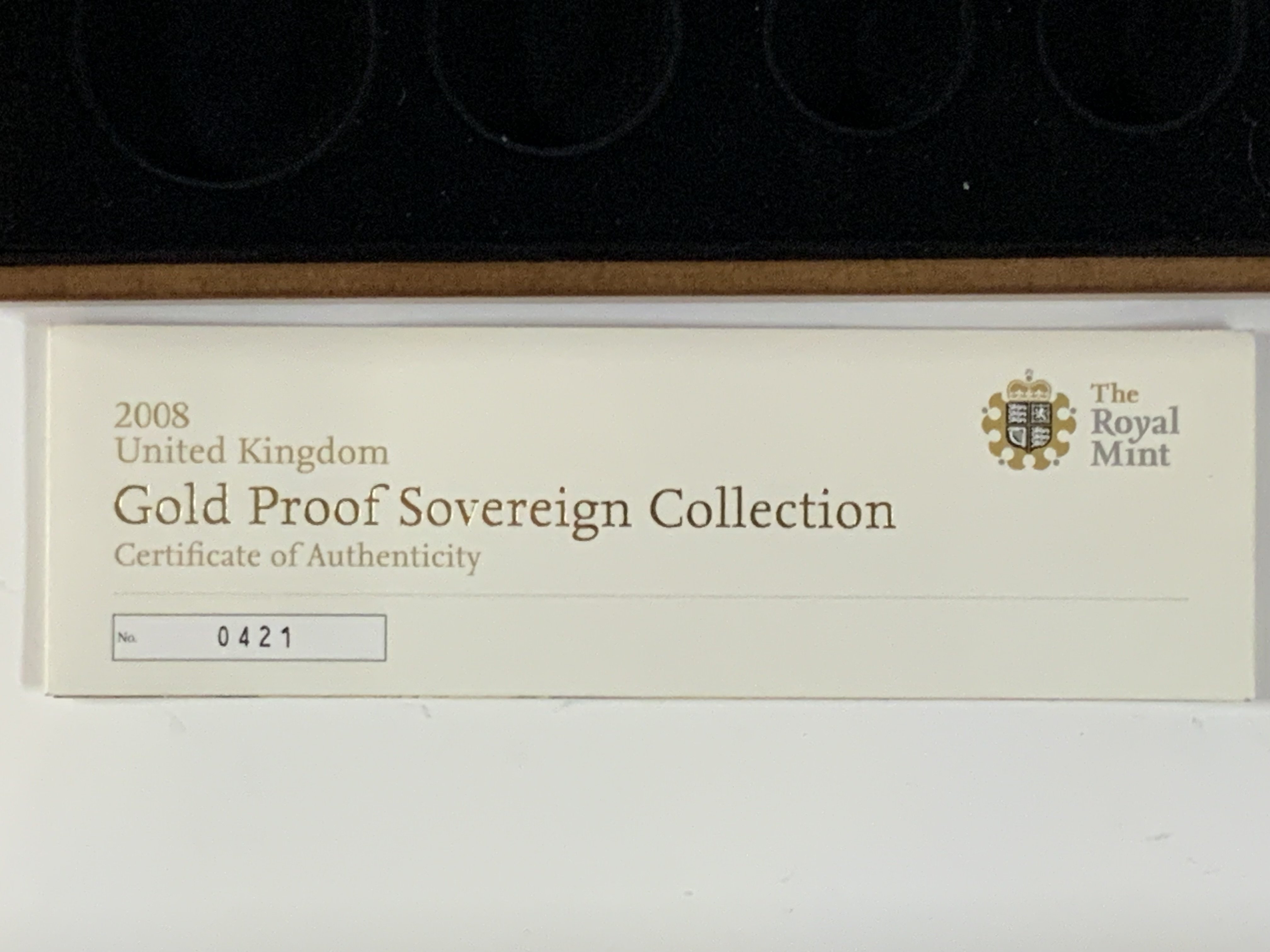 Elizabeth II (1952-2022), gold proof Set, 2008, comprising Five Pounds, Two-Pounds, Sovereign, Half-Sovereign, crowned head right, IRB initials below for designer Ian Rank-Broadley. 0421/1750.