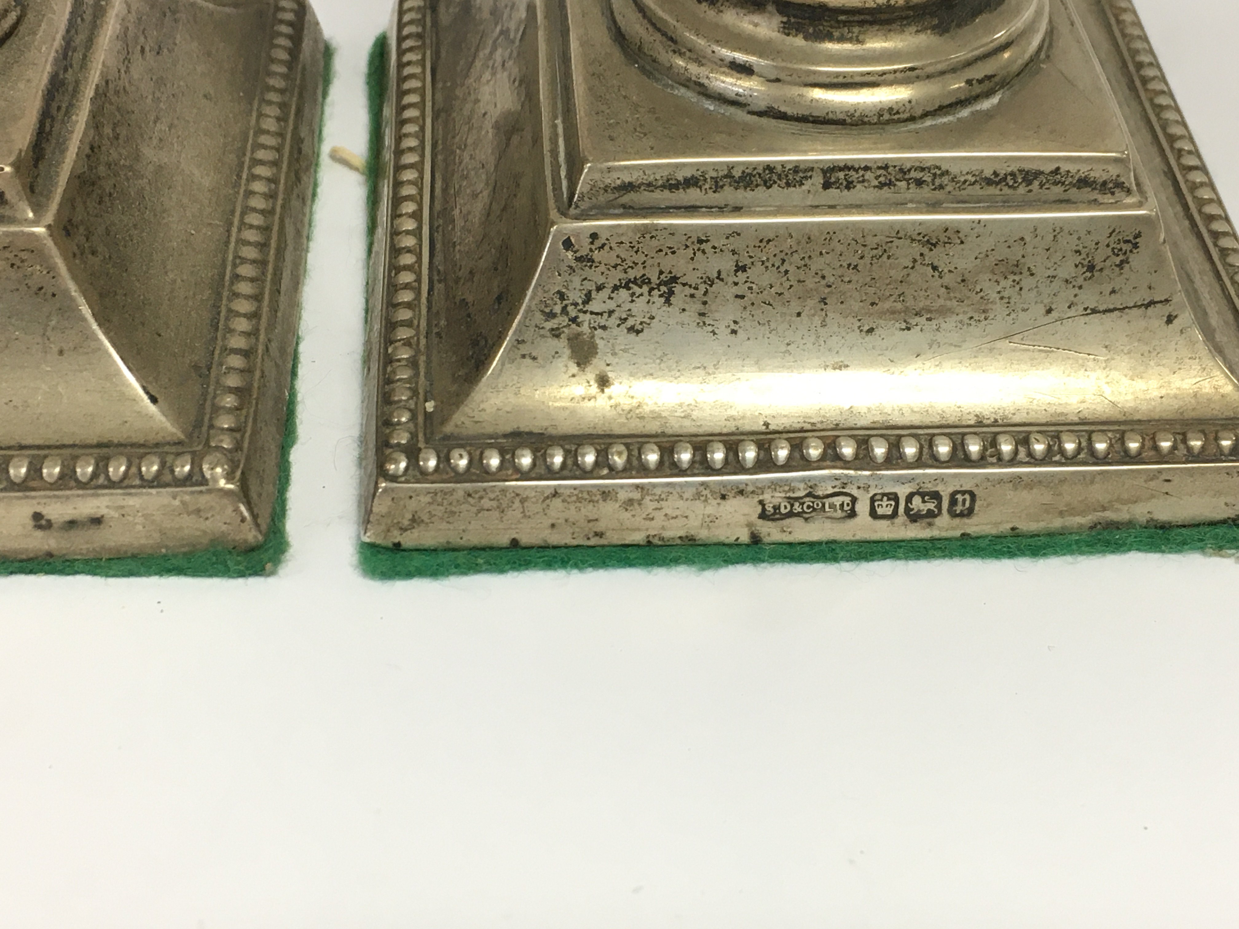 A pair of hallmarked silver column candle stick holders. Approximately 13cm and approximately 600g
