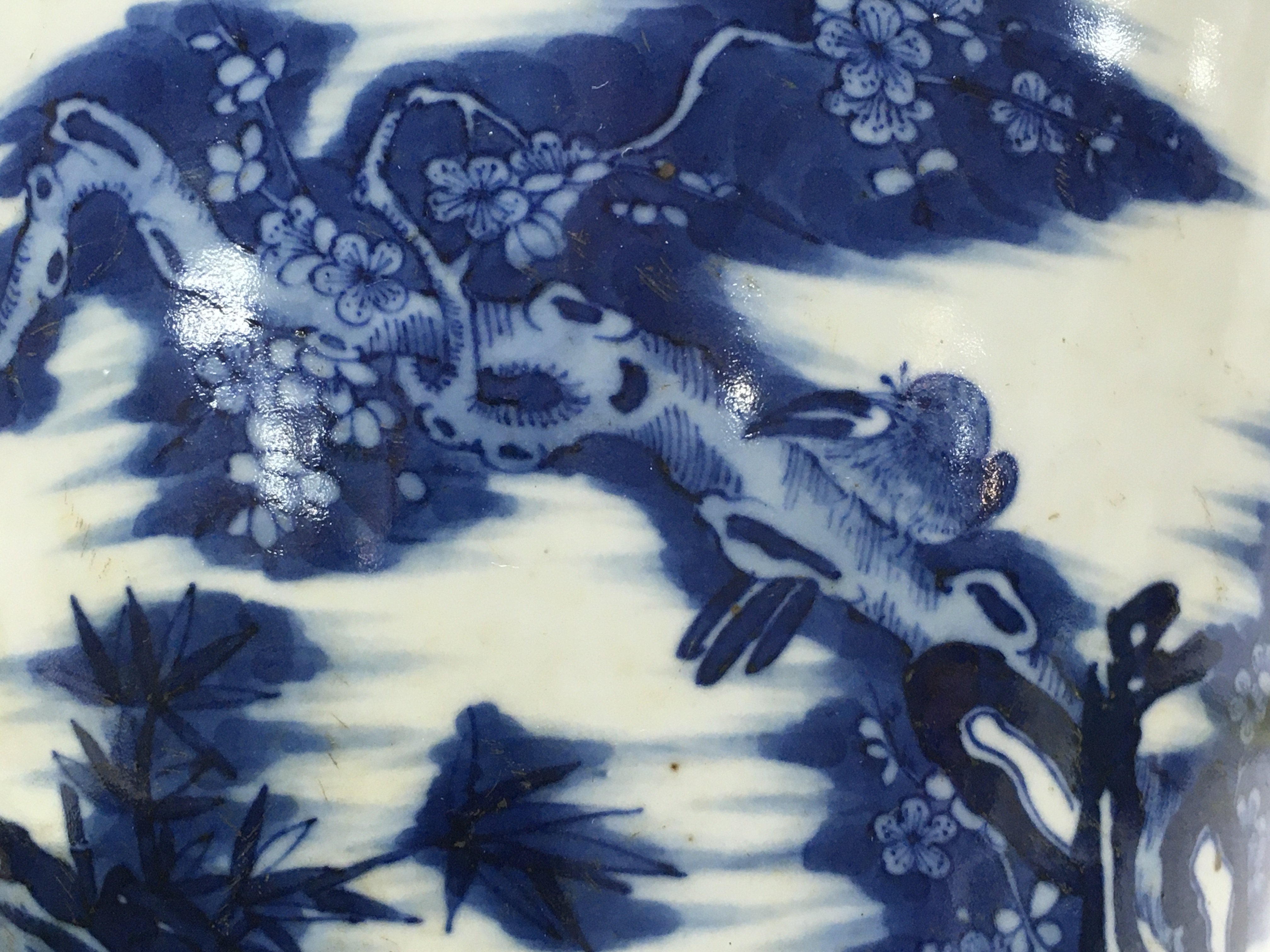 A Chinese blue and white planter bowl decorated with birds perched on cherry blossom trees. 11.5cm tall 21cm wide Approx . This lot cannot be posted