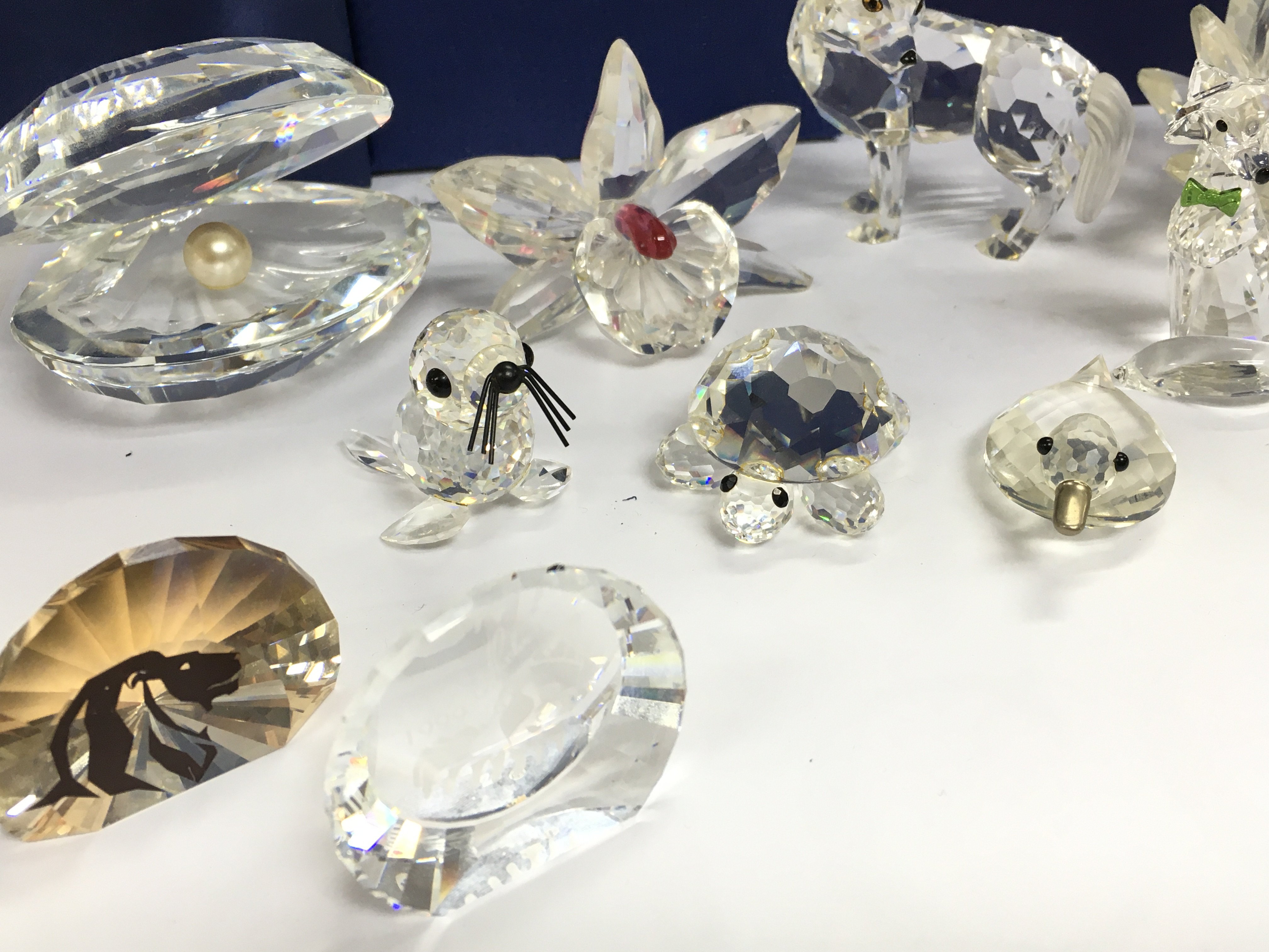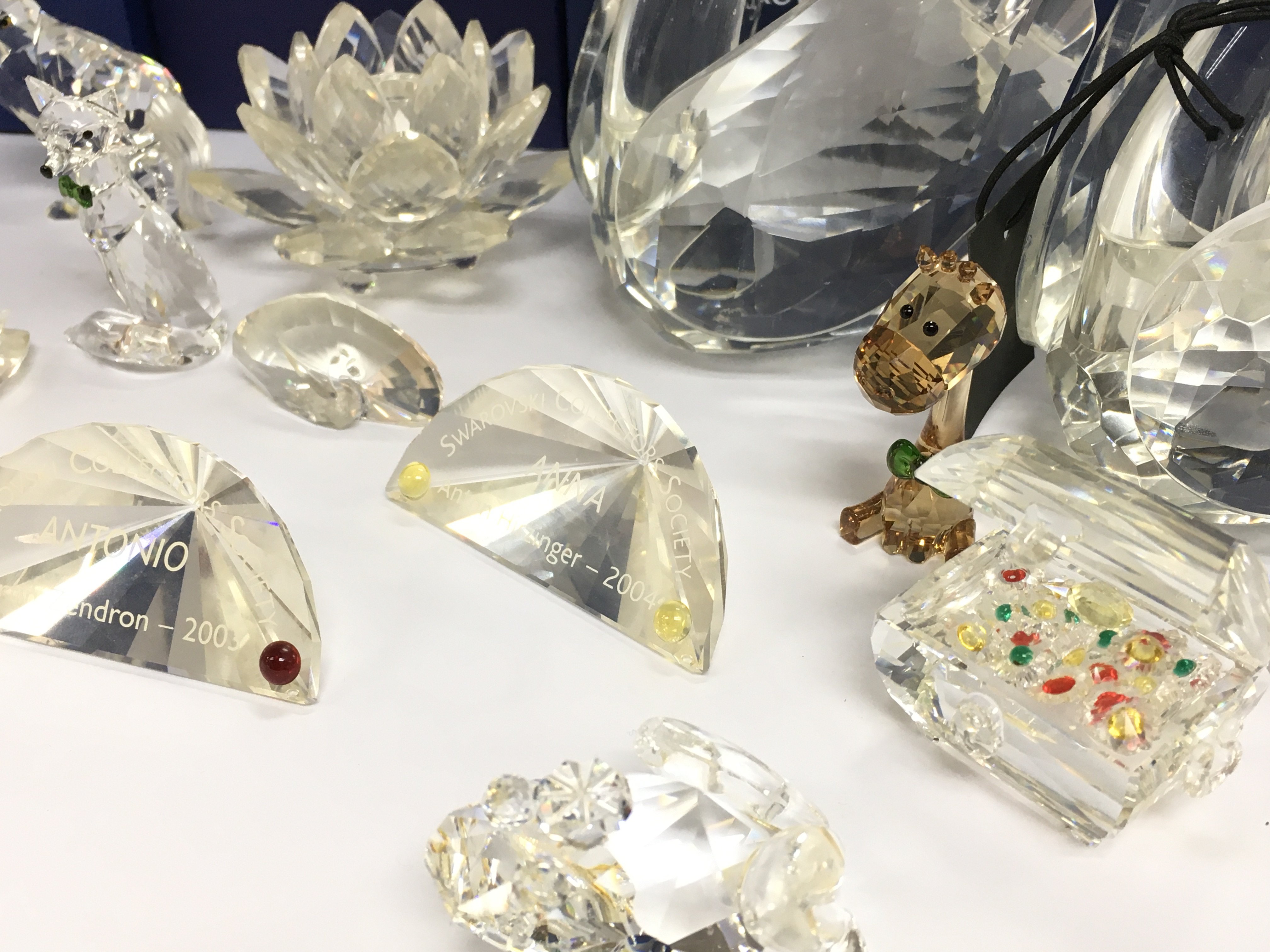 A collection of Swarovski crystal glass figures including Shell with pearl, Orchard pink, Wolf, Artic fox, water lily, Treasure chest etc. some boxed and also Julien Macdonald swan figures. This lot cannot be posted
