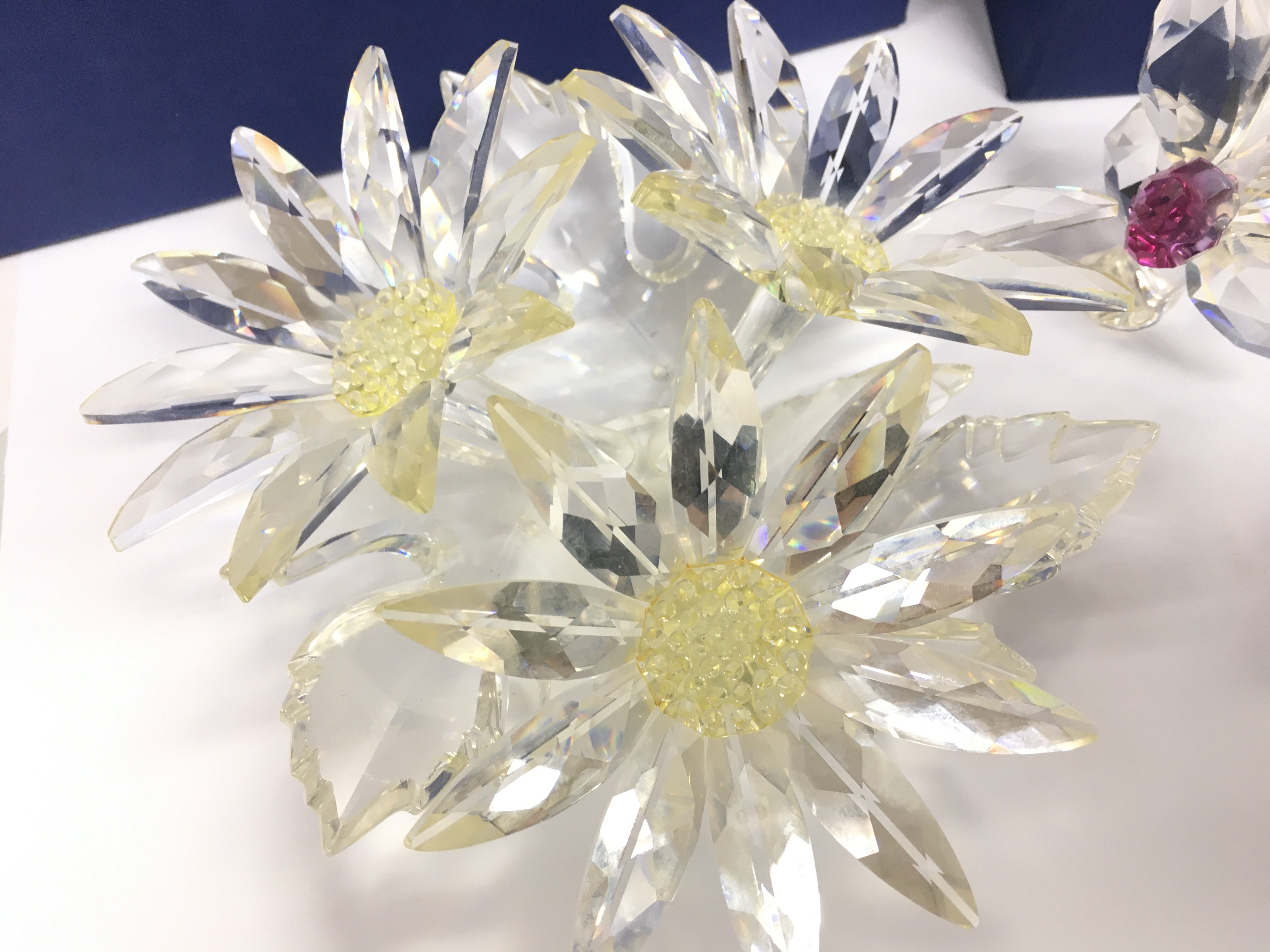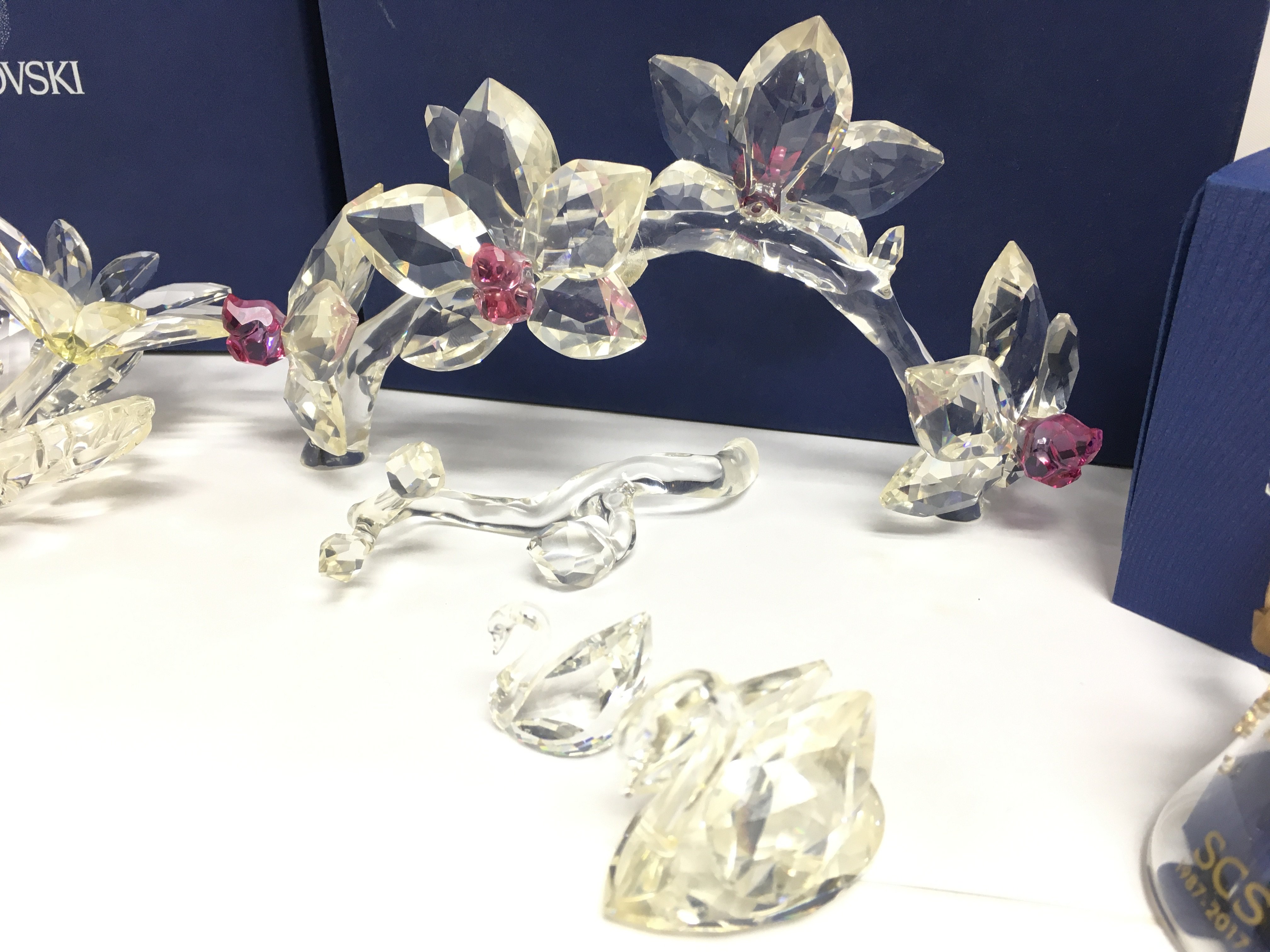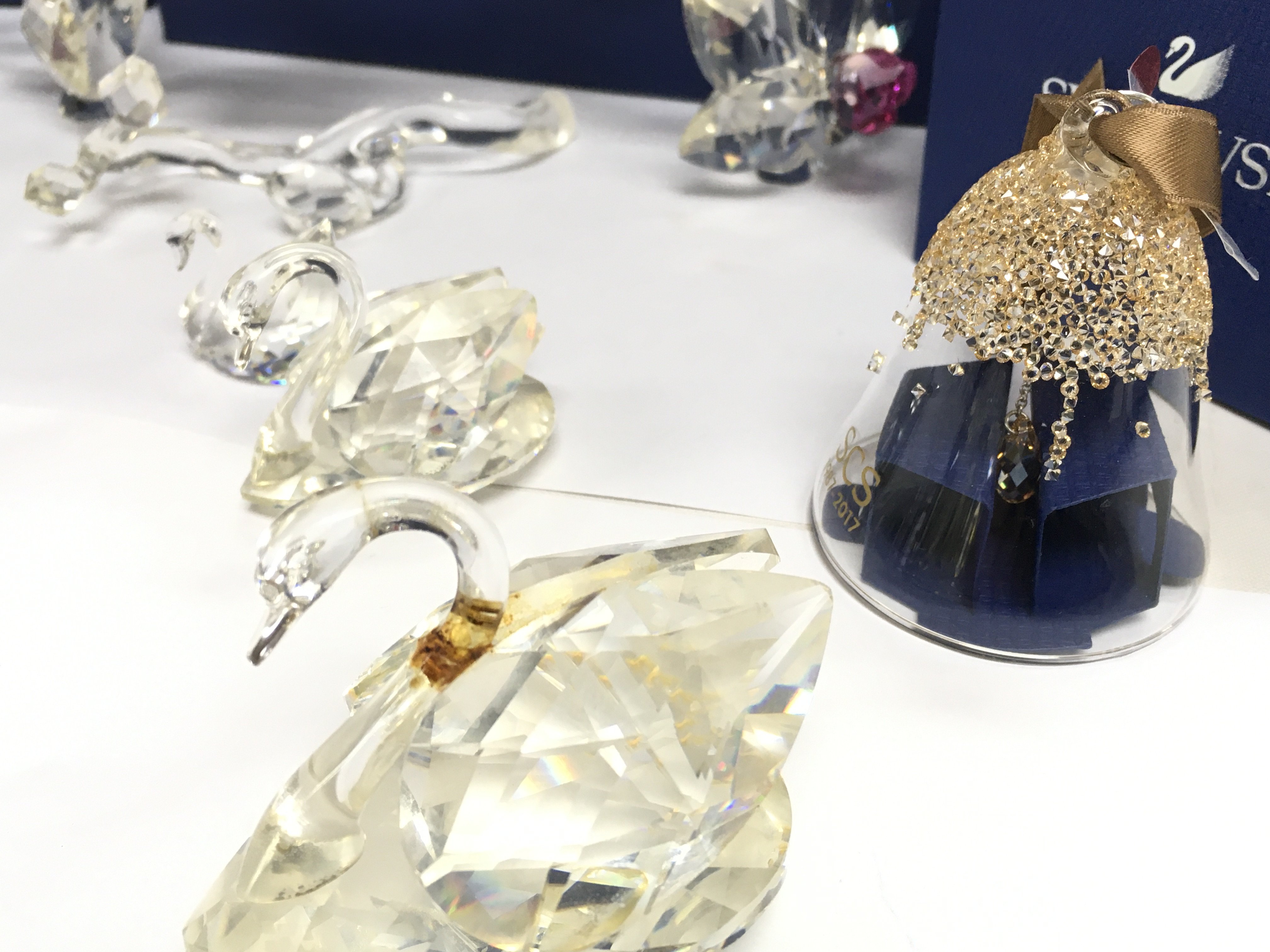 A collection of Swarovski including boxed Orchids on vine ( part needs re gluing ) , Maxi Flower, Christmas bell ornament, swans . This lot cannot be posted