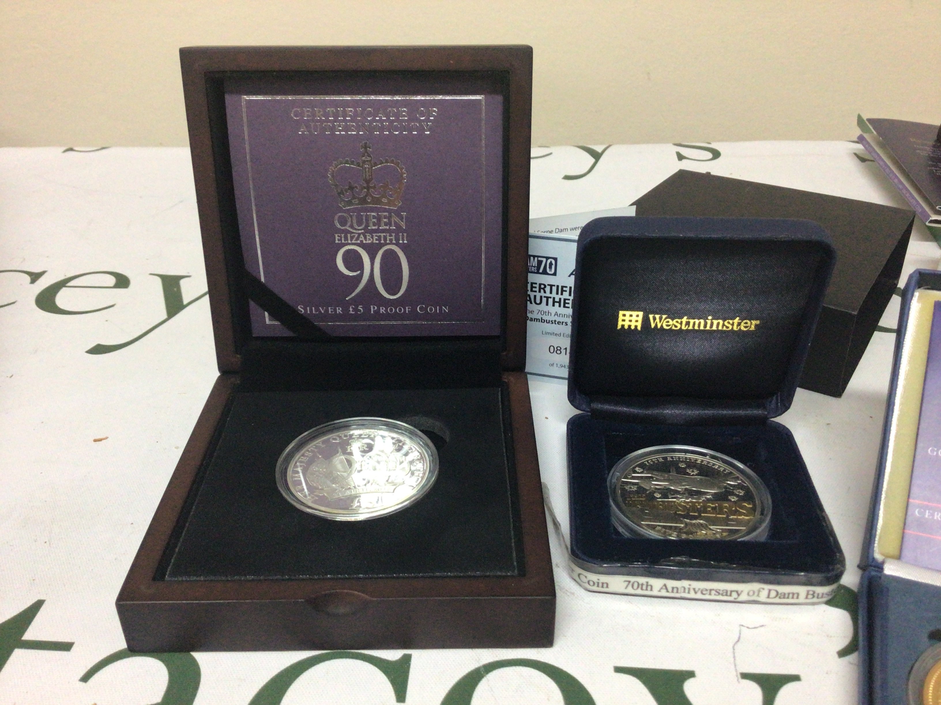 Two Silver Proof Five pound coins The Dambusters 70th Anniversary Queen Elizabeth II 90th birthday coin and gold plated coin 23 June 2016 The Landmark of British independence.