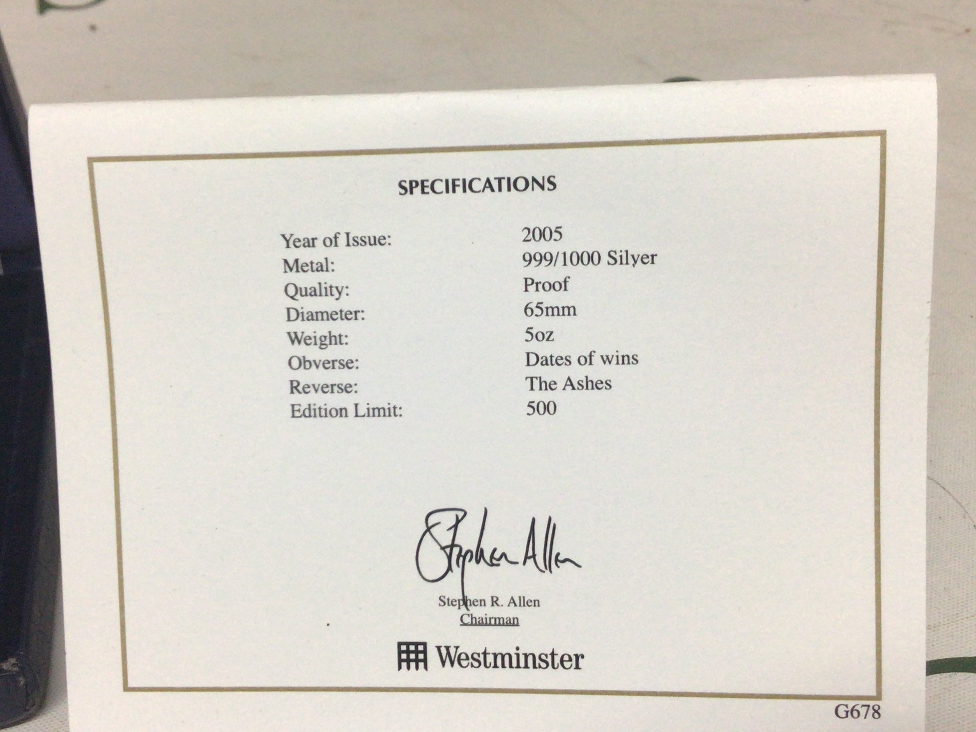 A silver Five Ounce 2005 Commemorative The Ashes Winners in a fitted case with certificate of authenticity.