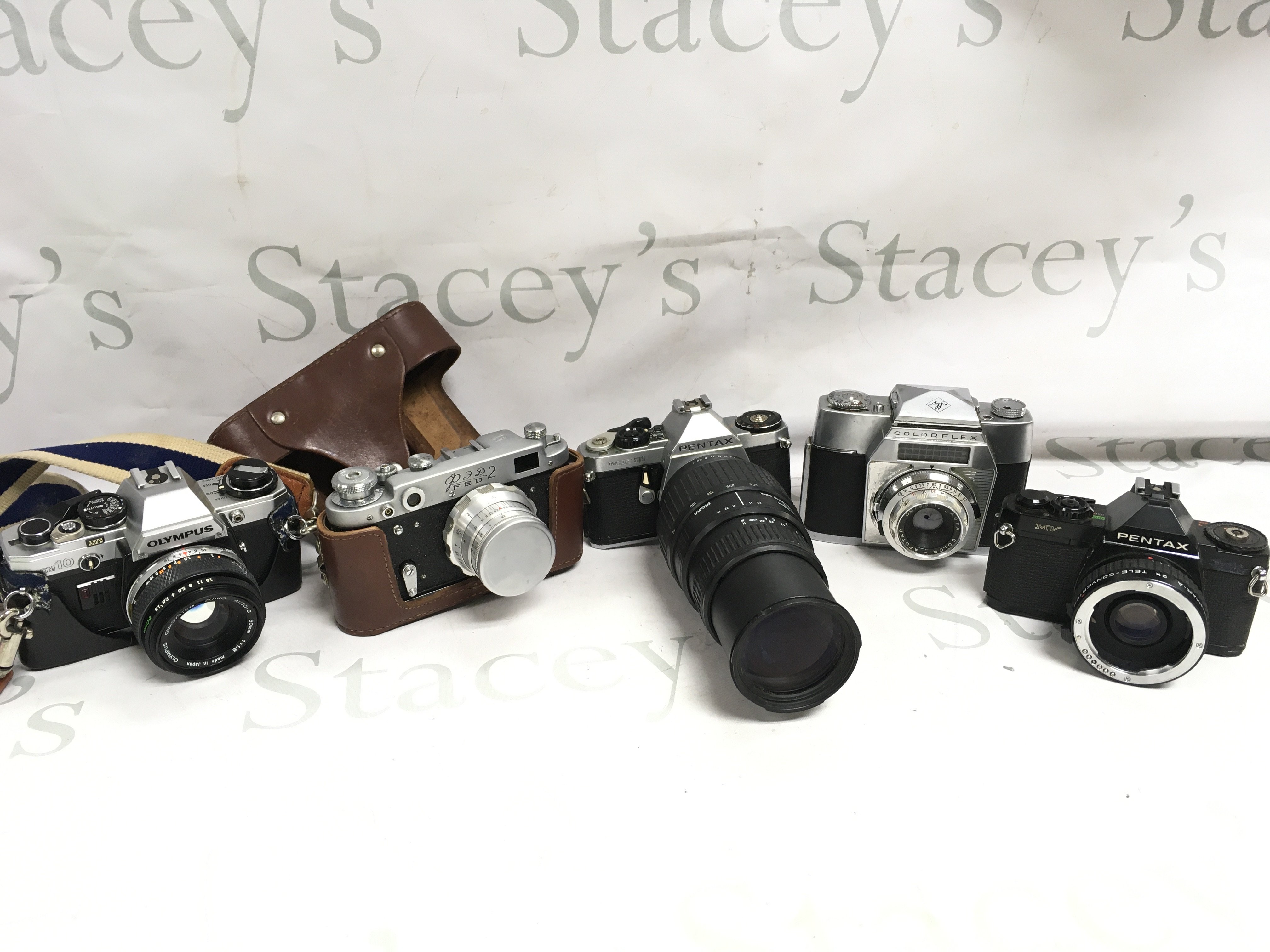Five vintage SLR cameras including an Olympus, Pentax, Agfa, Rare Russian FED 2 . Postage category c
