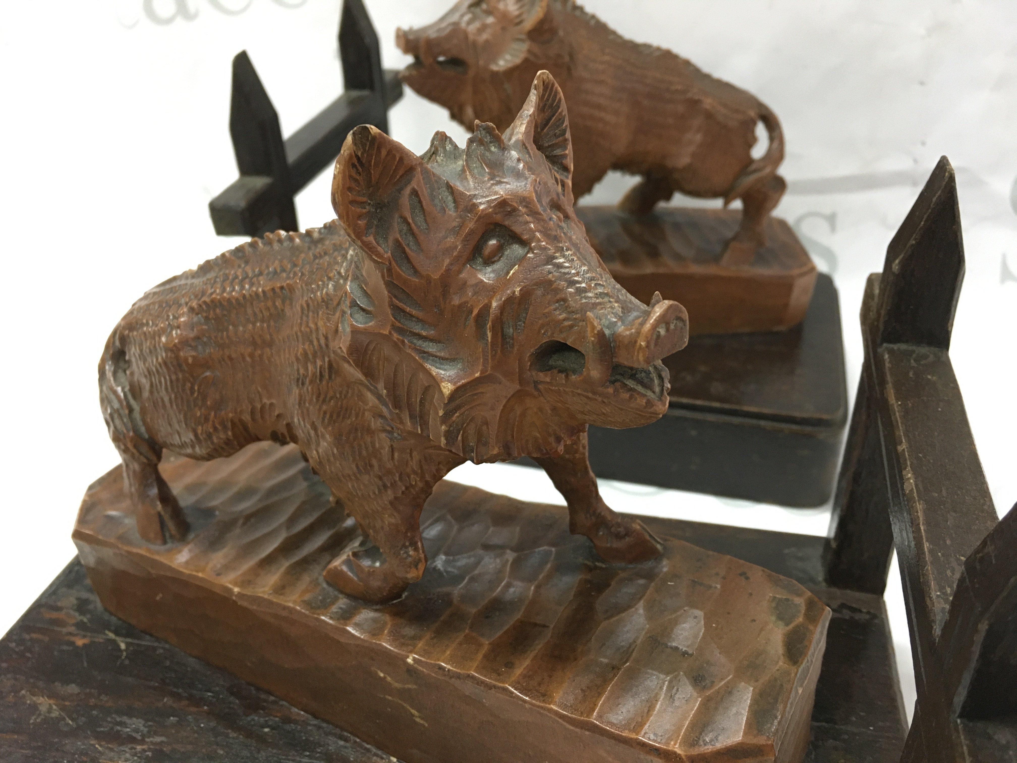 A pair of black forest carved book ends in the form of wild boars ,19.5cm tall 24cm wide . Postage cat C
