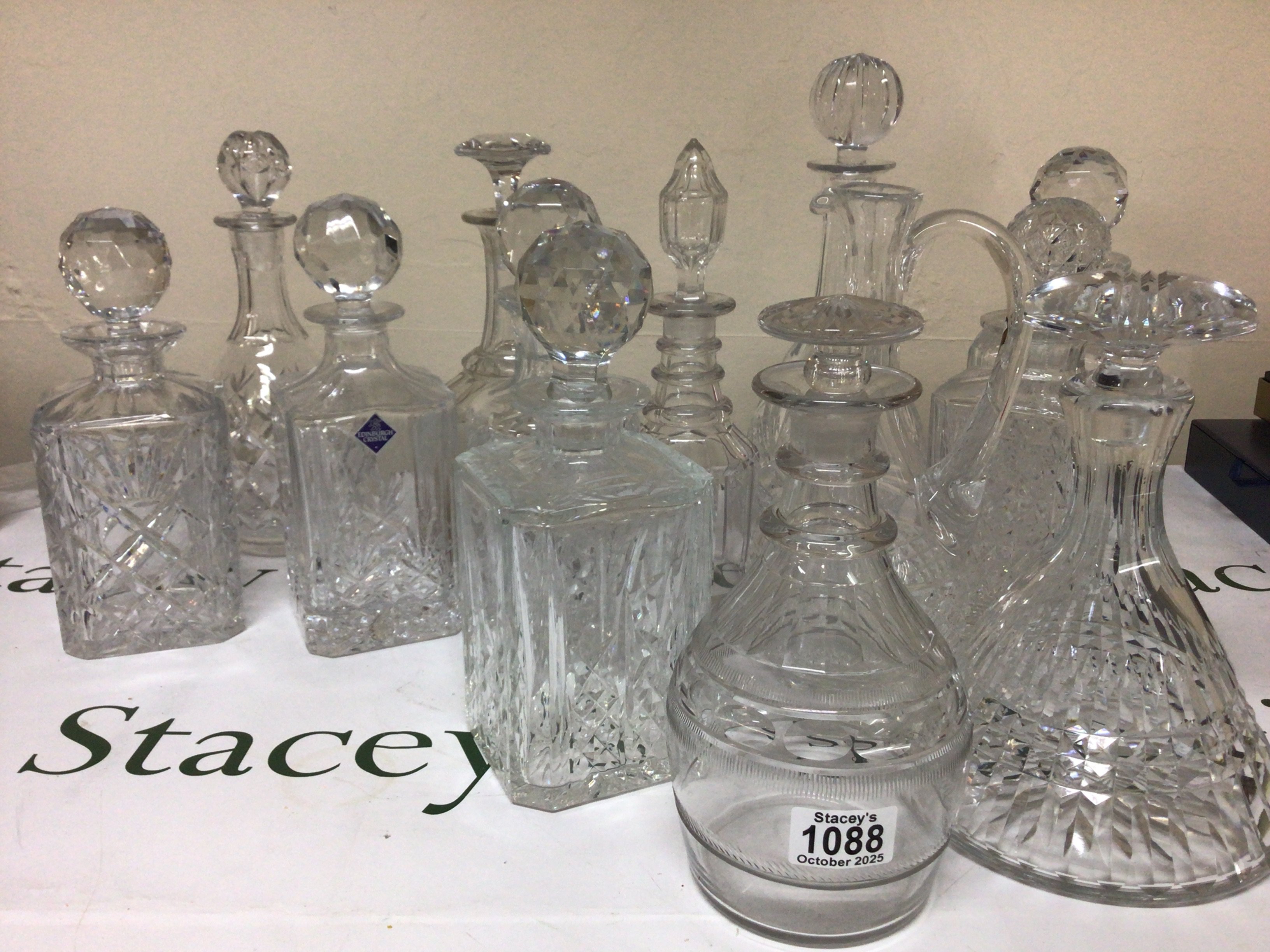 A good collection of cut glass decanters including a late George III decanter with a mushroom. Edinburgh Crystal and many others. NO RESERVE