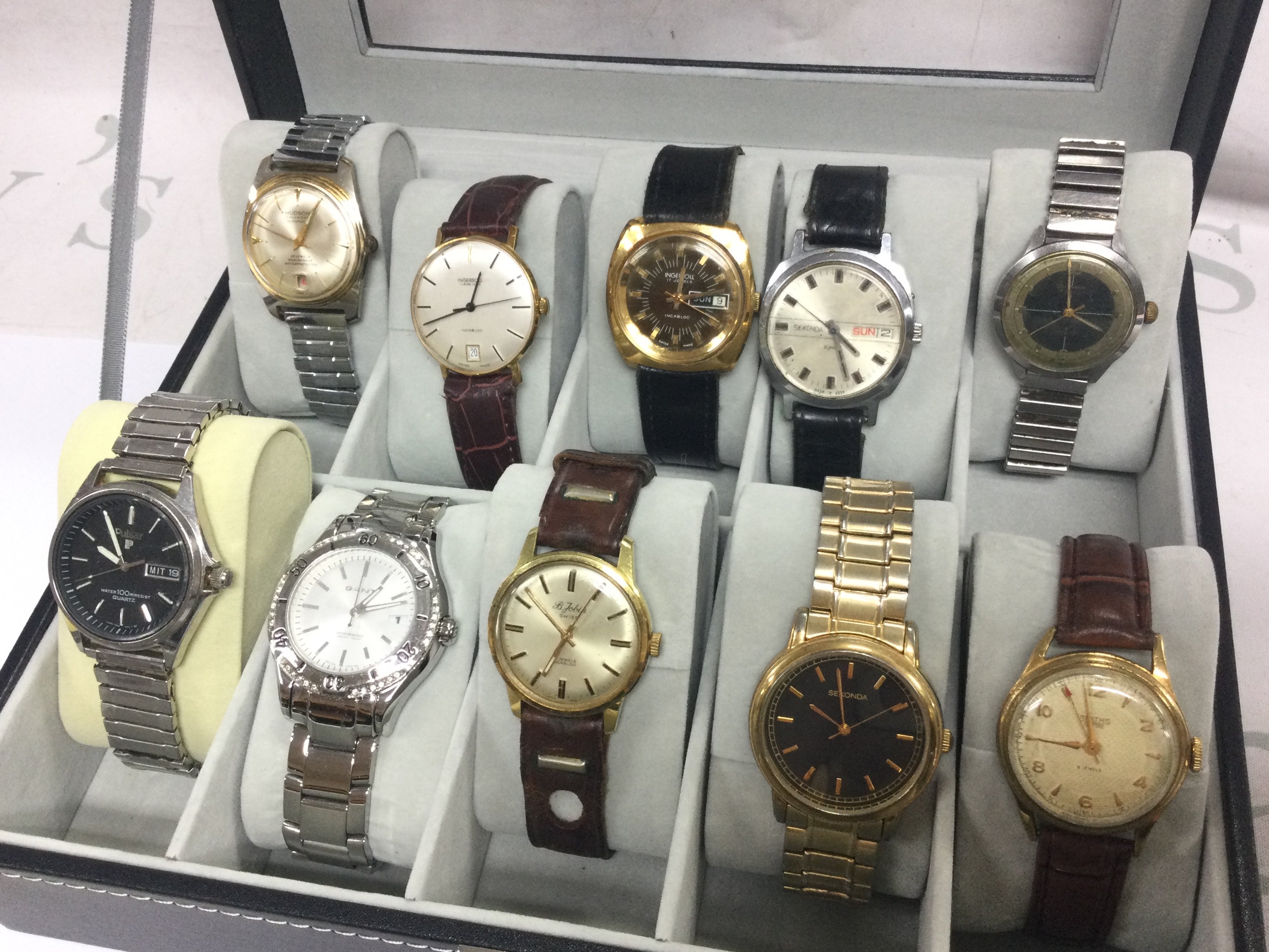 Ten Vintage mens watches , all seen working including Sekonda , Ingersol, Smiths, Pulsar, Hudson. Postage category B