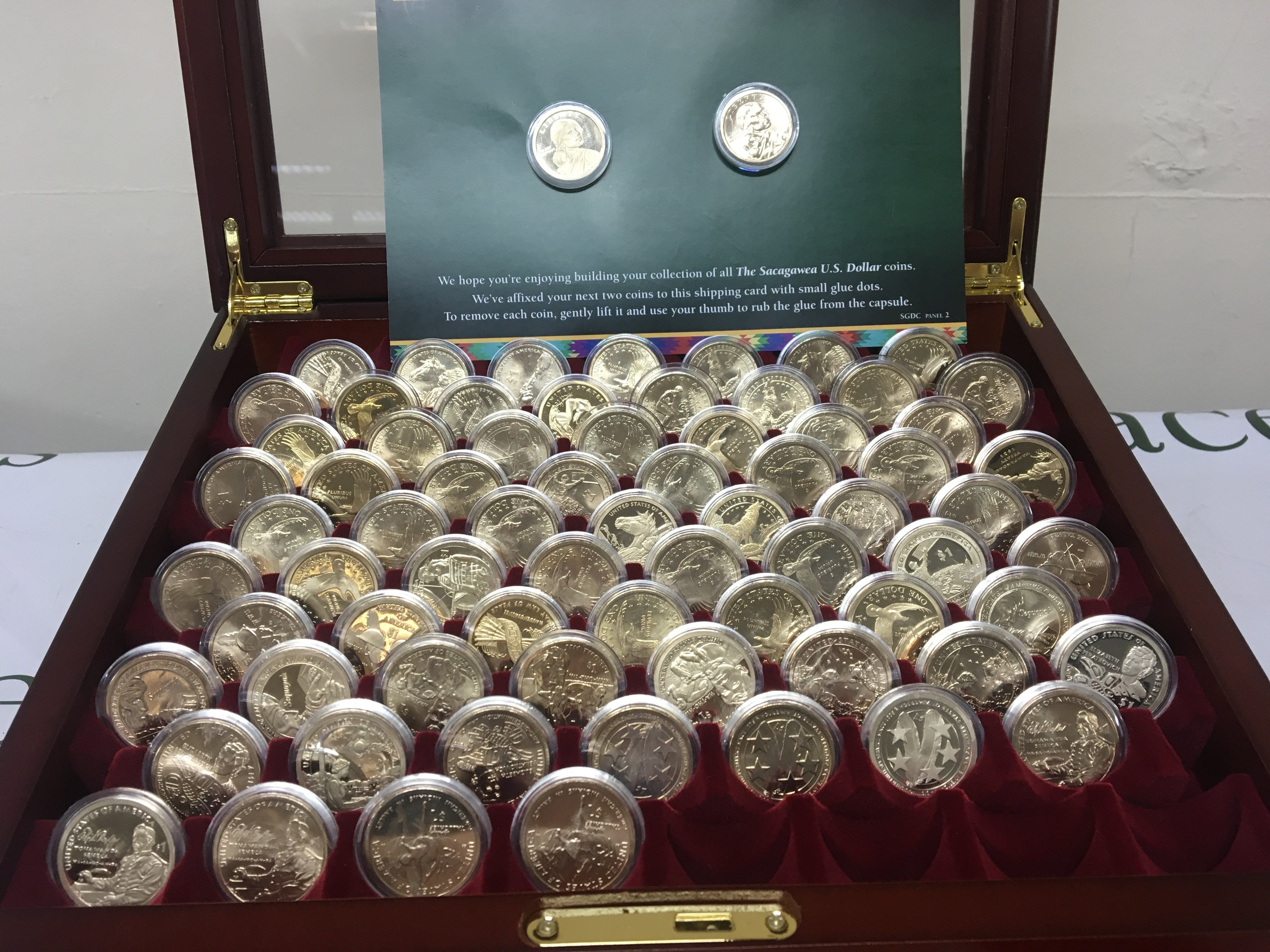 A case set of near complete of American Sacagawea Dollars in a well presented lined and fitted case each coin in mint condition and in clear capsule cases.