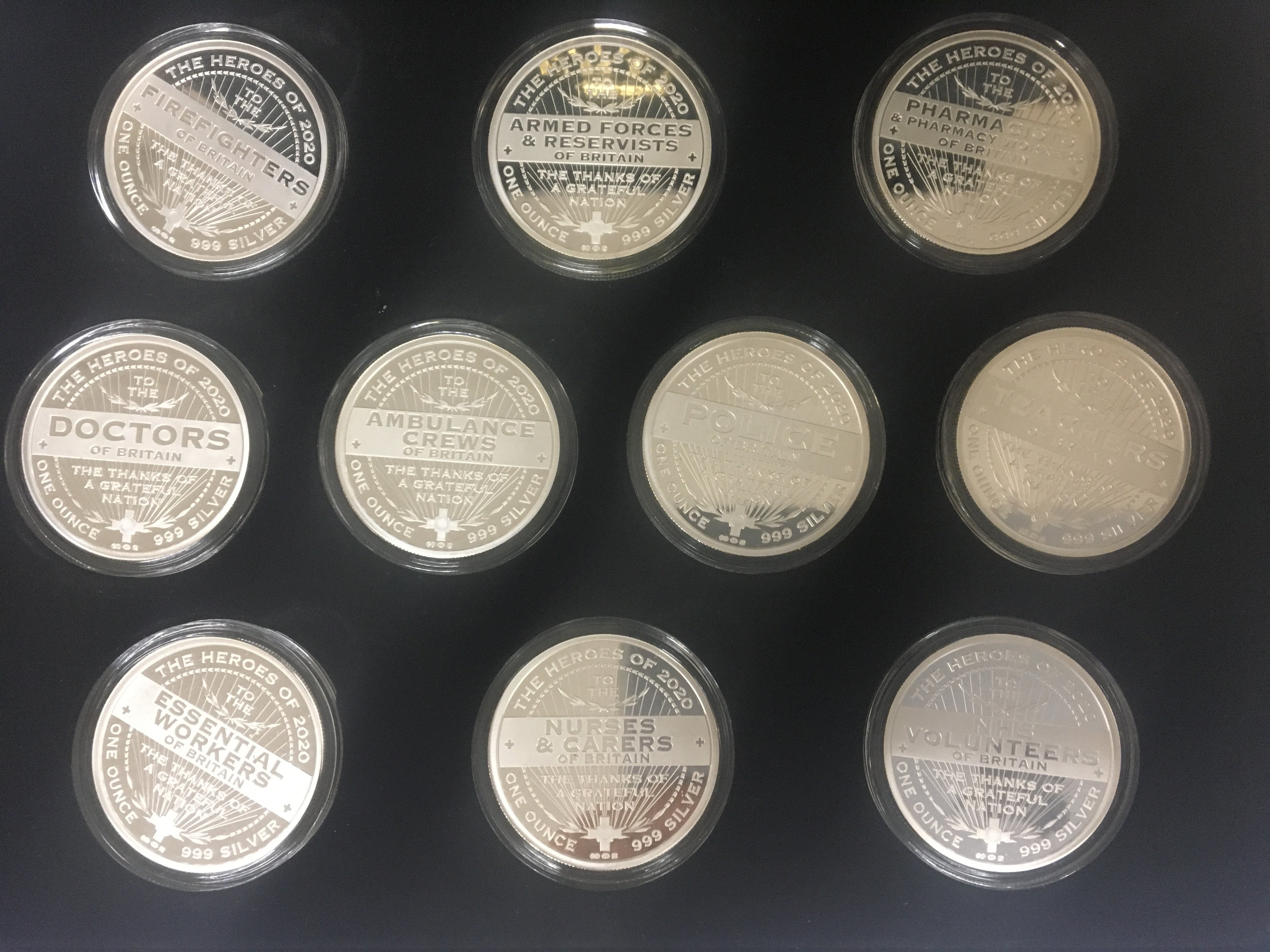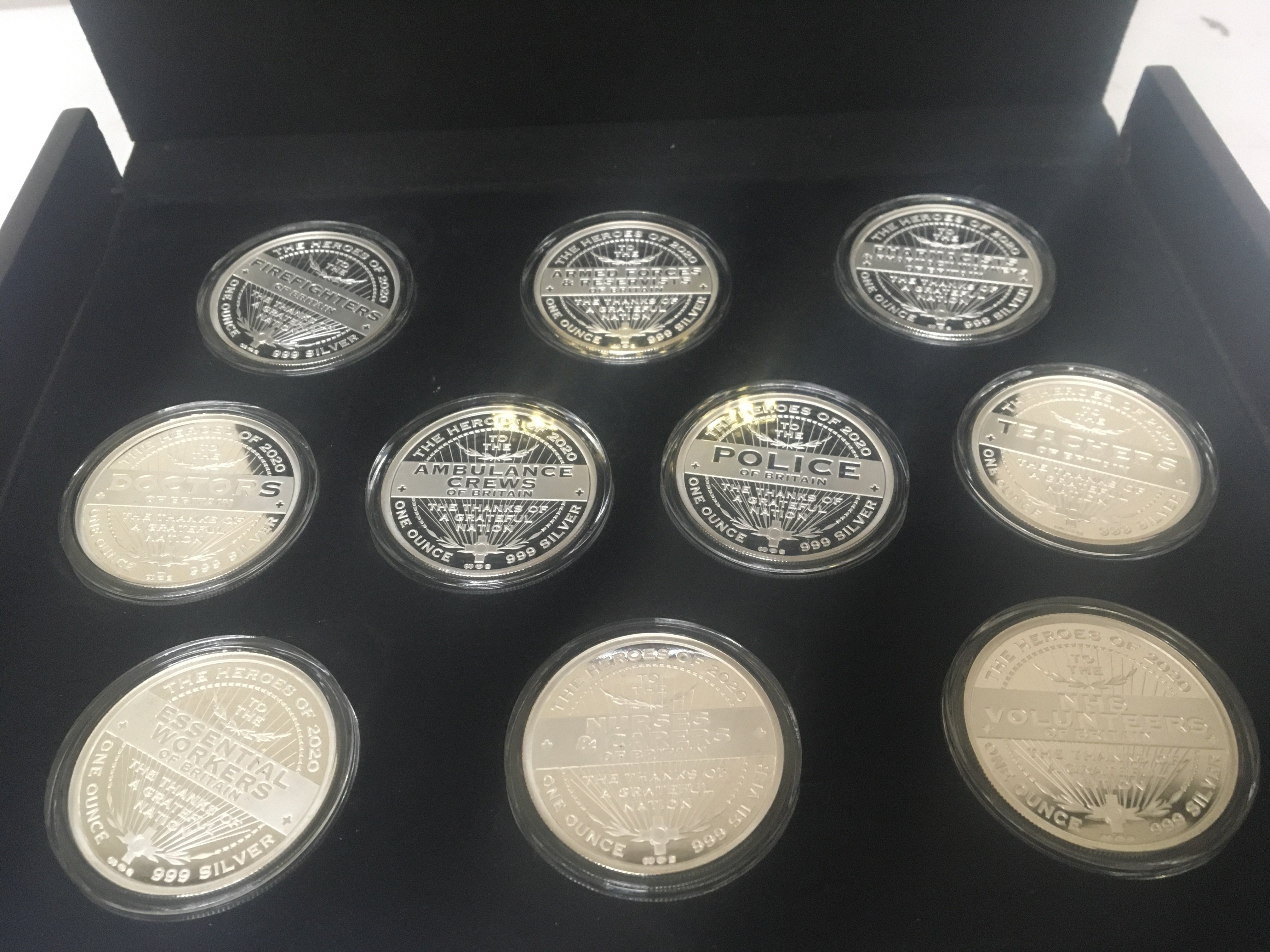 A case containing a Celebration of Hero۪s Silver proof one ounce silver coin collection of ten coins Covid 19 coin collection. In a well presented fitted box with card.