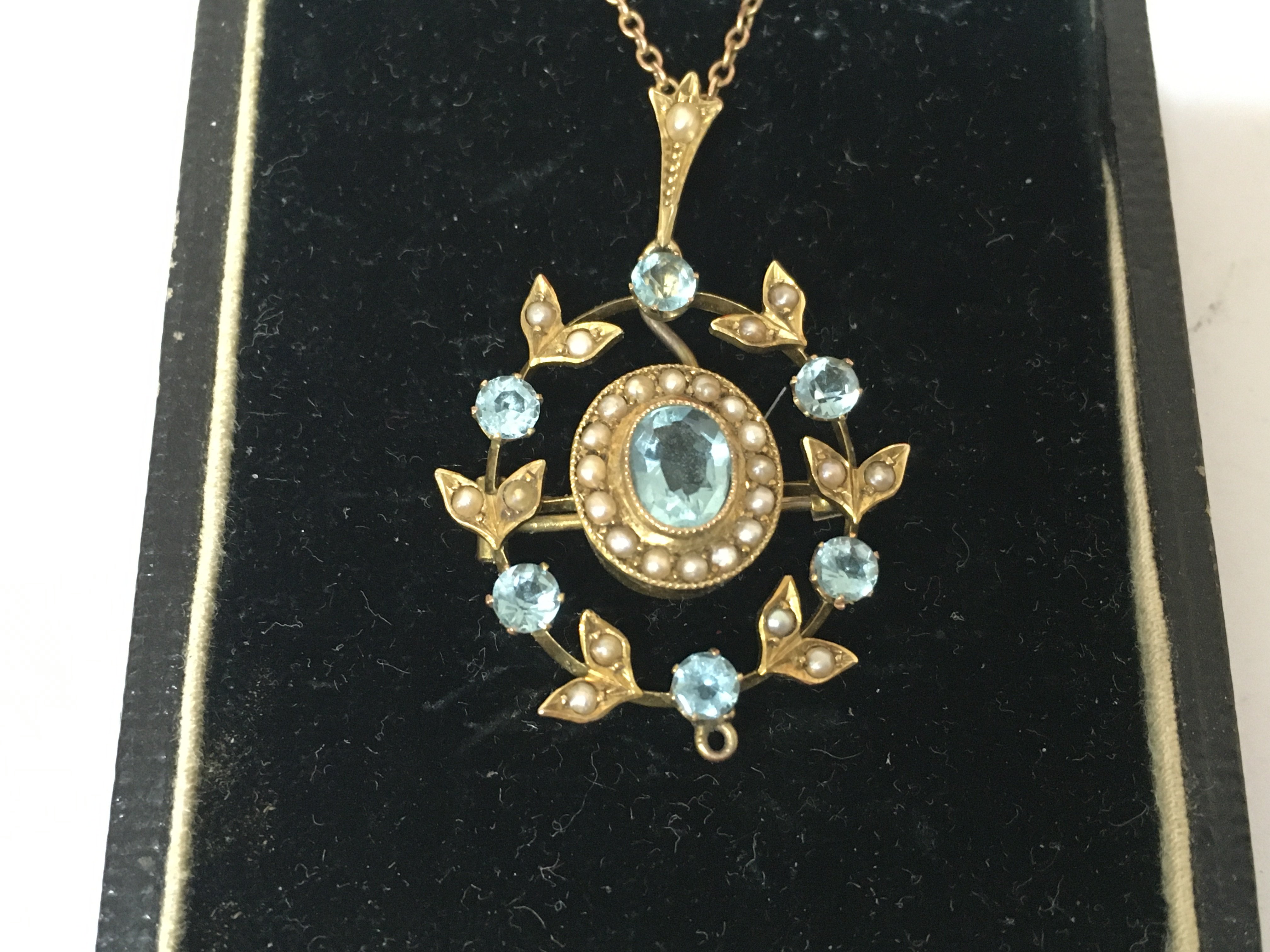 An Edwardian 9ct seed Pearl and aquamarine pendant on 9ct chain. Postage B