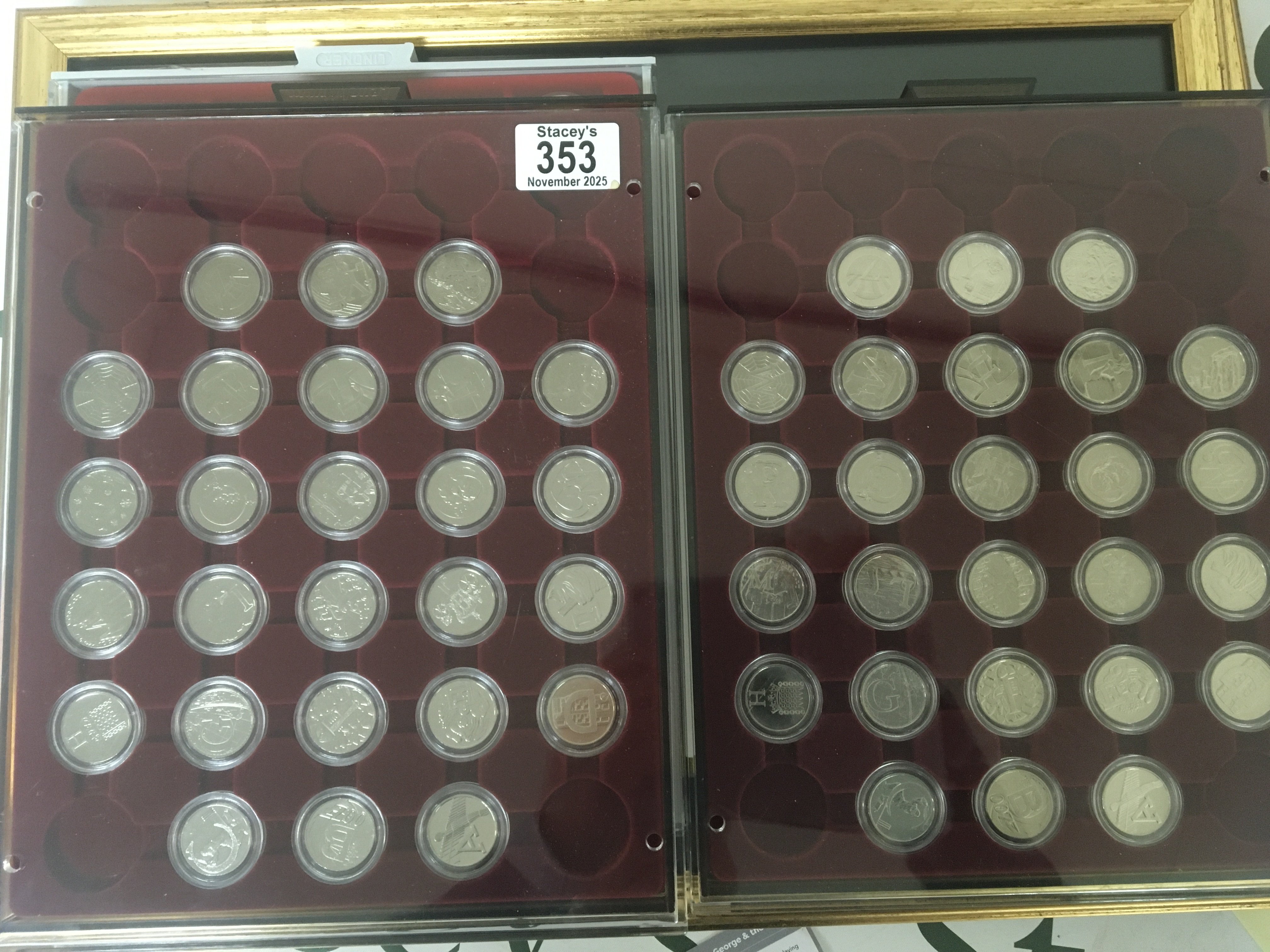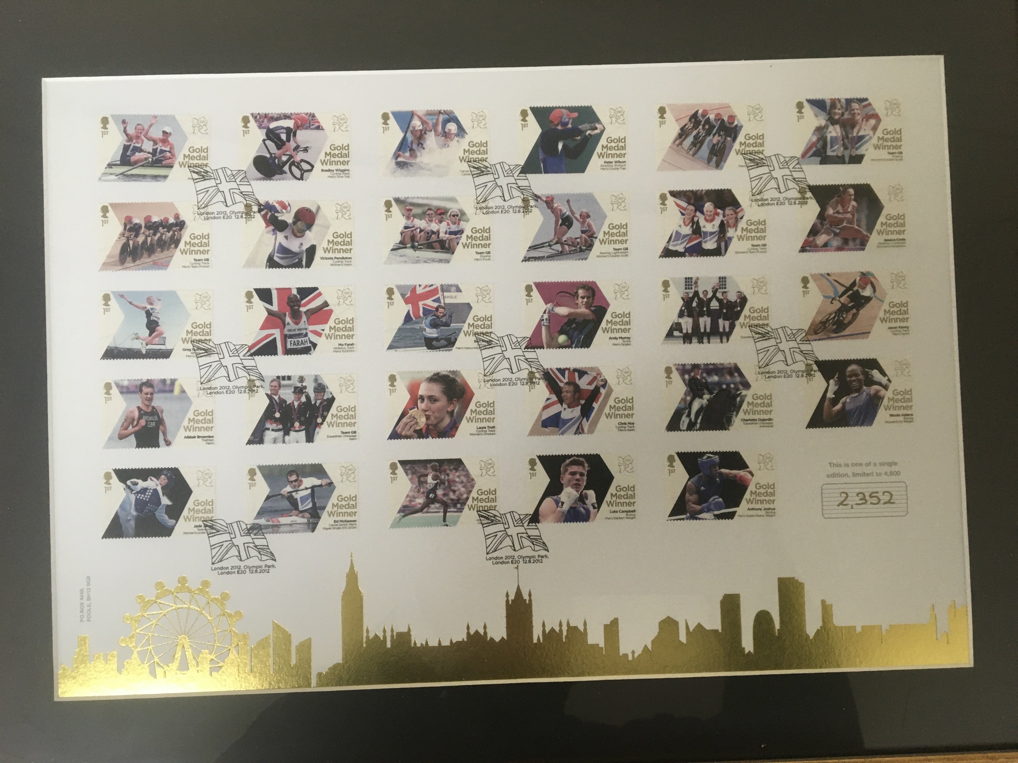 A collection of Olympic commemorative coinage Team GB road to Paris fifty pence London Olympic coins framed stamps and cases of other commemorative coins.