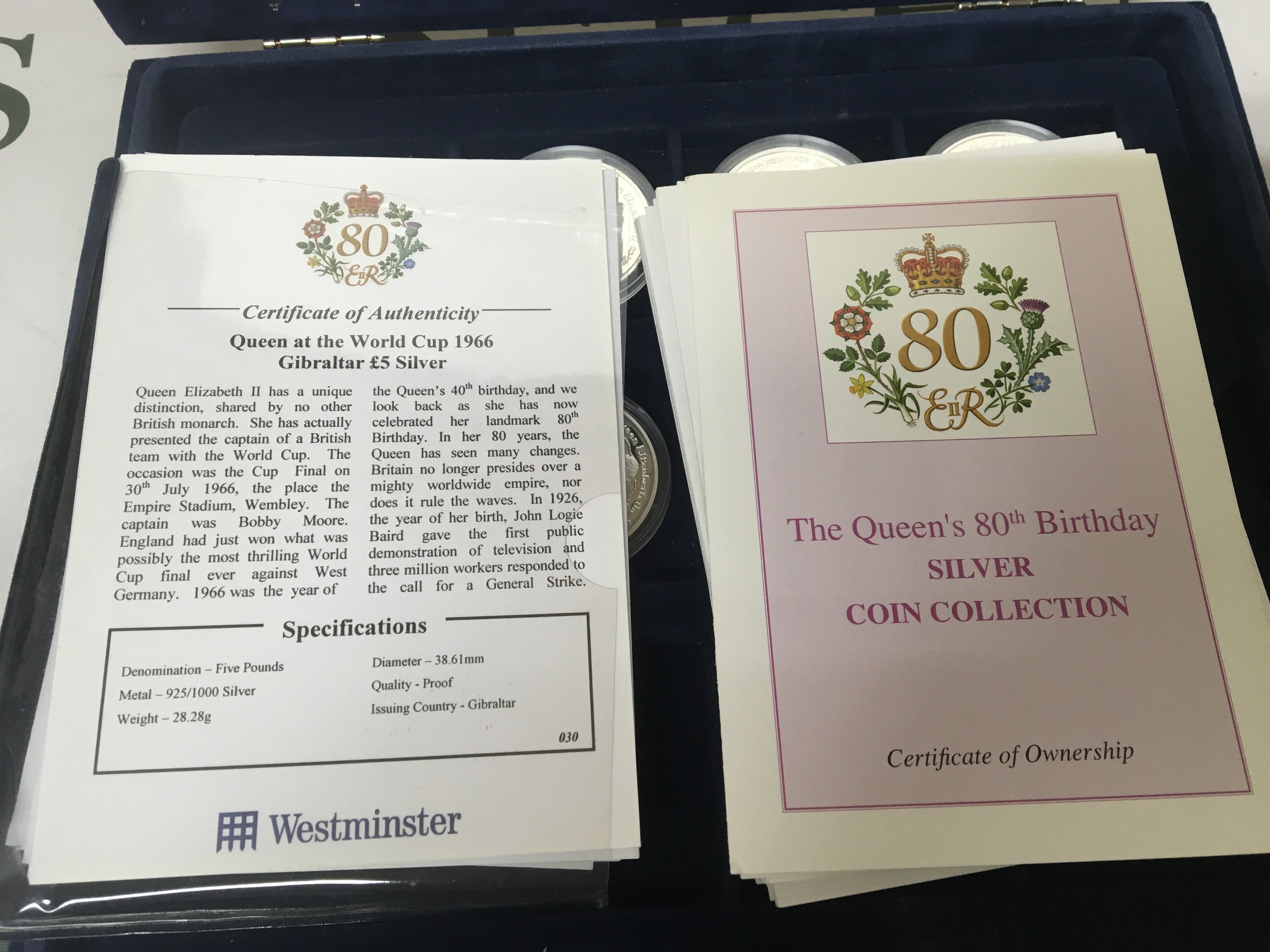 A collection of Silver proof Elizabeth II 80th Birthday collection twenty coins with certificate of authenticity in a fitted box.