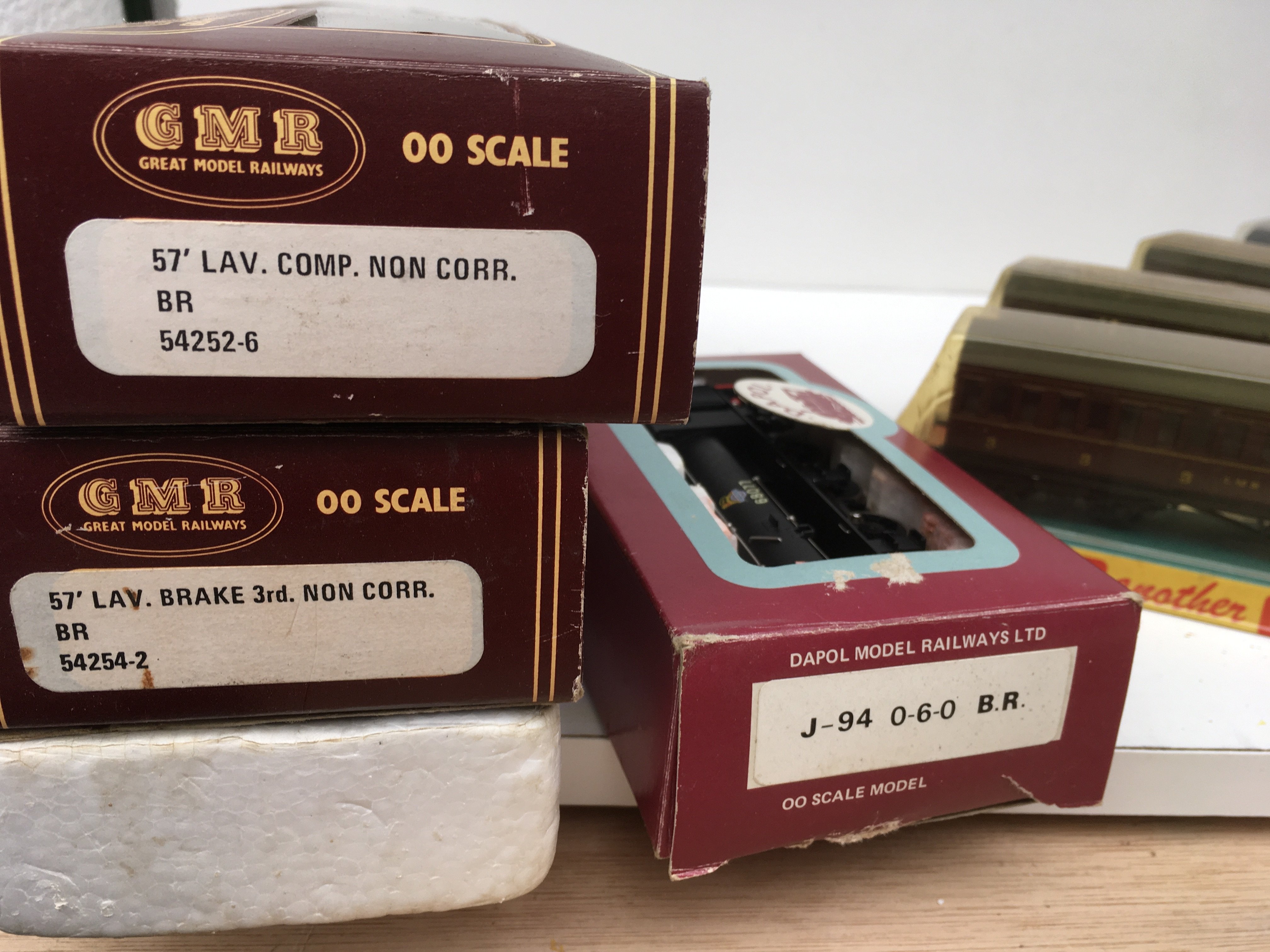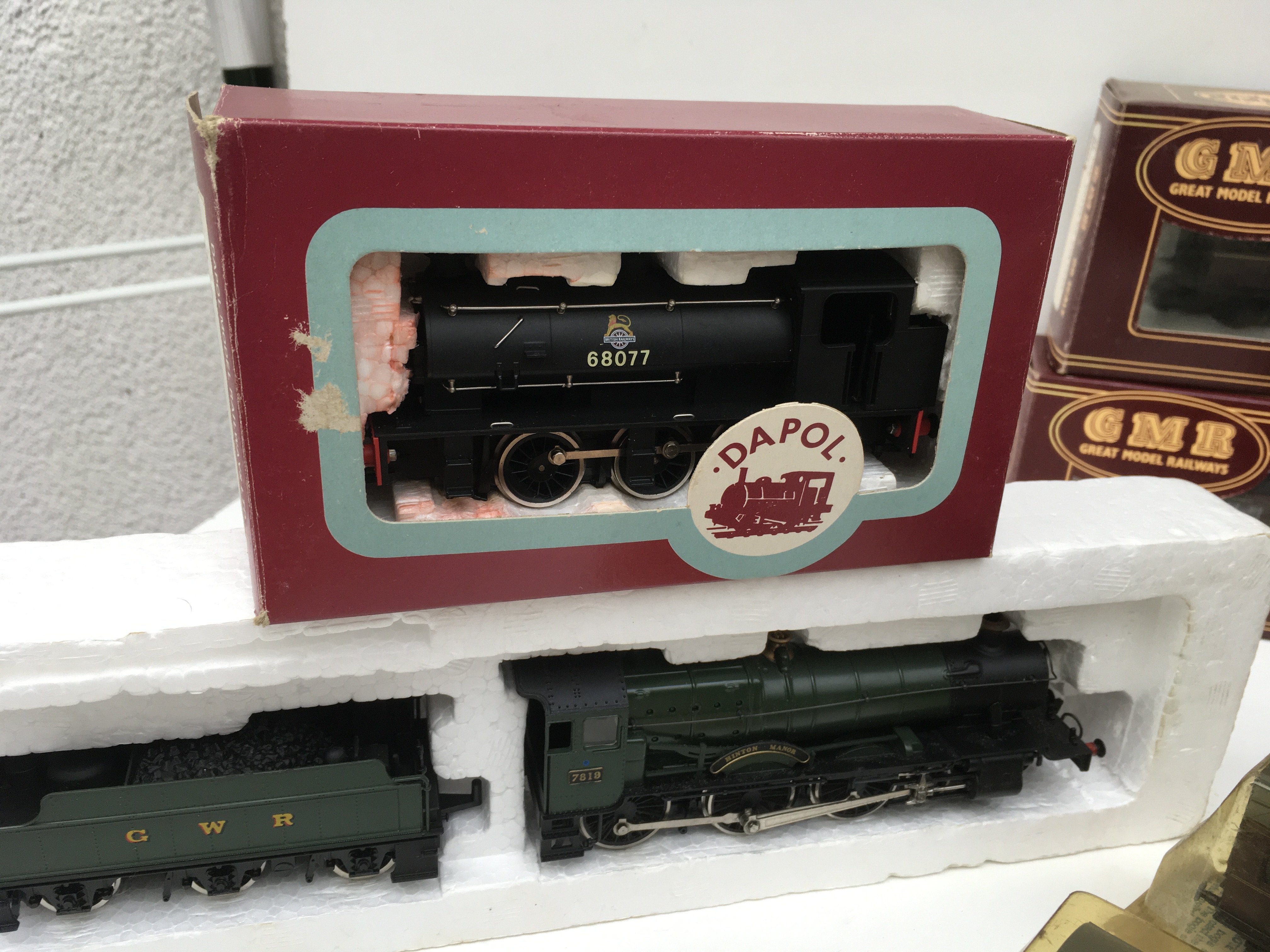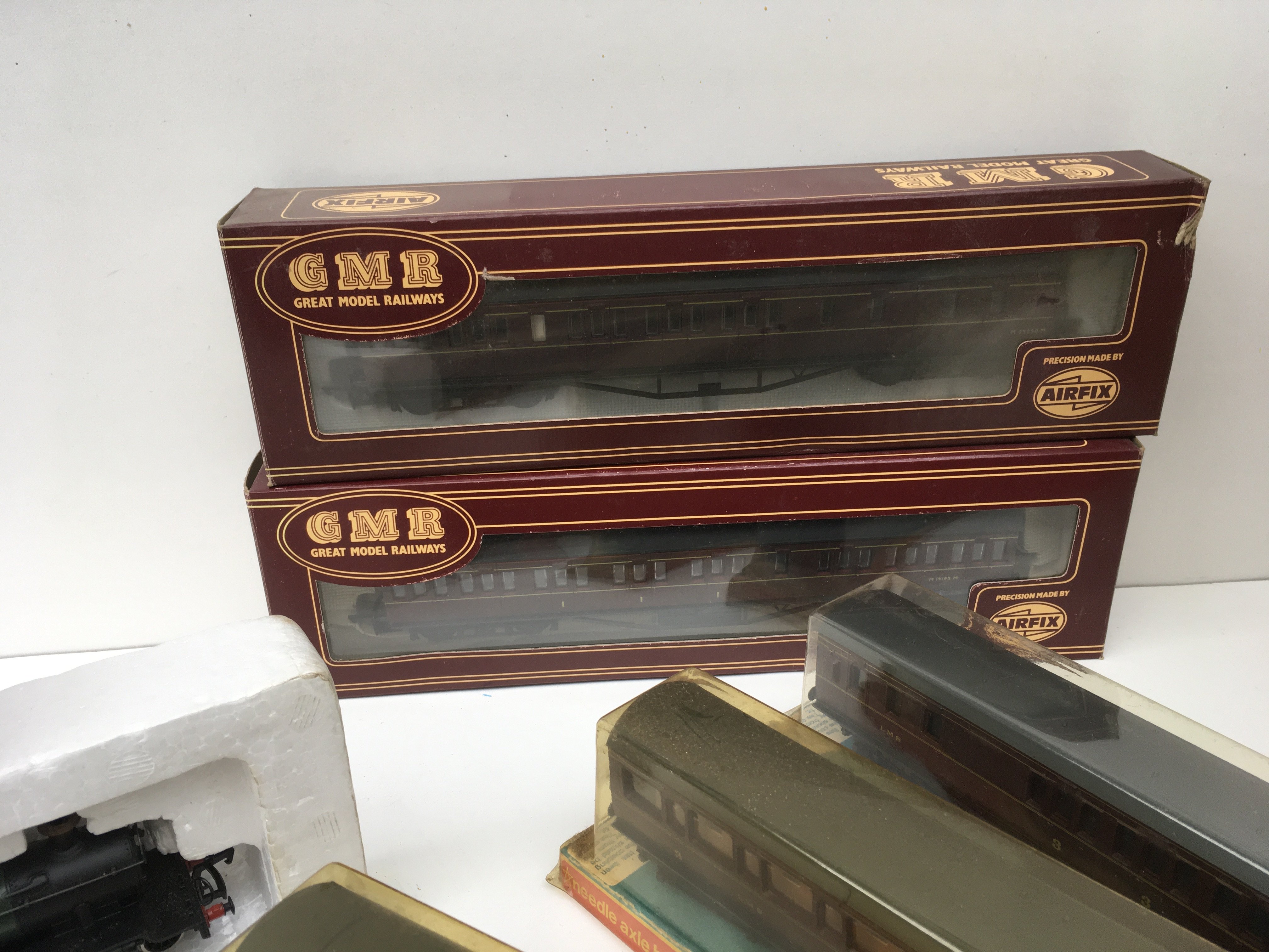 A collection of OO and HO model railway pieces comprising 2x locomotives by Mainline and Dapol plus 6x boxed coaches by GMR and GRAFAR. No reserve