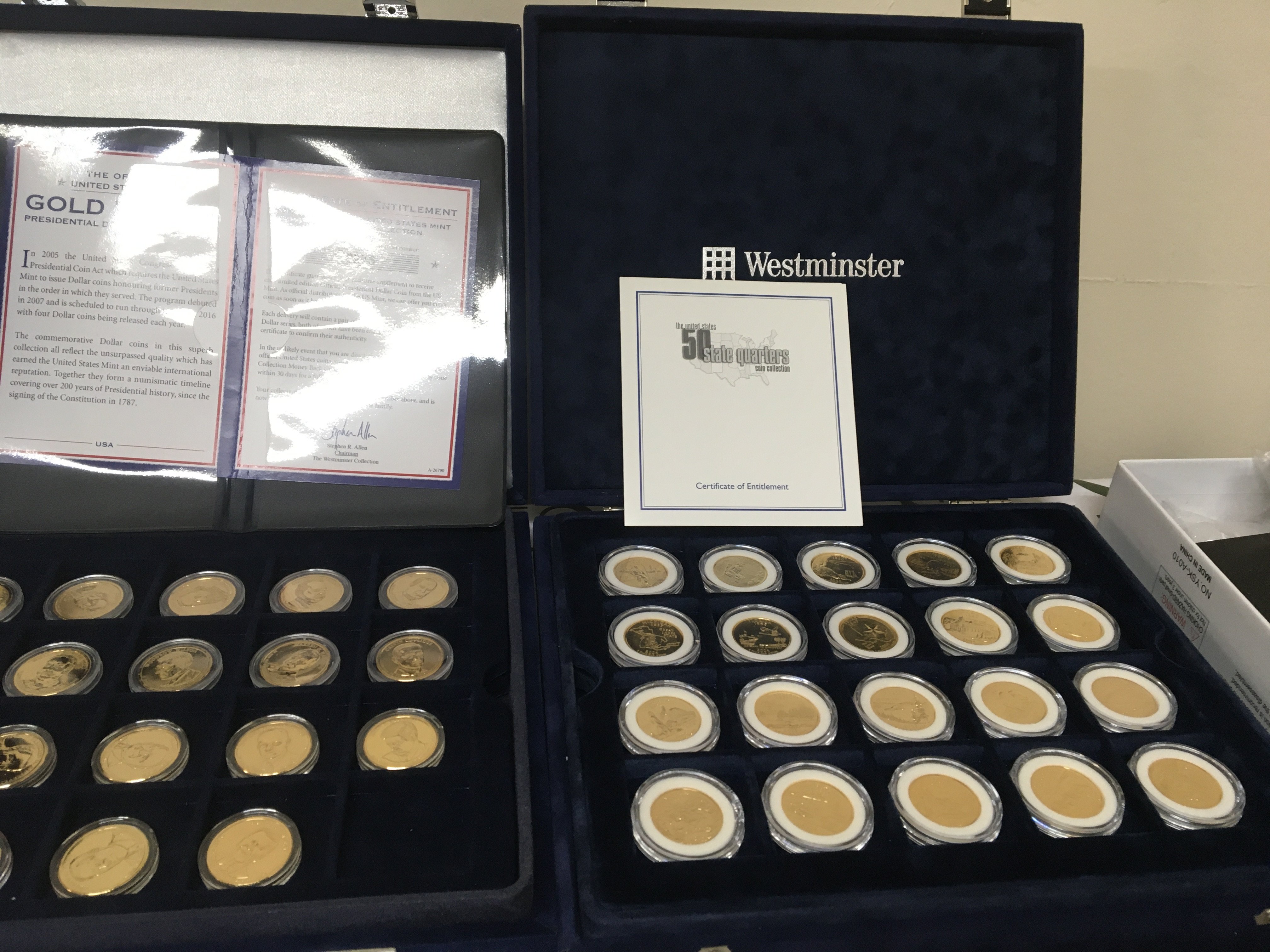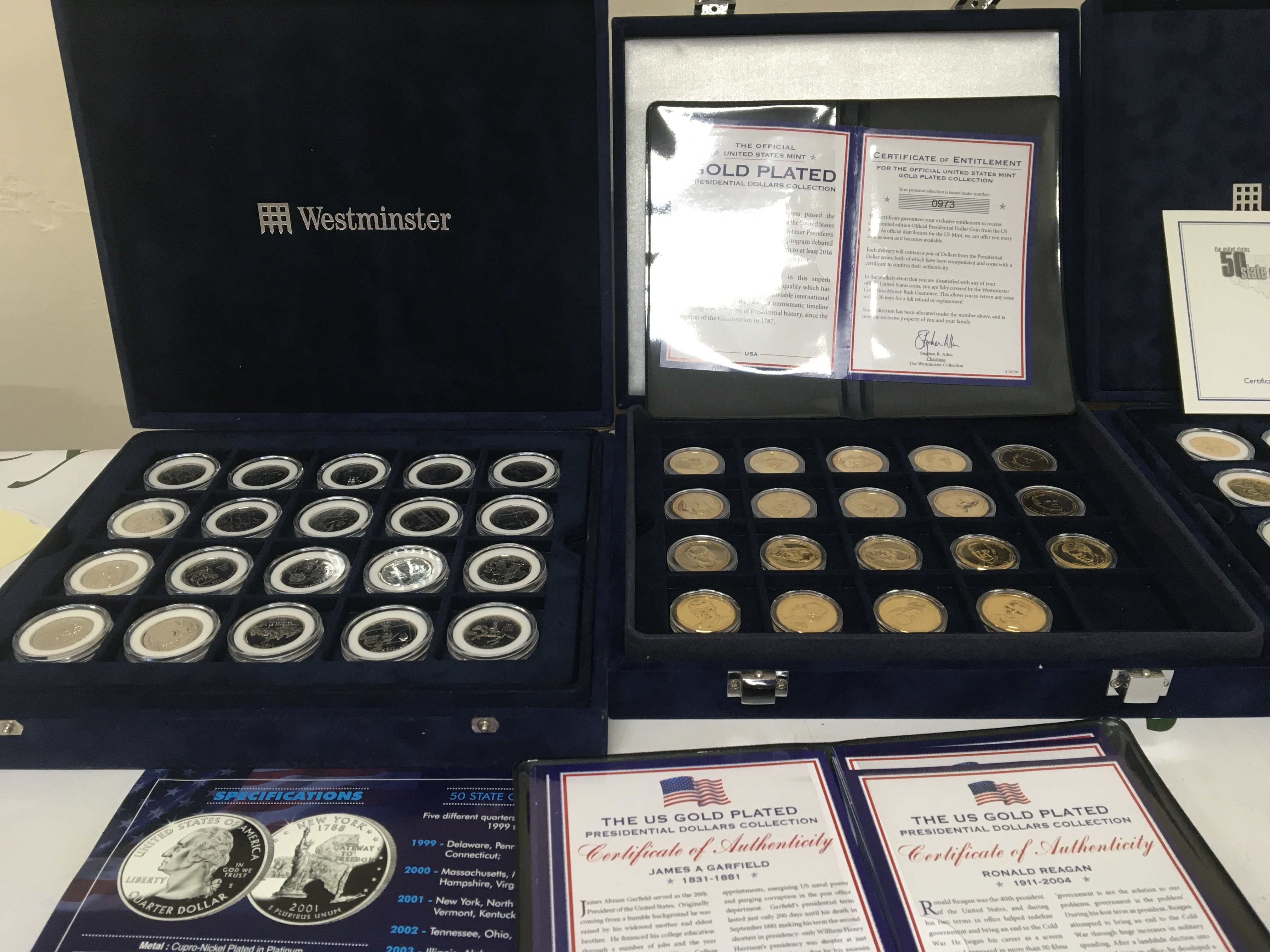 Three cased sets of American coins Platinum plated 50 state Quarter set Presidents Gold Plated Dollar set and one other gold plated 50 state Quarter sets. (3)