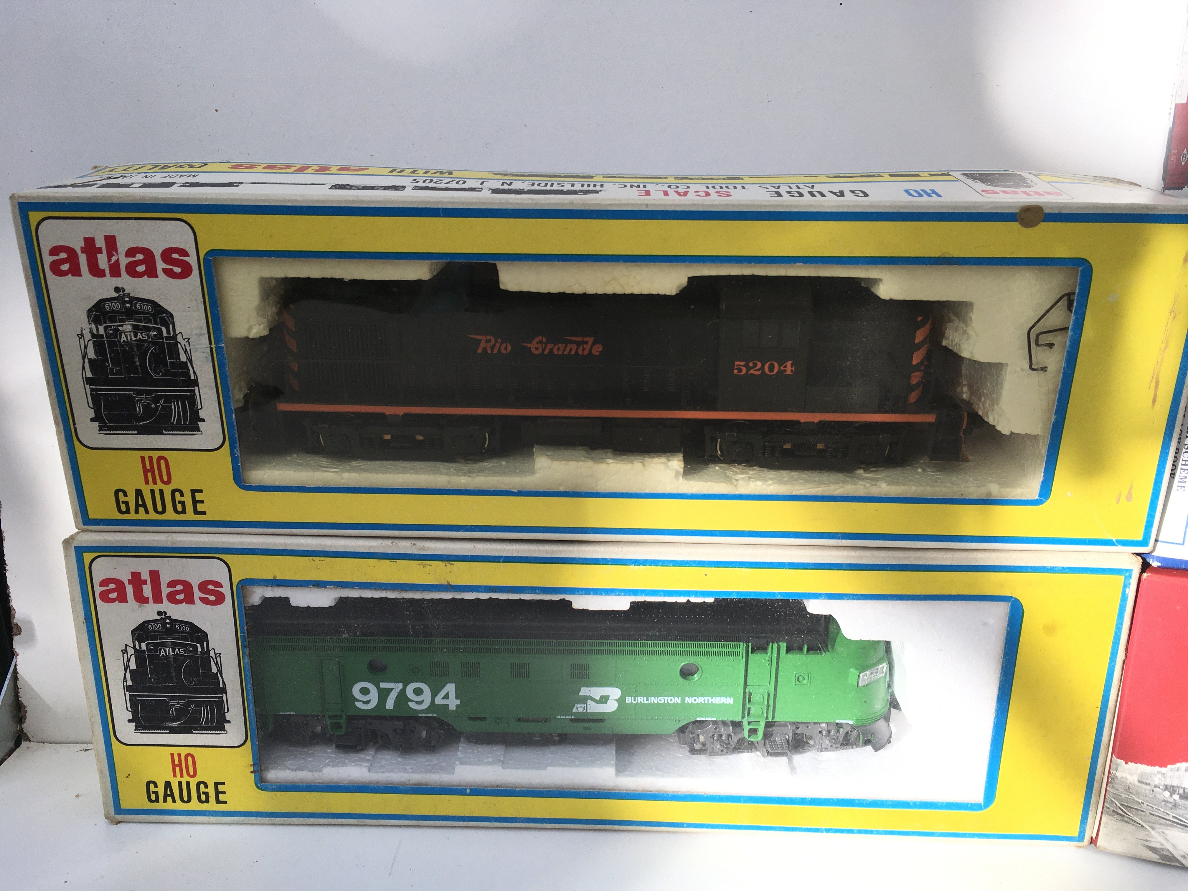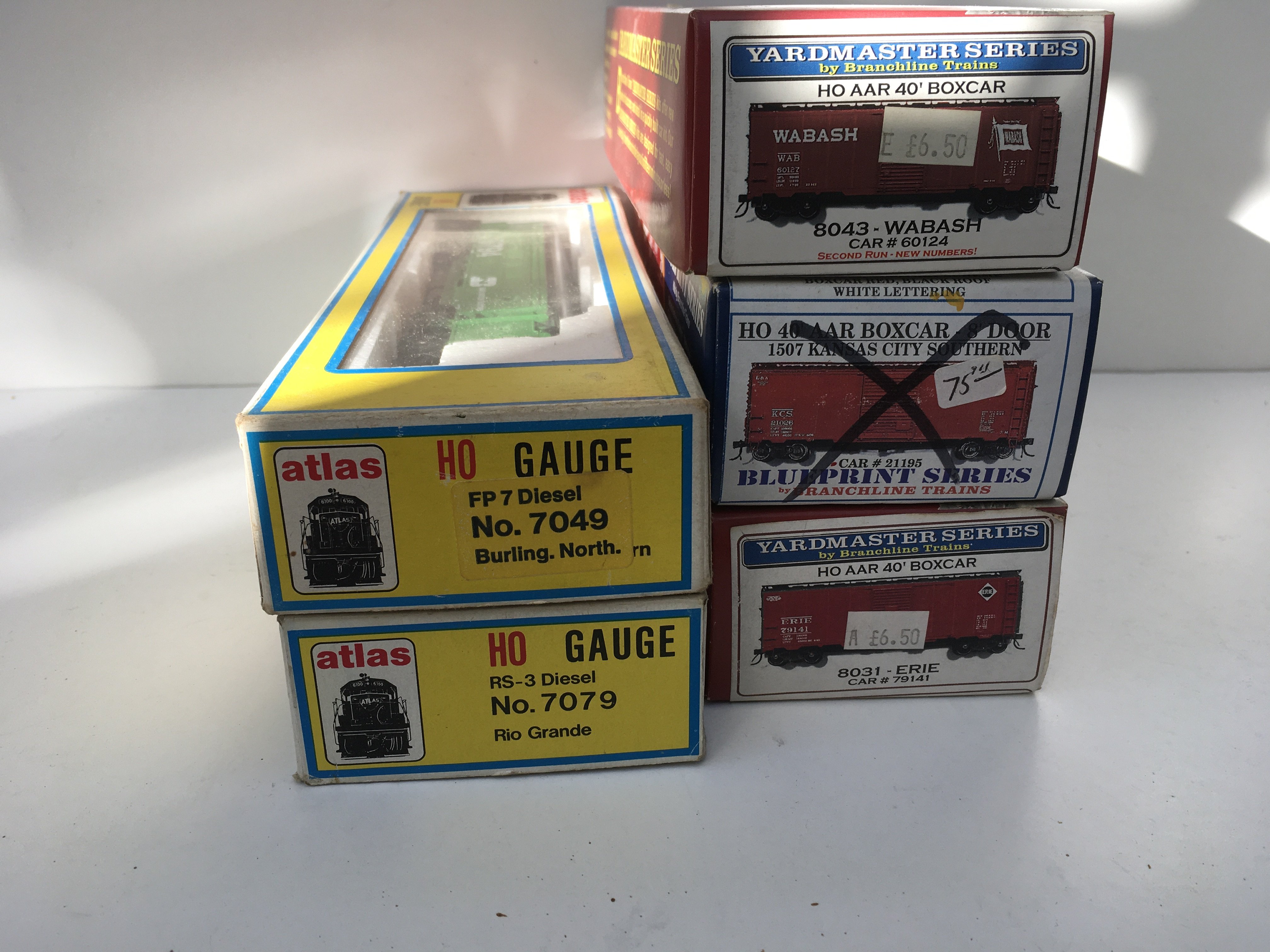 2x boxed HO gauge locomotives by atlas also includes 3x boxed box cars. No reserve