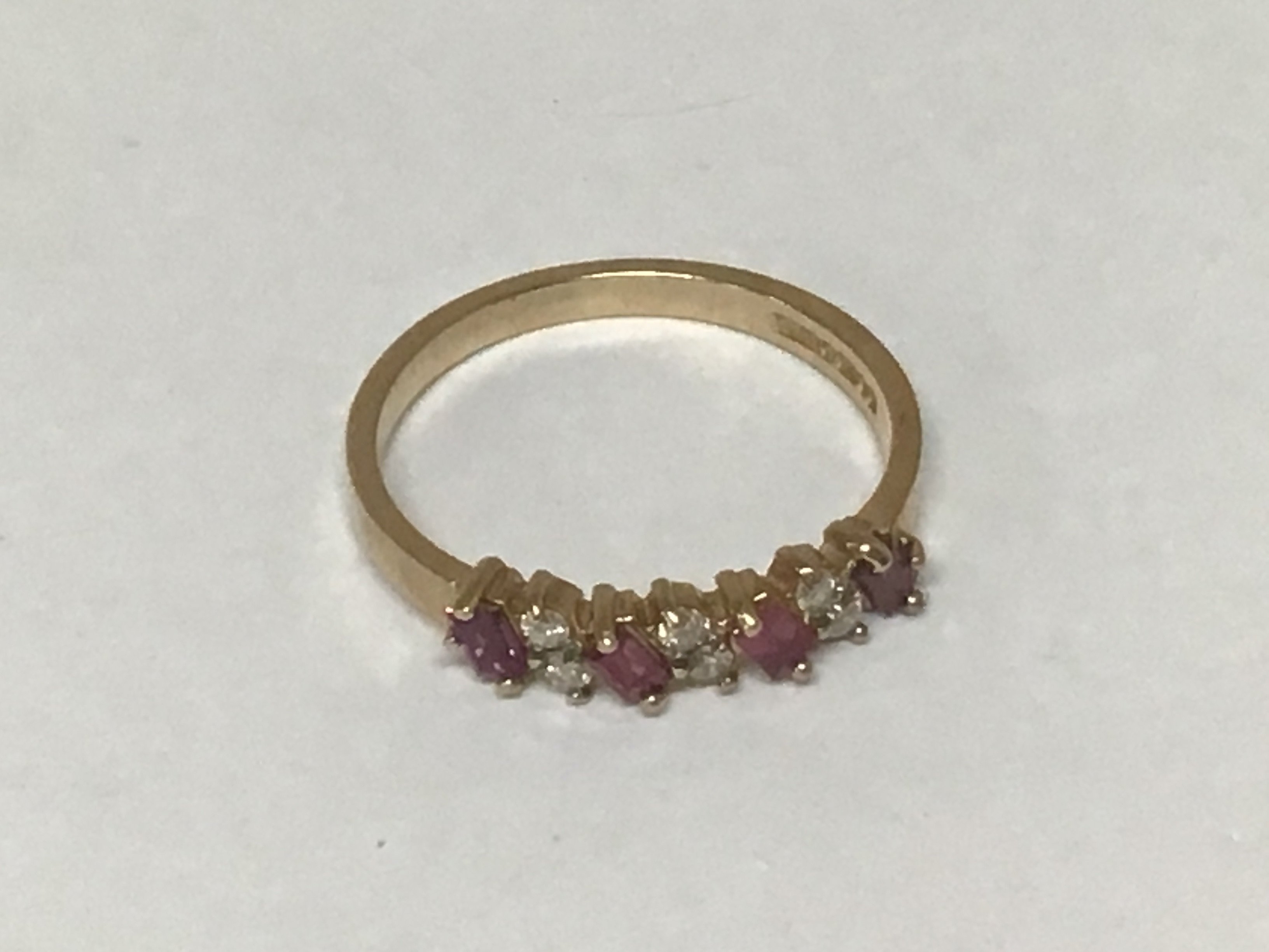 A 9carat gold ring set with alternating rows of baguette ruby and small brilliant cut diamonds.ring size P weight 2g
