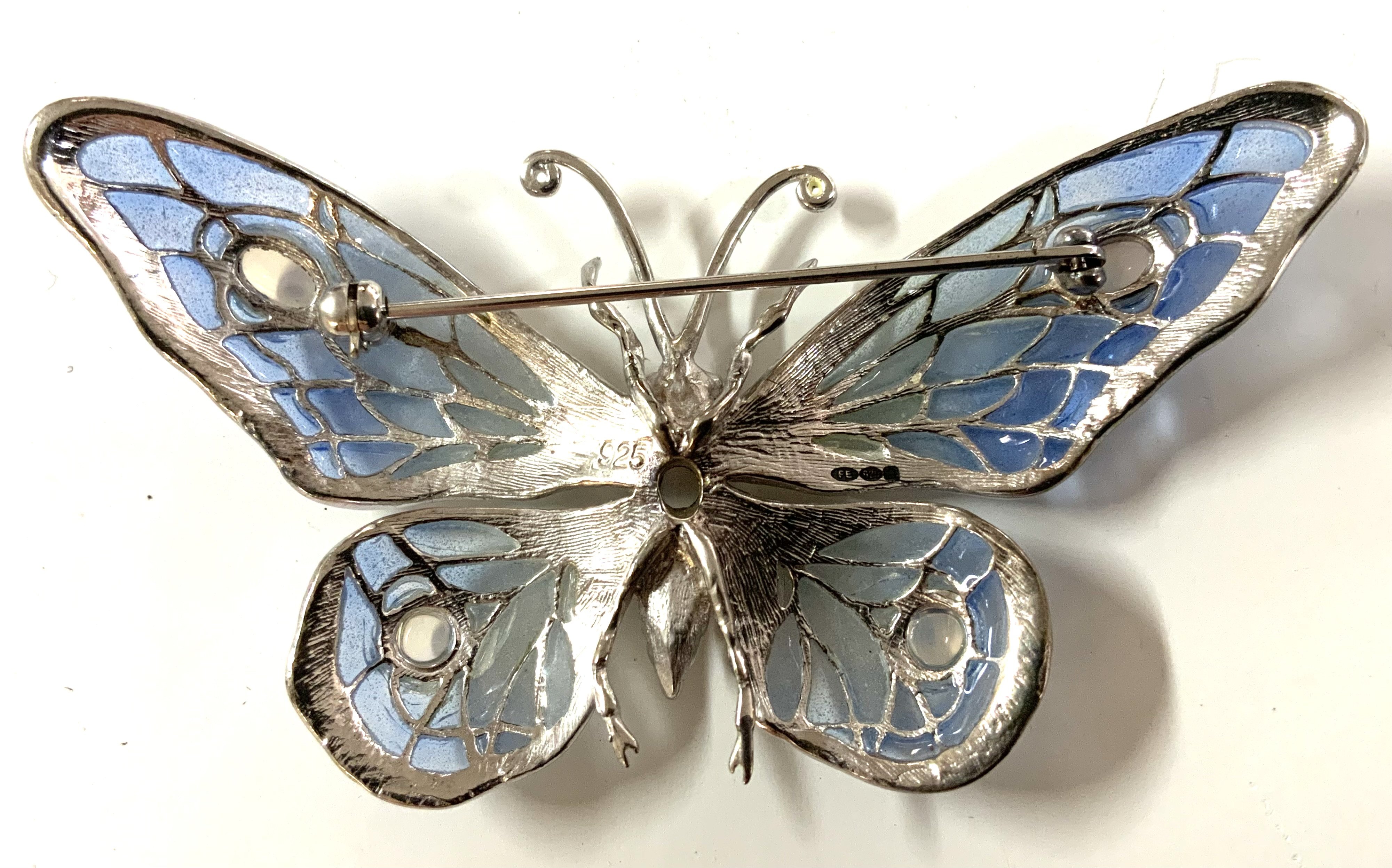 A sterling silver butterfly brooch set with moonstone and pliqe au jour enamel.