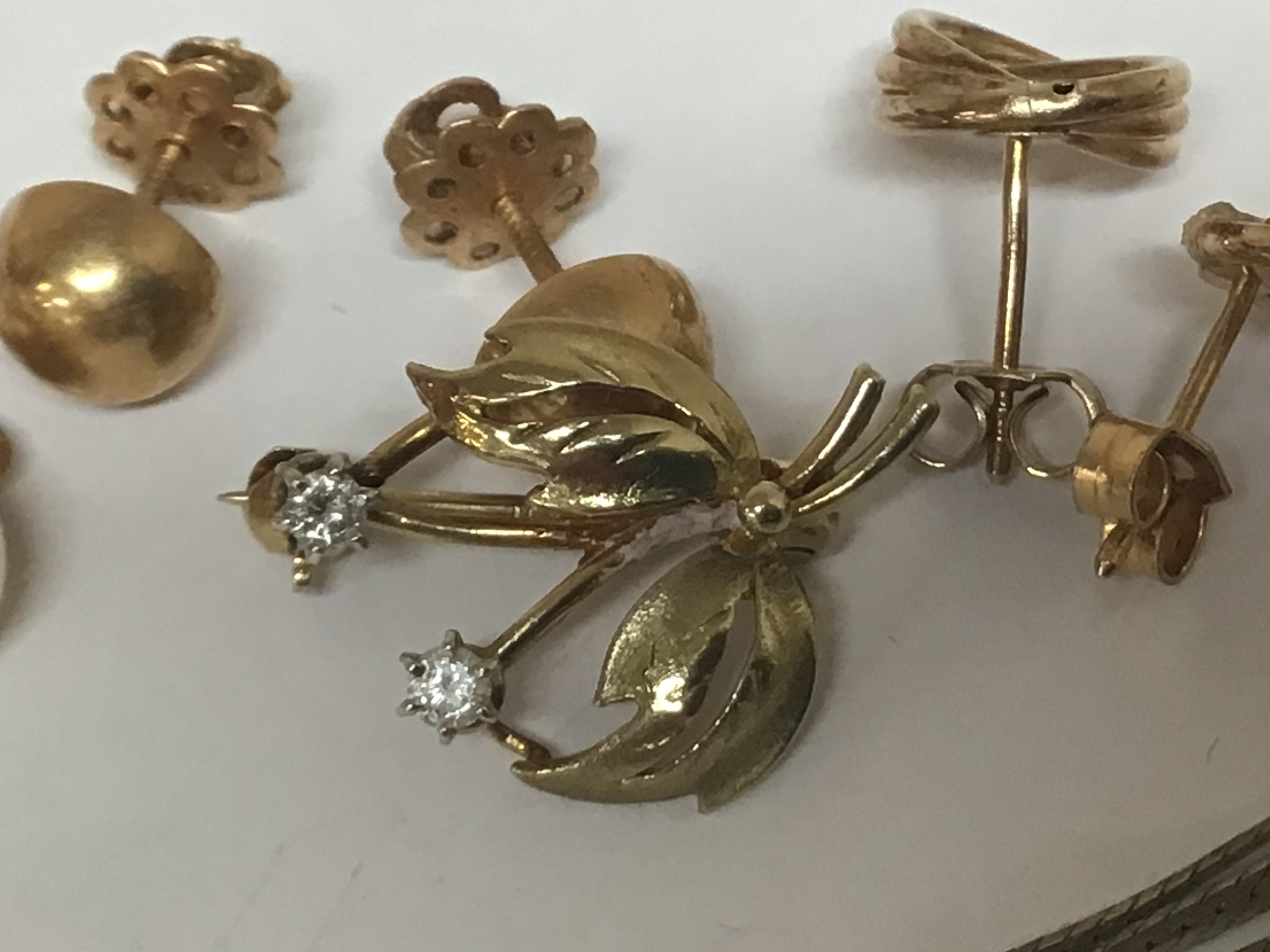 A gold brooch of floral design set with two small diamonds pearl earrings and other gold earrings.