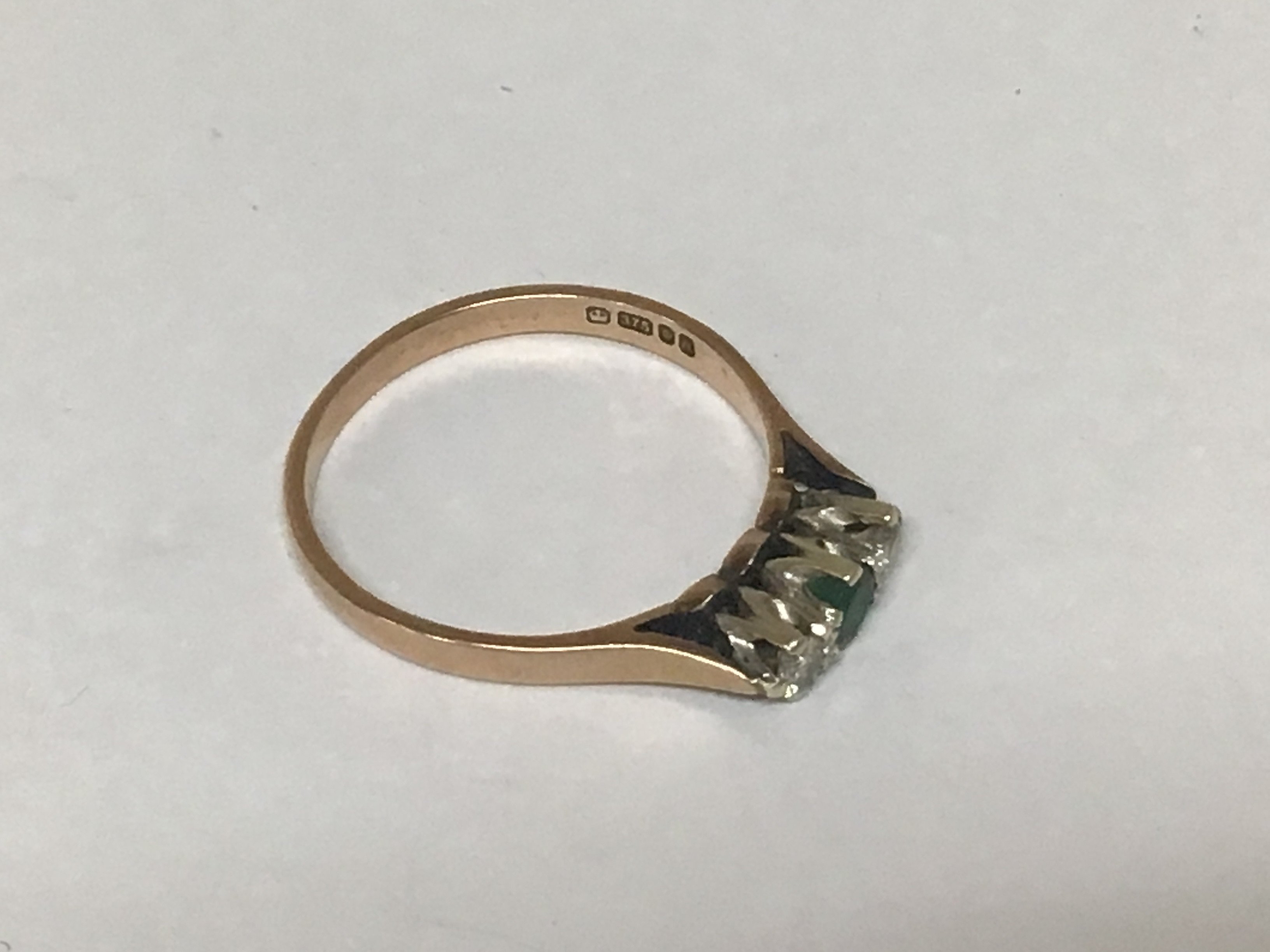 A 9carat gold ring set with an emerald flanked by chip diamonds weight 1.8g