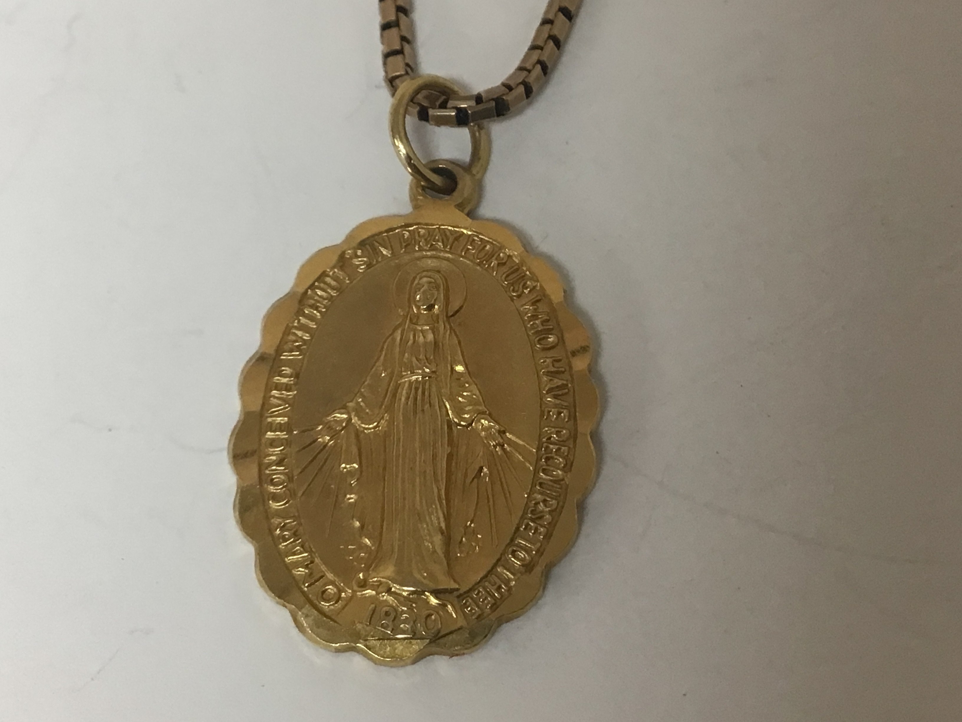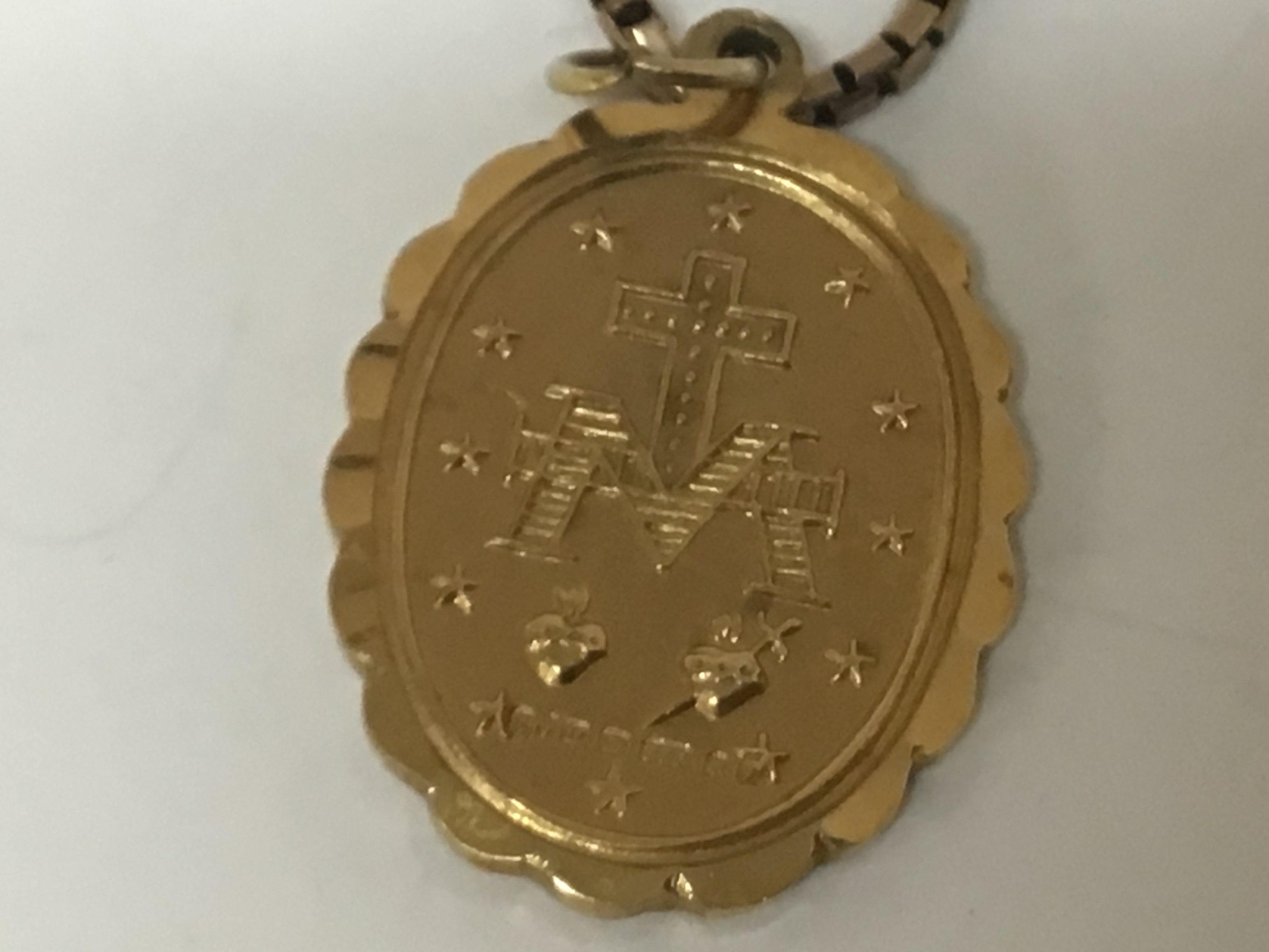 A 9carat gold religious themed pendent depicting the holly mother with attached 9ct gold chain weight 8g
